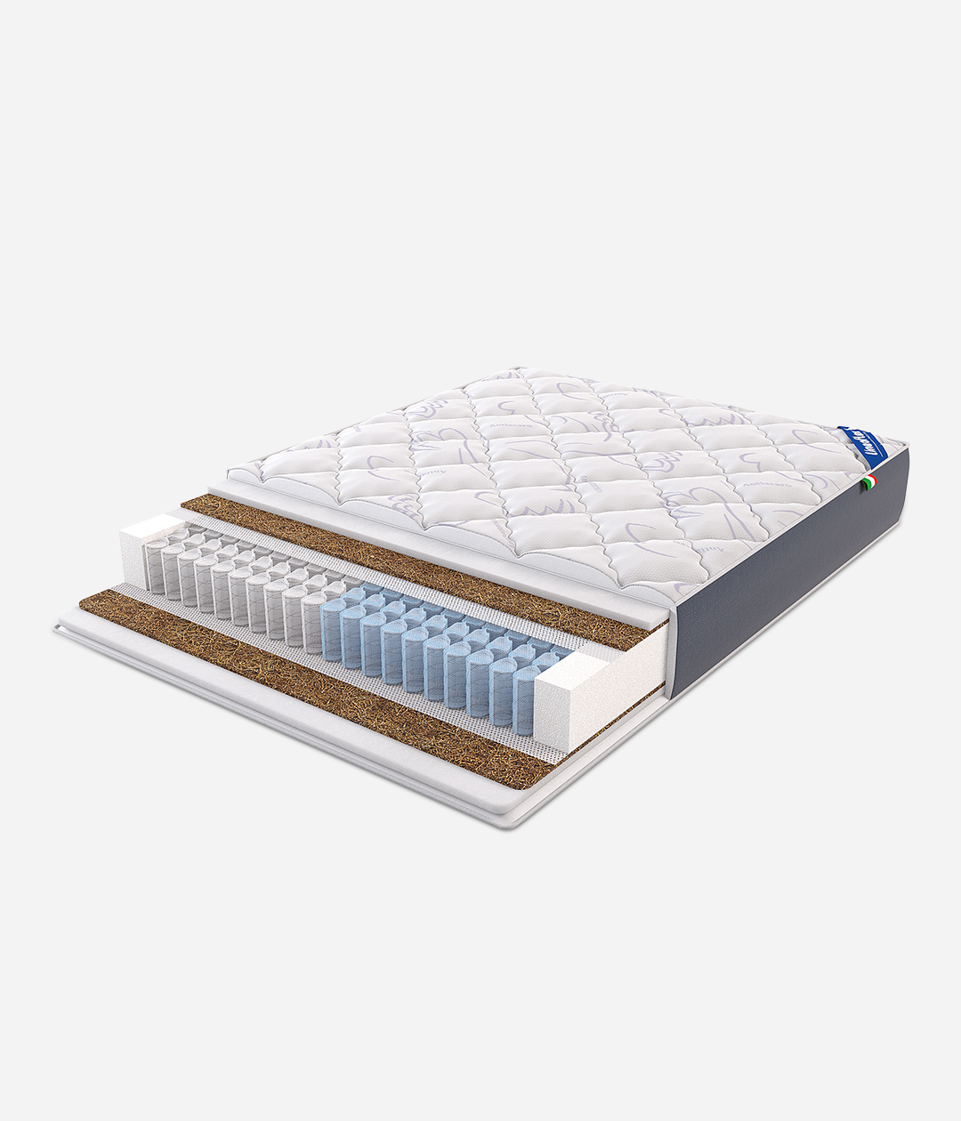 В качестве наполнителей применяется сочетание высокоэластичной пены Эргофлекс и натуральной кокосовой койры. Структура Эргофлекса состоит из небольших открытых ячеек, что обеспечивает равномерное распределение нагрузки по всей поверхности матраса, умеренную мягкость и высокий комфорт. Слои кокоса увеличивают жесткость матраса. Прочное кокосовое волокно пропитано натуральным латексом, чтобы получить требуемую упругость и устойчивость к нагрузкам. К тому же, этот материал обладает уникальным сочетанием свойств: влагостойкость, воздухопроницаемость и гипоаллергенность.