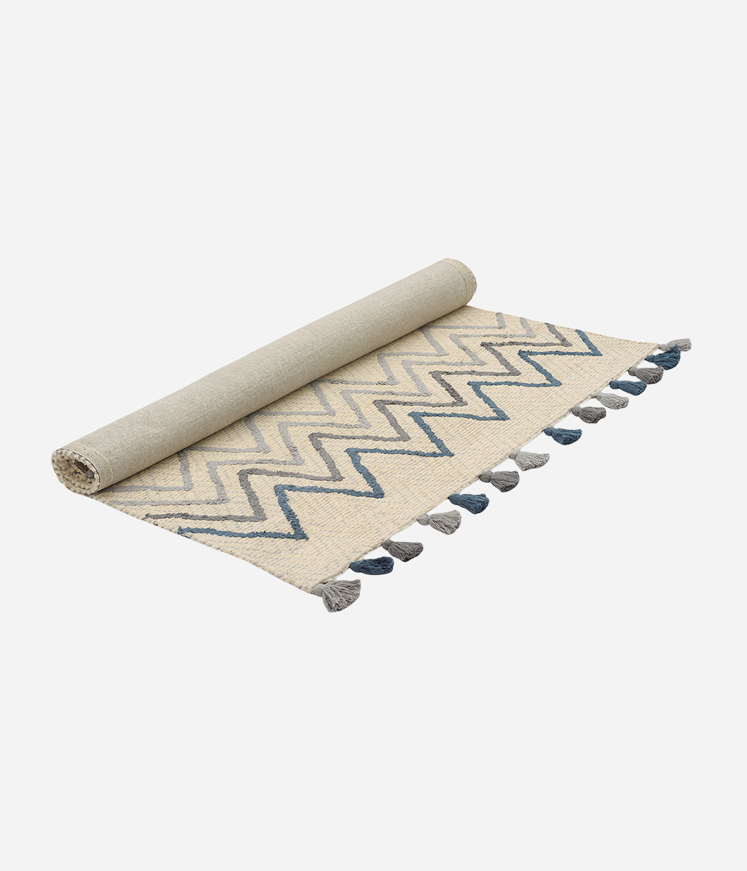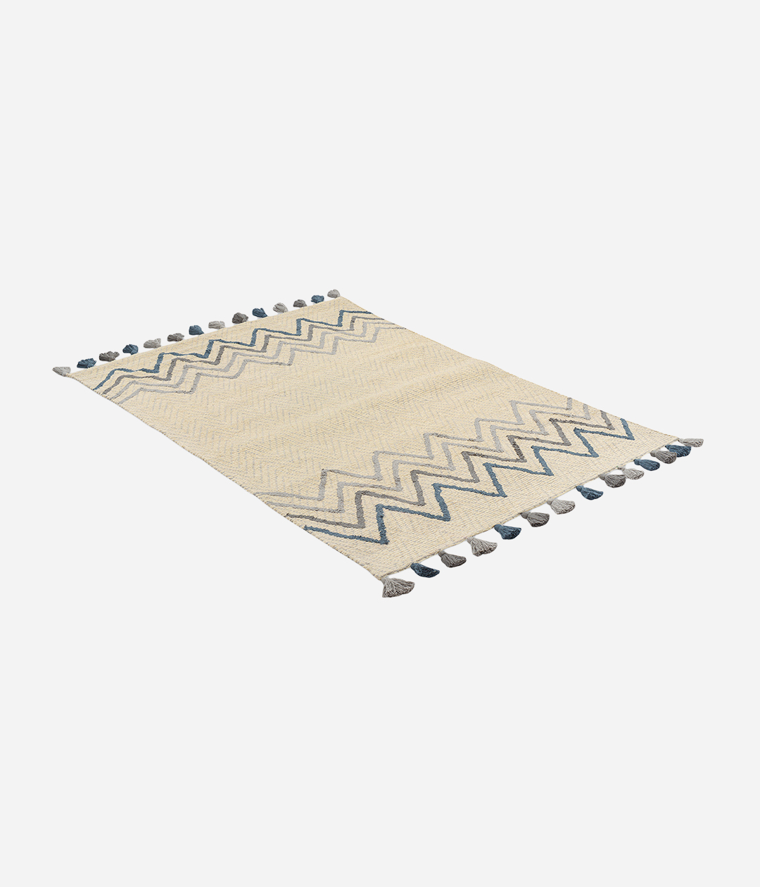 Ковер из хлопка Agra из коллекции Ethnic впишется в любой современный интерьер. Модель украшена кисточками в серо-синей гамме по коротким сторонам