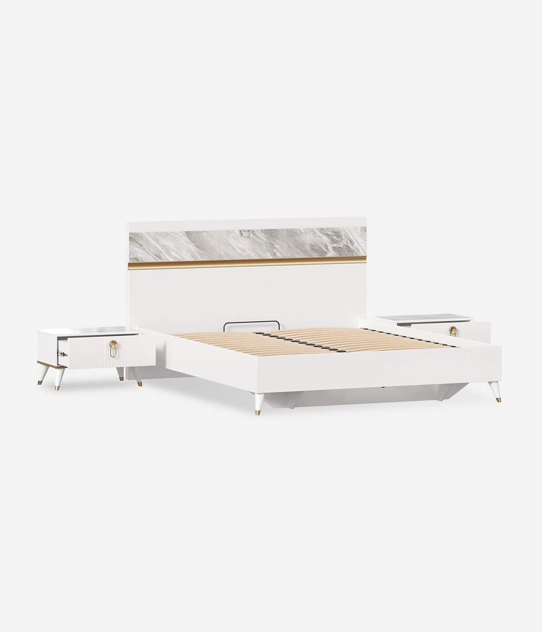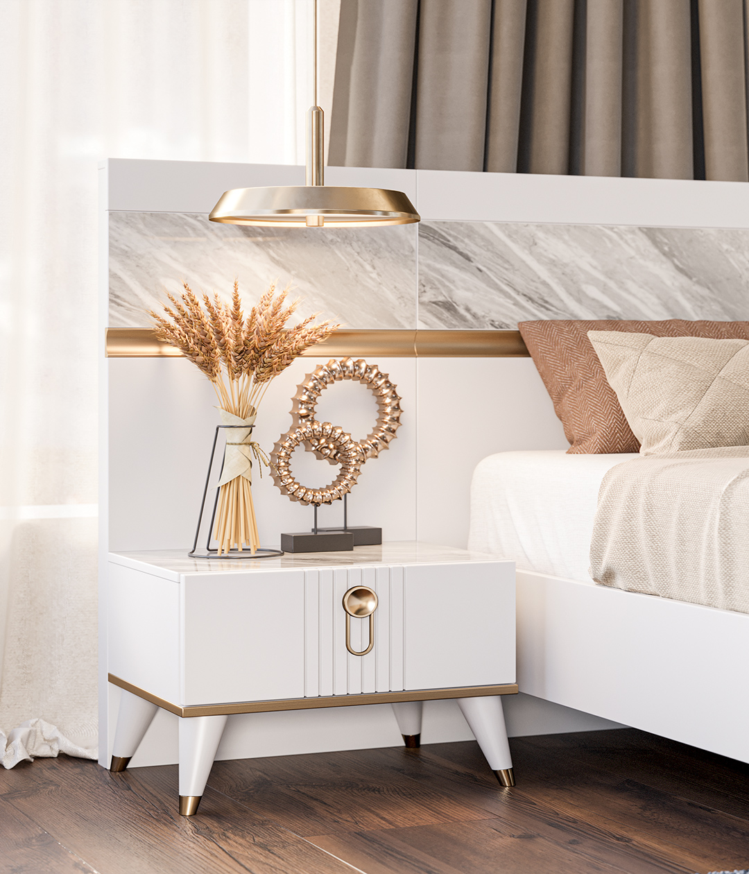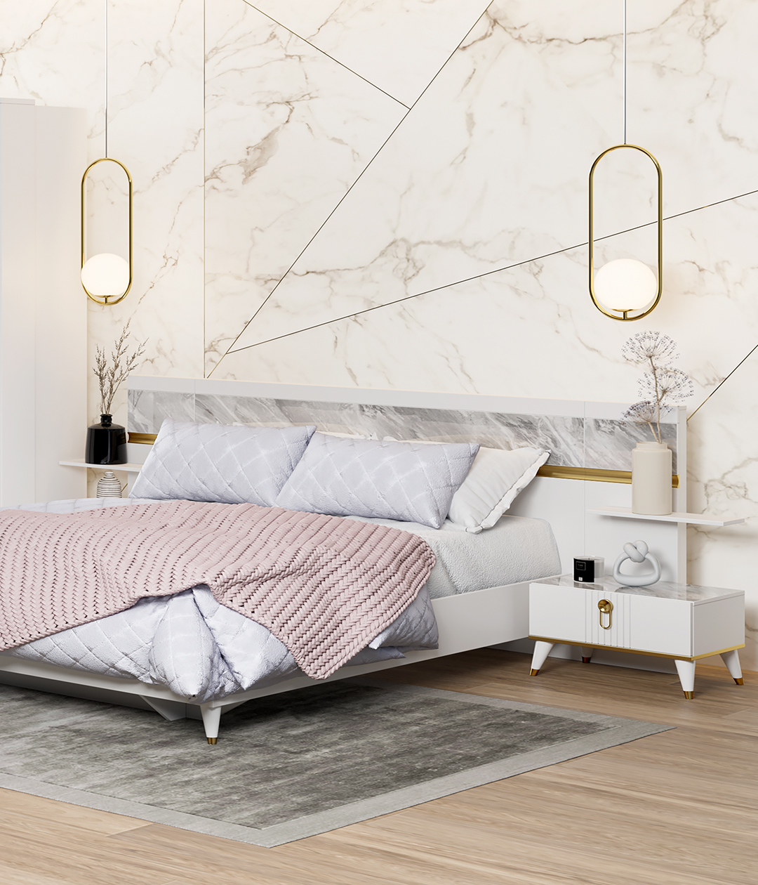 Мебель для спальни «Айла» — настоящее произведение искусства в Вашей спальне! Благодаря фасадам с фактурой «белого мрамора» коллекция выглядит благородно. Элементы под золото придают спальне восточный колорит. Корпус изготовлен из ЛДСП 16 мм - цвет «Белый». Фасады изготовлены из ЛДСП 16 мм цвет «Белый» и «Статуарио» - лак глянец.