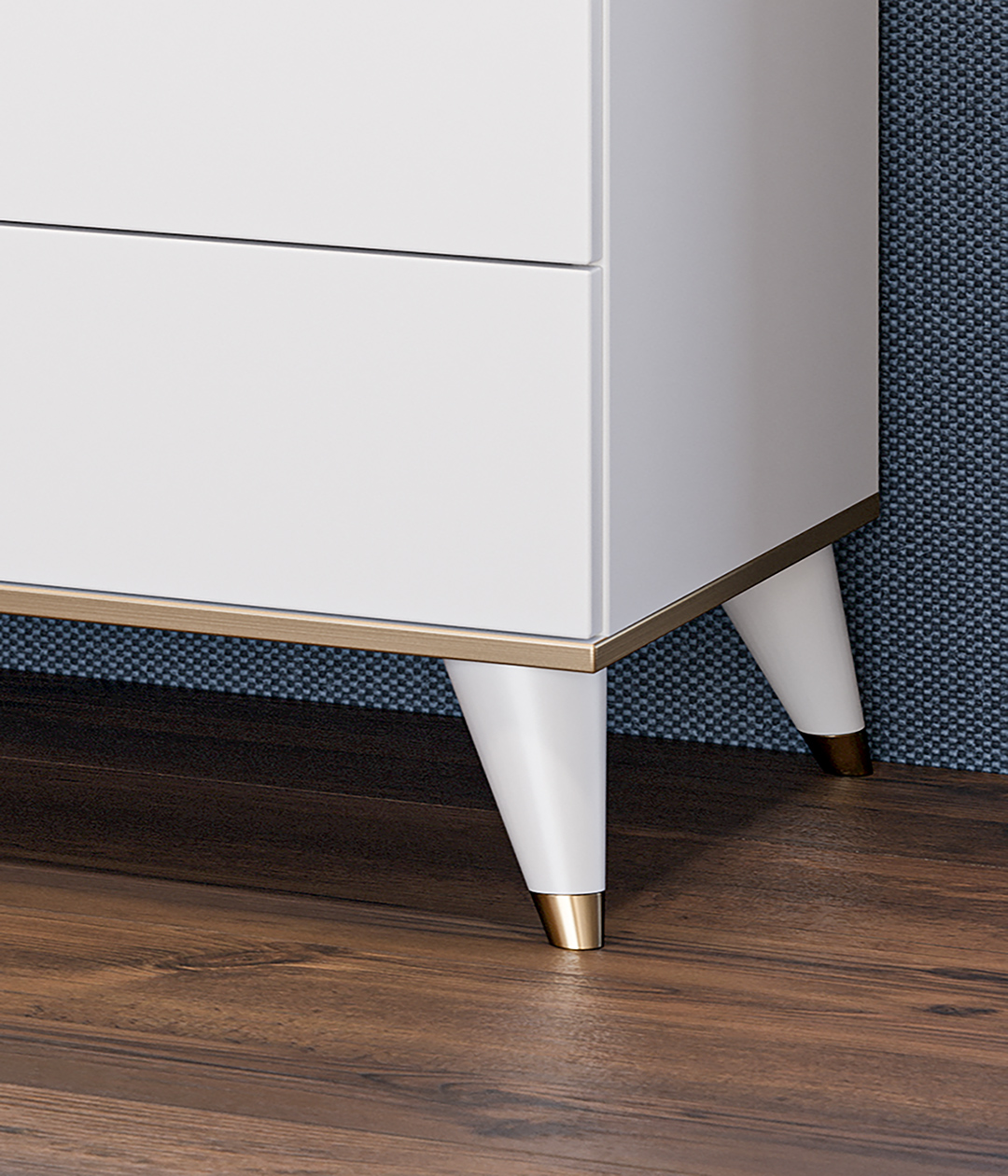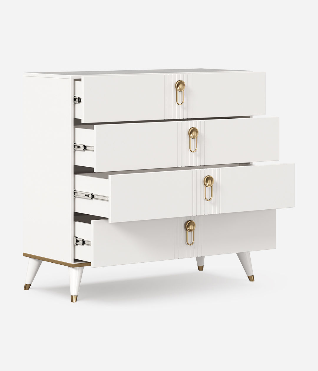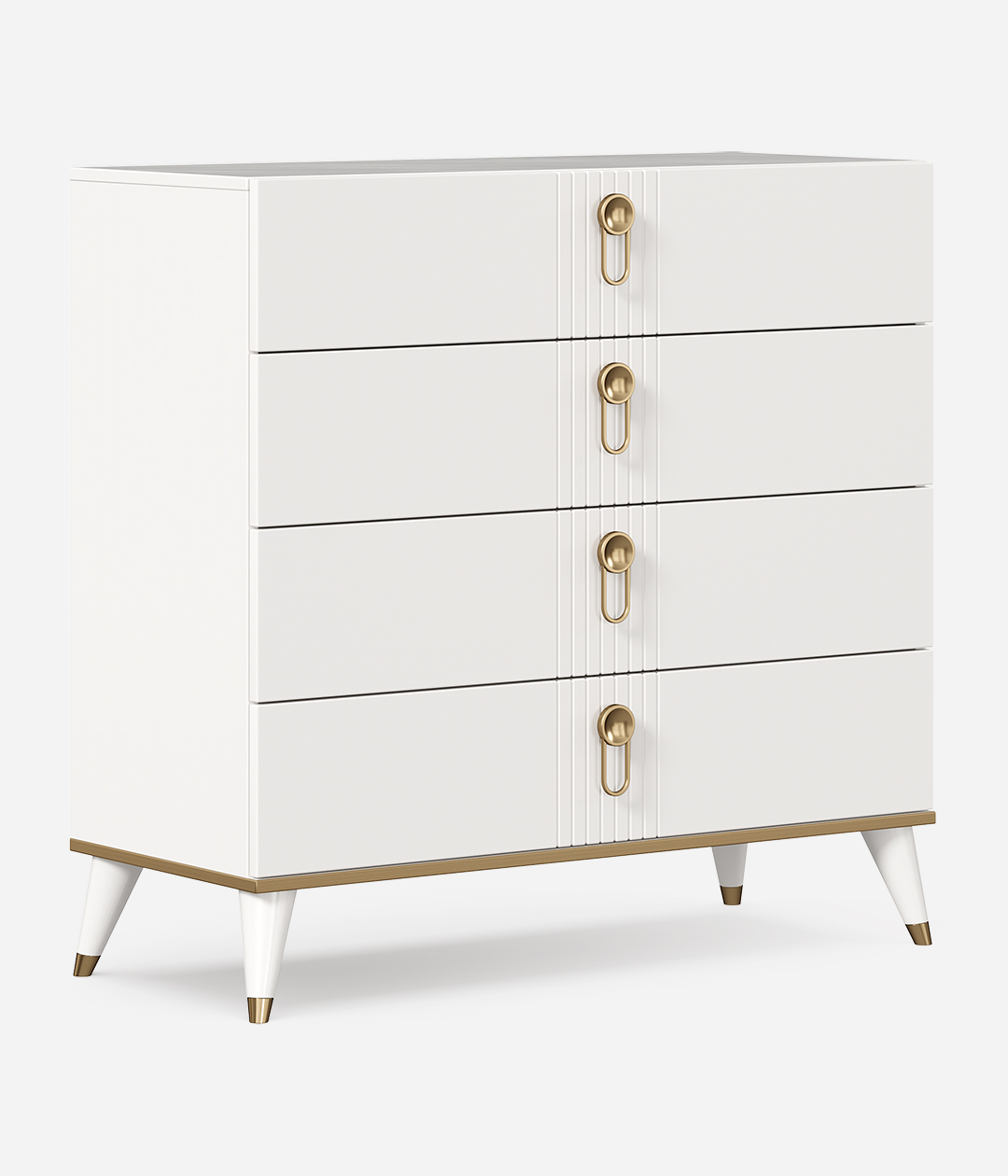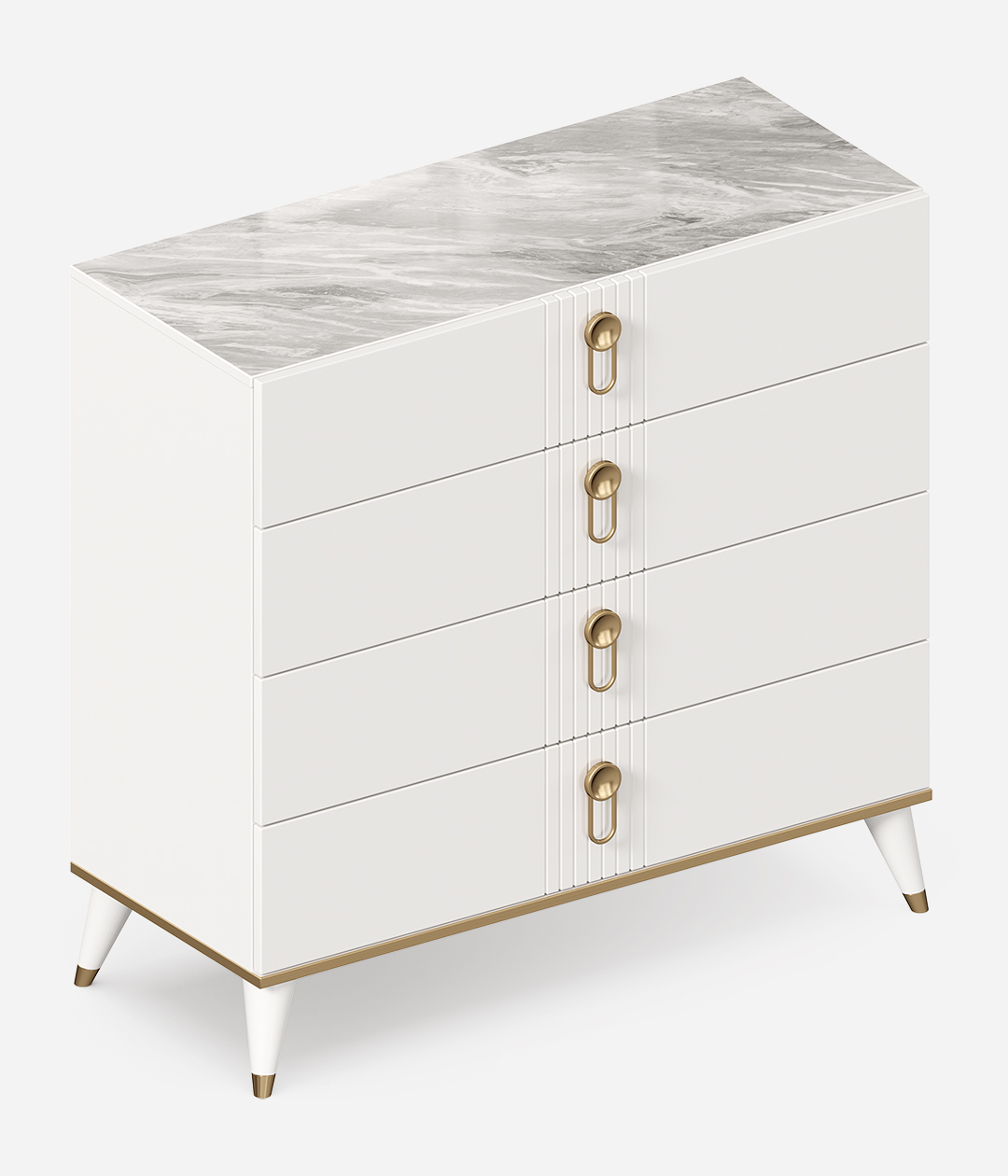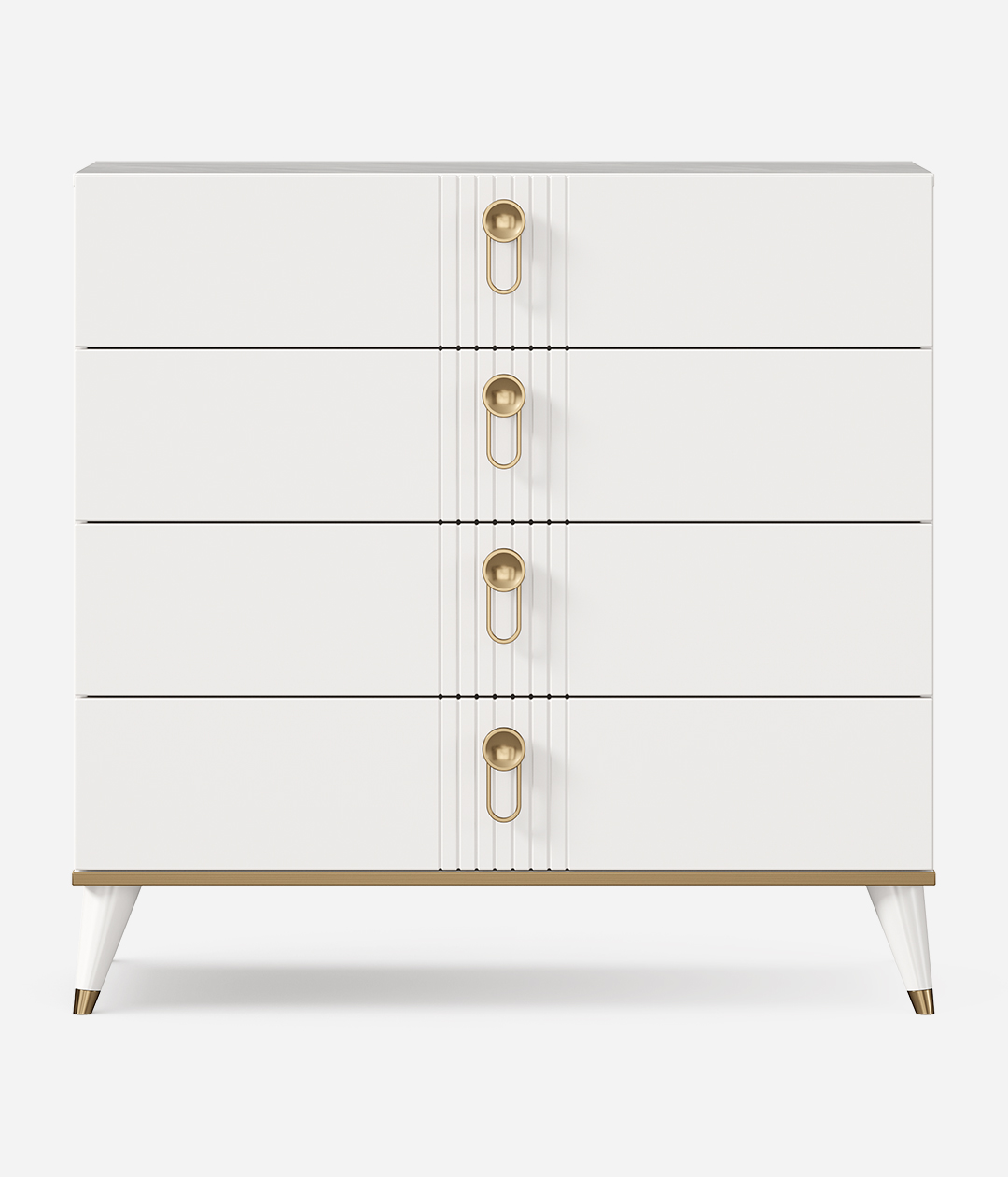 Комод «Айла» с ящиками подойдет для создания уникального интерьера в стиле эклектика. Вместительные четыре ящика помогут бережно хранить множество разных вещей. Крышка комода стилизована под мраморное покрытие. Фрезерованные фасады изящно сочетаются с металлической ручкой, ножки с золотой окантовкой завершают элегантный стиль модели.