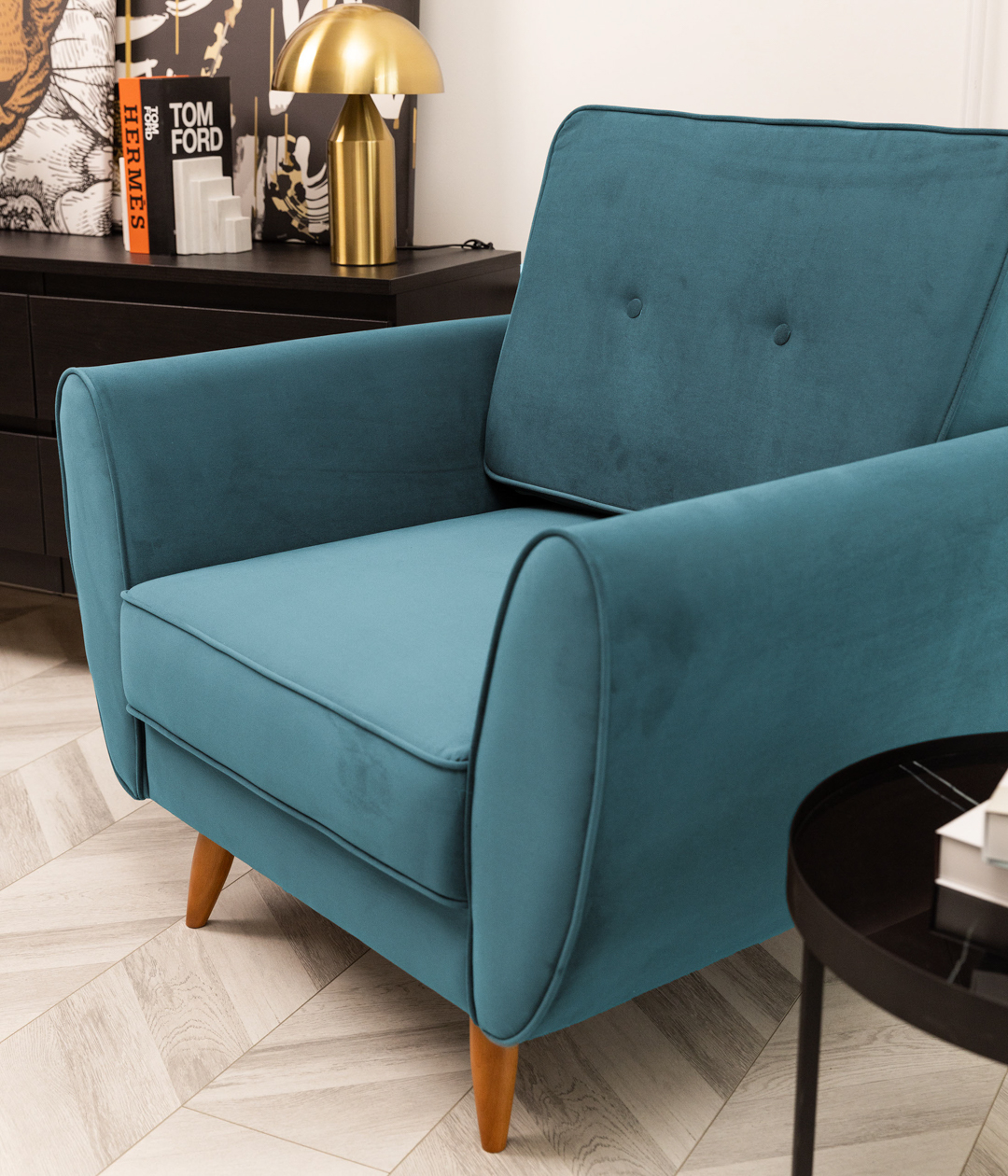 Кресло Бакай станет стильным акцентом вашего интерьера. Оригинальные подлокотники, расположенные по диагонали, придают изделию неповторимый вид, подчёркивая красоту природных материалов и легкость конструкции. Широкая палитра расцветок позволяет легко подобрать вариант под любой дизайн. Практичная обивка из велюра приятна на ощупь и удобна в уходе.