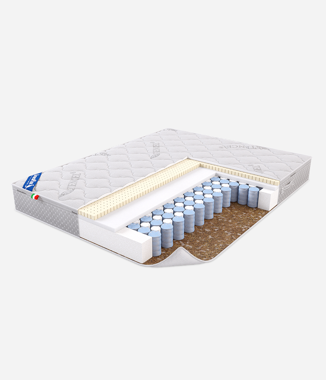 Основанием матраса выступает прочный и жесткий би кокос. В качестве наполнителей применяется сочетание натурального латекса и пены Эргофлекс. Латексная пена антиаллергенный, ультраэластичный материал с высокой несущей способностью. Этот материал является лидером в использовании материалов при создании матрацев высокого уровня анатомичности и одновременно долговечности.