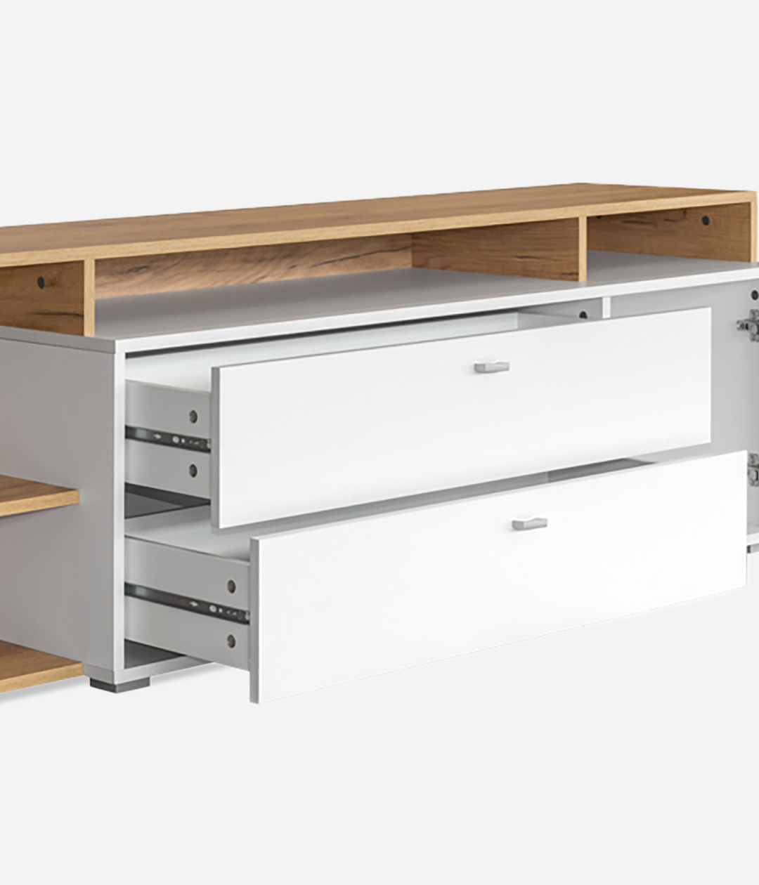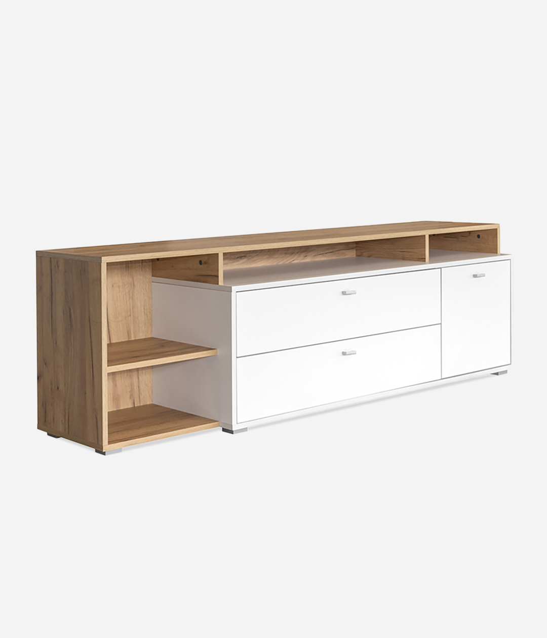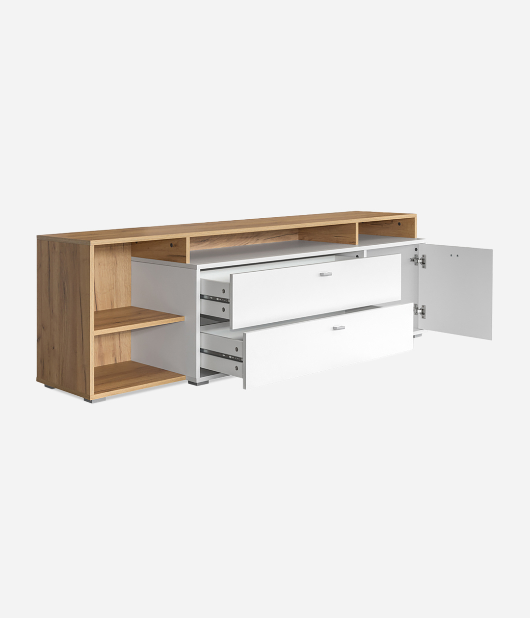 Стильная ТВ-тумба Бэль прекрасно дополнит обстановку гостиной. Модель оснащена двумя выдвижными ящиками, отделением за распашной дверцей и открытыми нишами.