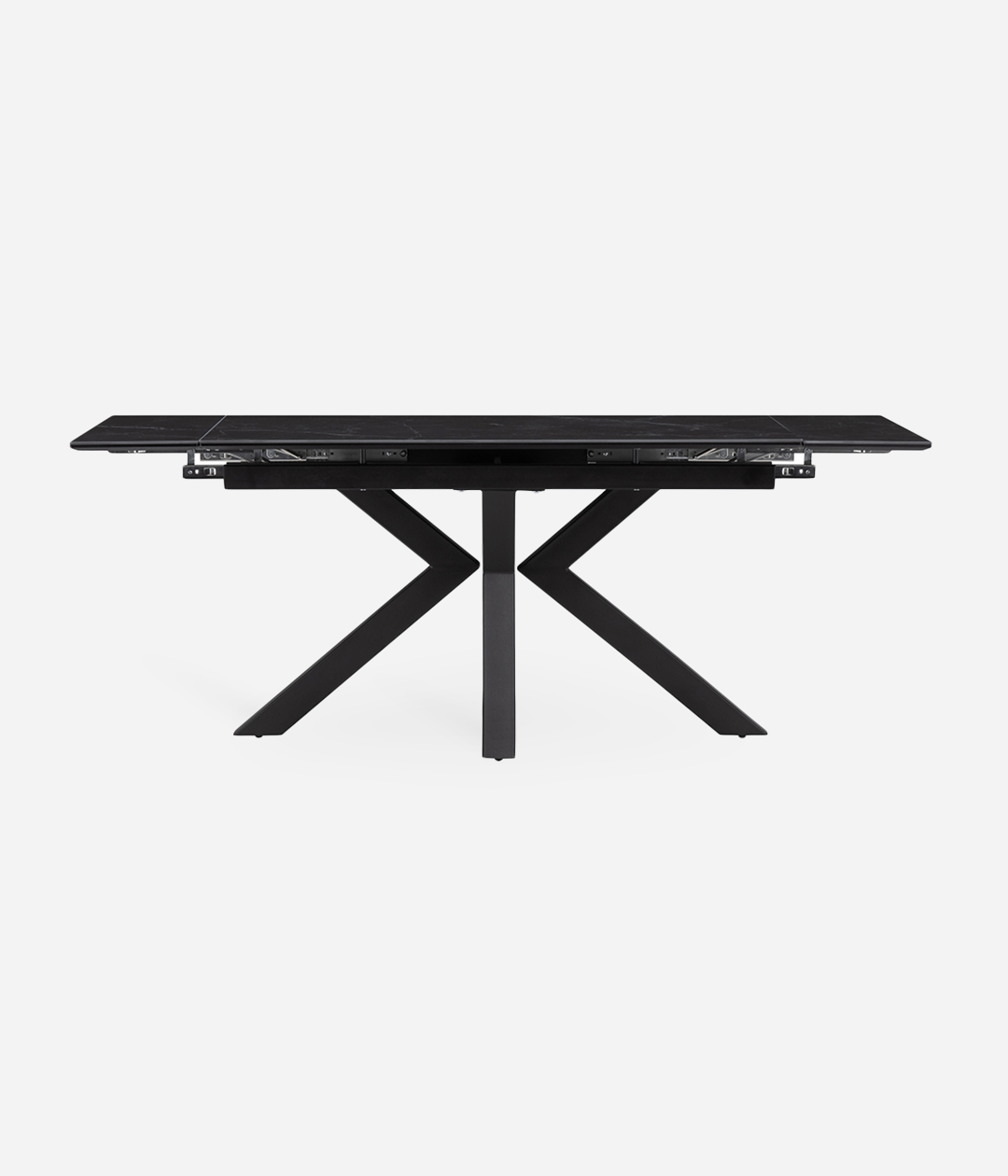 Прямоугольная столешница выполнена из цельной керамики. Материал долговечен, устойчив к термическим и механическим воздействиям. Металлические ножки надёжно удерживают всю конструкцию и придают столу оригинальный вид.