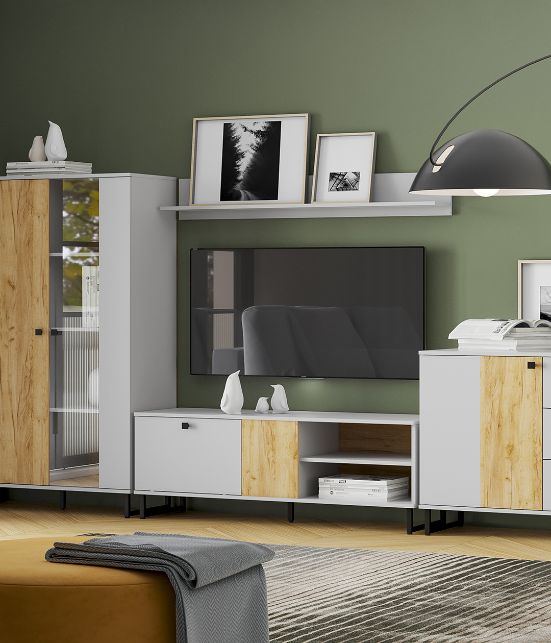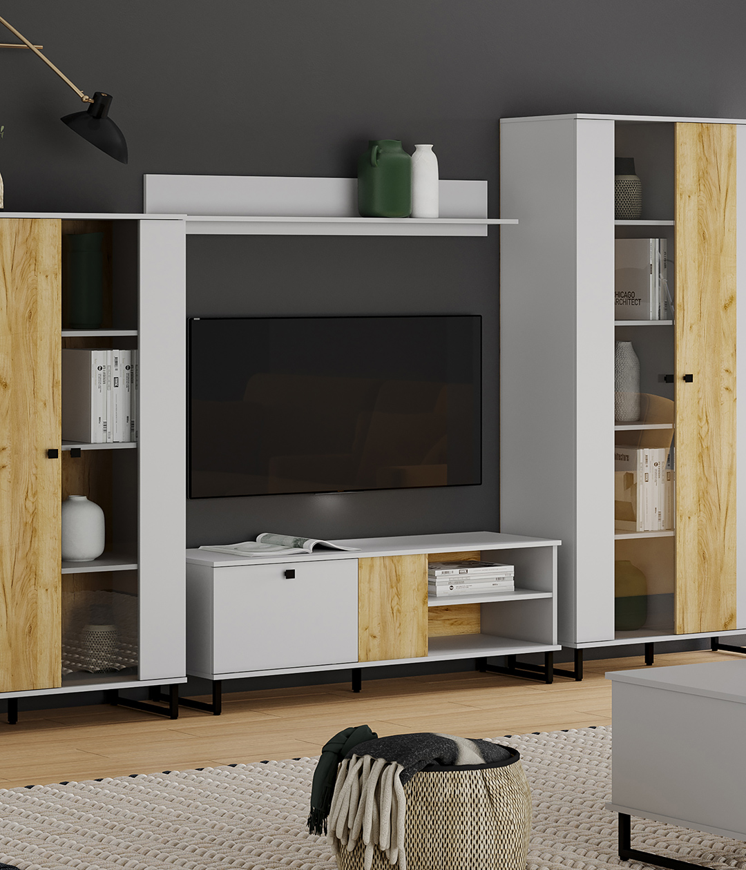 Бруно - современный дизайн с характером. Цвет платиново-серого и золотого дуба подчеркнут контрастными элементами - чёрными ручками и чёрными металлическими опорами. Модульная коллекция, состоящая из отдельных элементов, призвана максимально продуктивно использовать пространство и придать ему стильный и современный вид. Контрастные текстуры — эффектное сочетание двух абсолютно разных цветов, которые, при этом, гармонично смотрятся вместе.