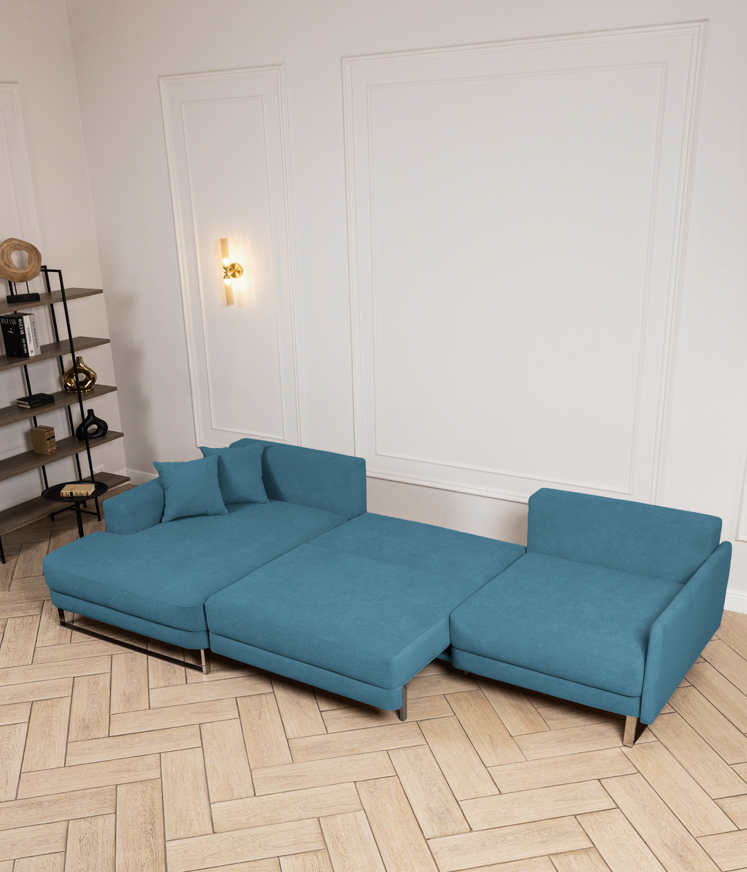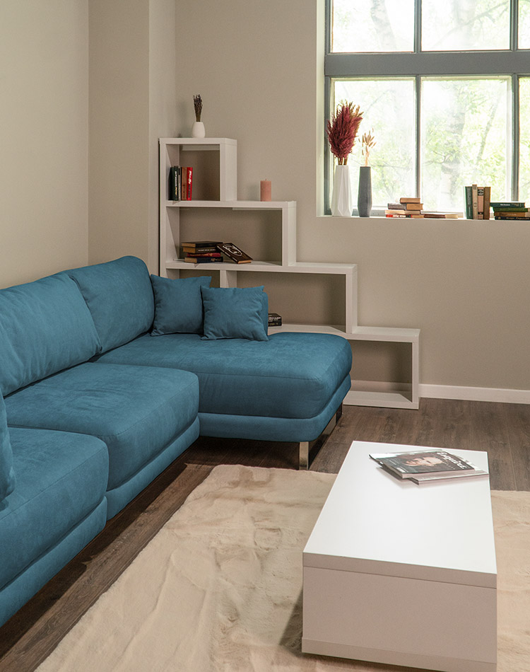 Диван Довер Лазурный и гостиная Ридл: столик и стеллаж