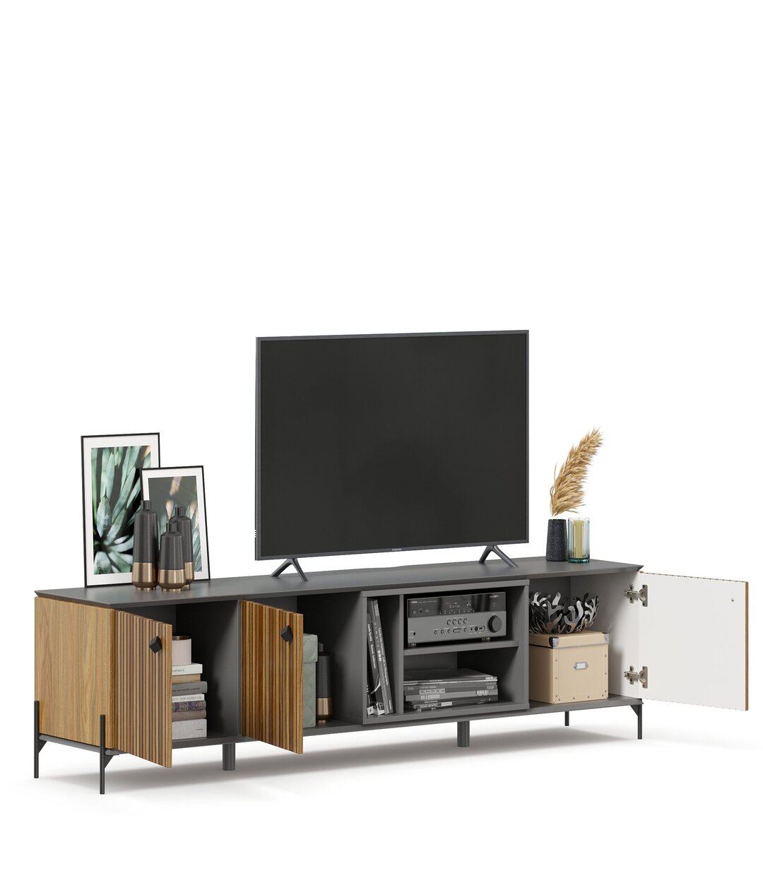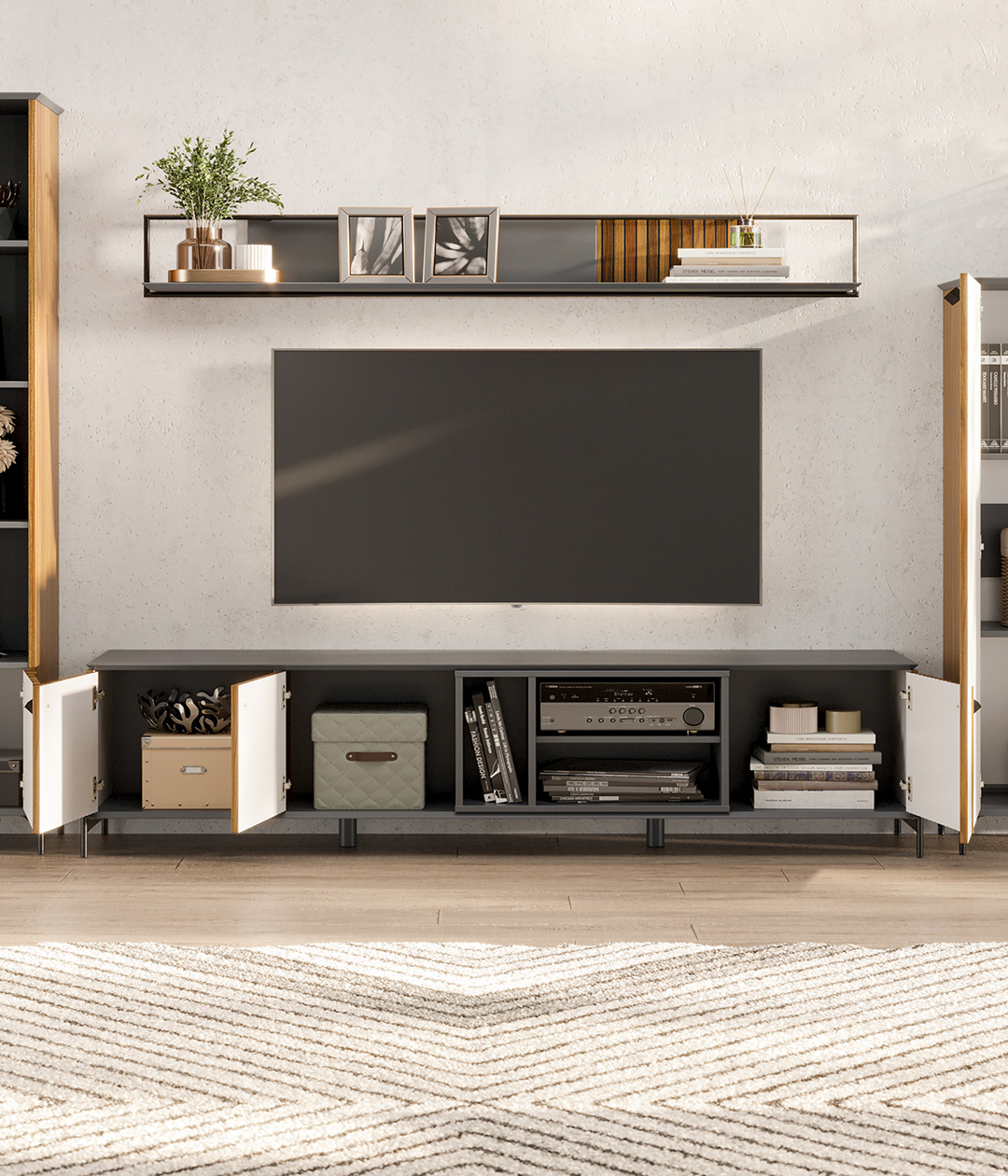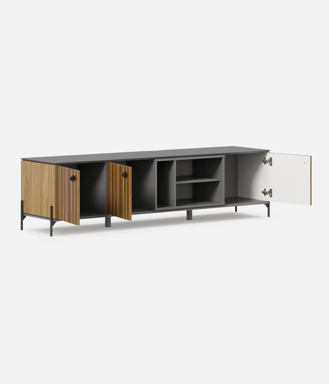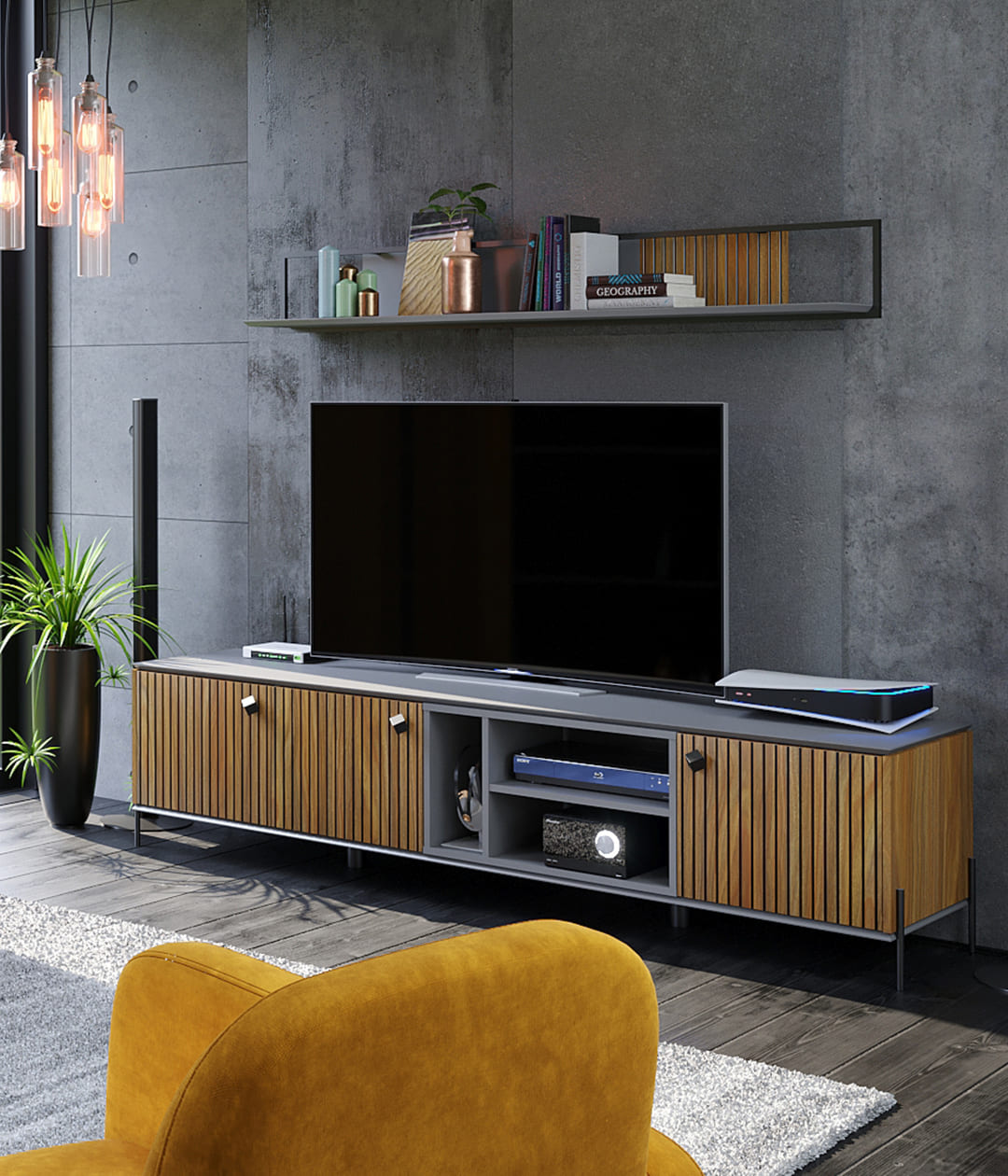 Широкая тумба под ТВ Элиот добавит уюта в интерьер гостиной в стиле лофт. На тумбу можно поставить большой телевизор, а полки и отделения пригодятся для хранения различных предметов и аксессуаров.