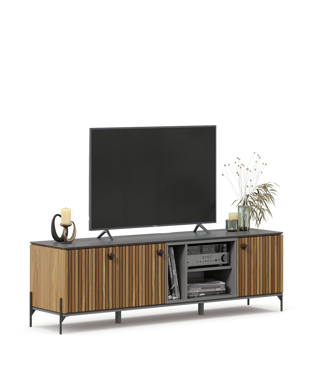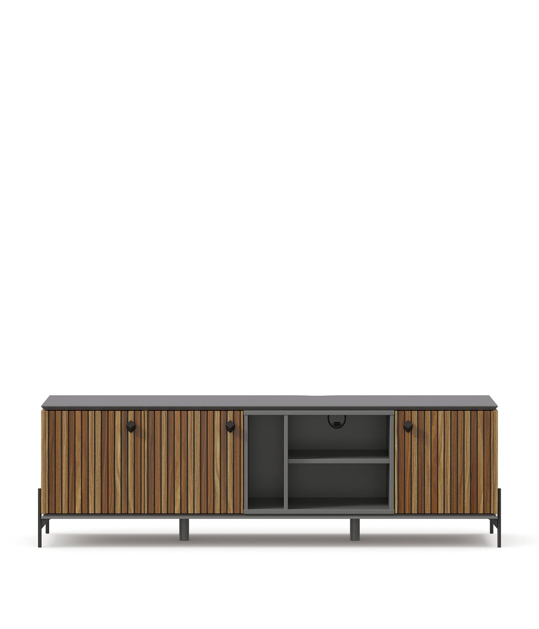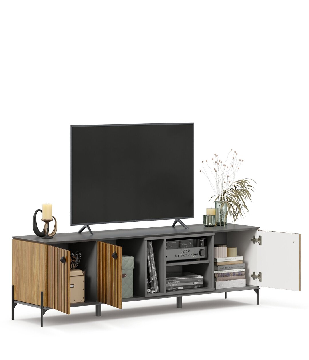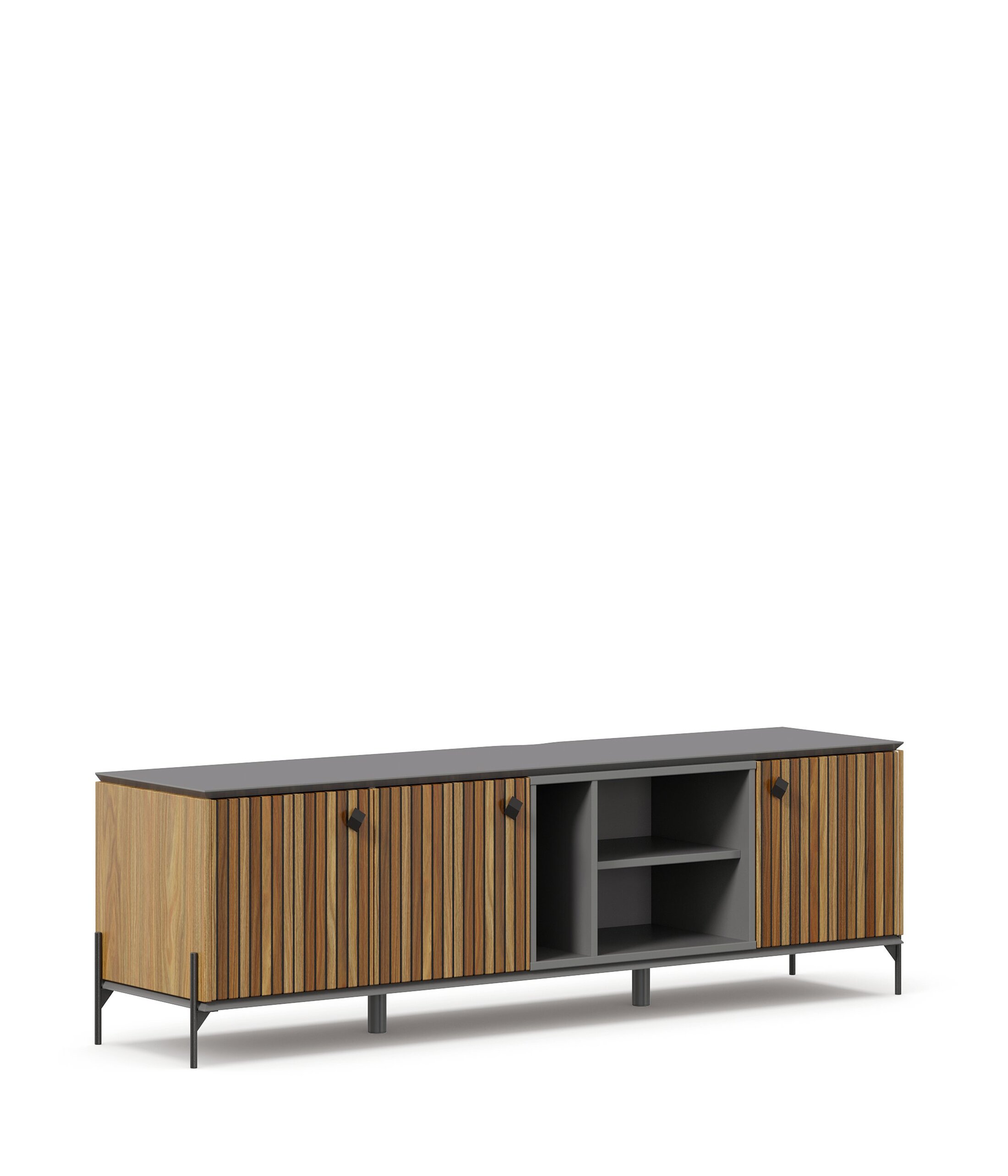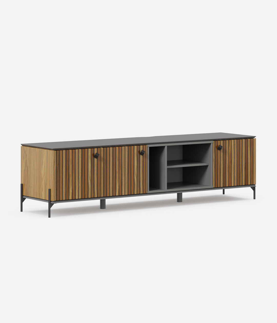 Широкая тумба под ТВ Элиот добавит уюта в интерьер гостиной в стиле лофт. На тумбу можно поставить большой телевизор, а полки и отделения пригодятся для хранения различных предметов и аксессуаров.