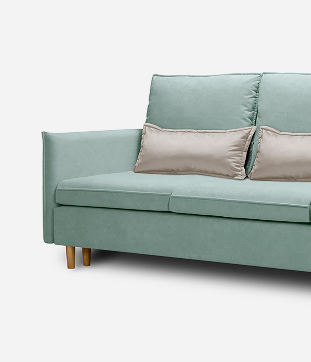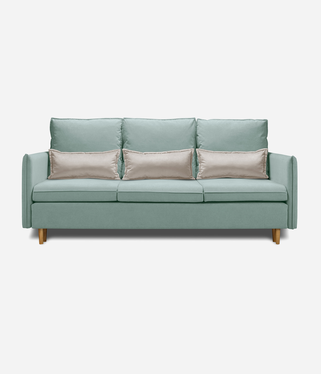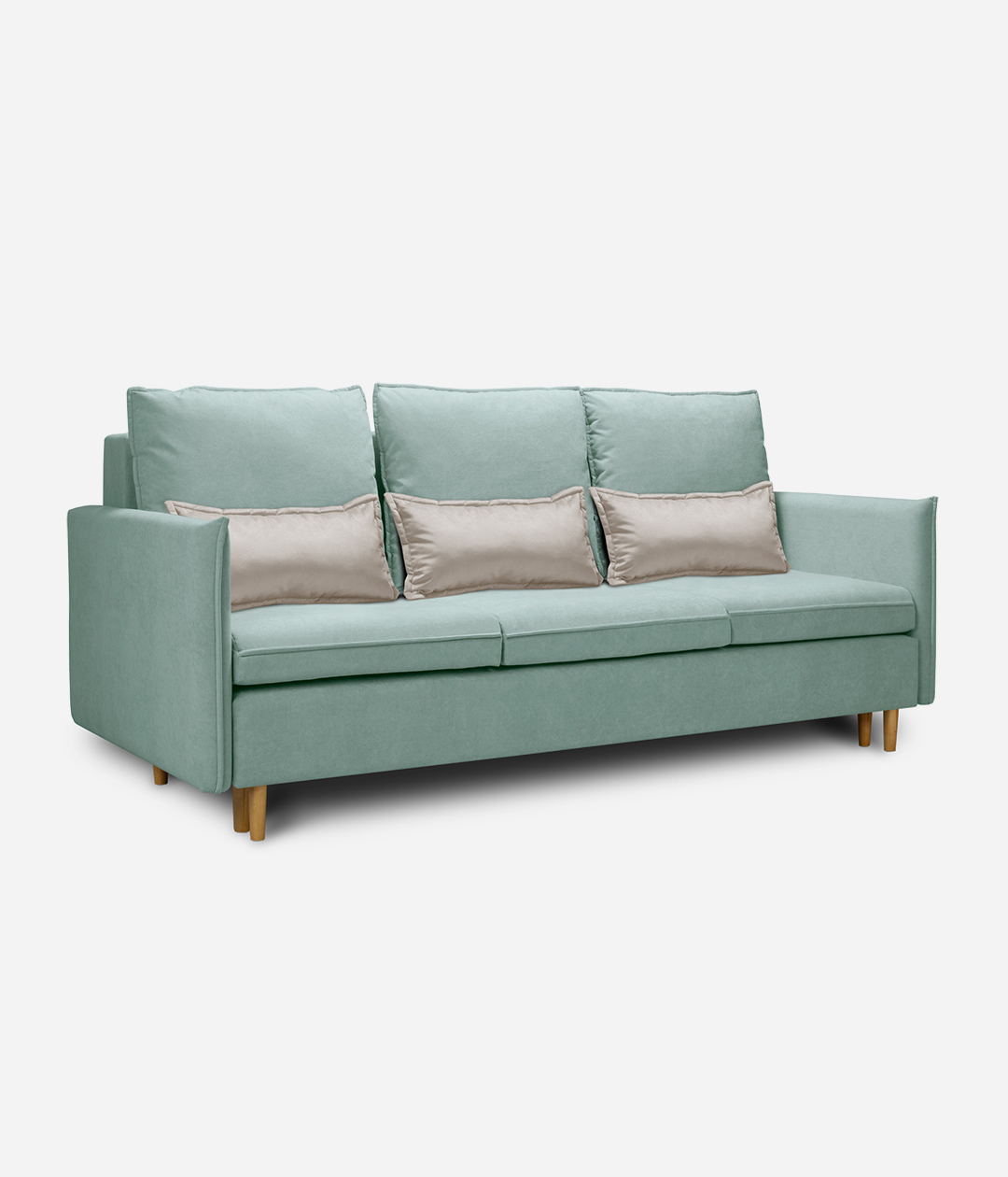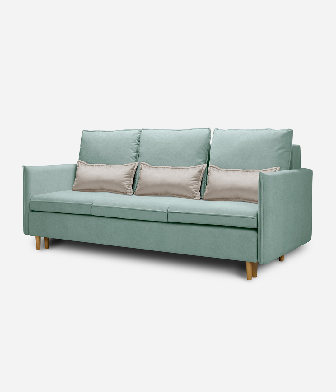 Диван Эмден отличается утонченным дизайном с элегантными линиями и современными элементами. Узкие подлокотники экономят пространство, что делает его идеальным для небольших помещений. Деревянные ножки придают легкость, а мягкие подушки обеспечивают комфорт. Приятная обивка создает уют, а надежный механизм трансформации позволяет легко превращать диван в спальное место для гостей.