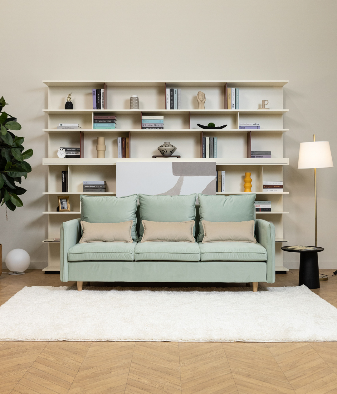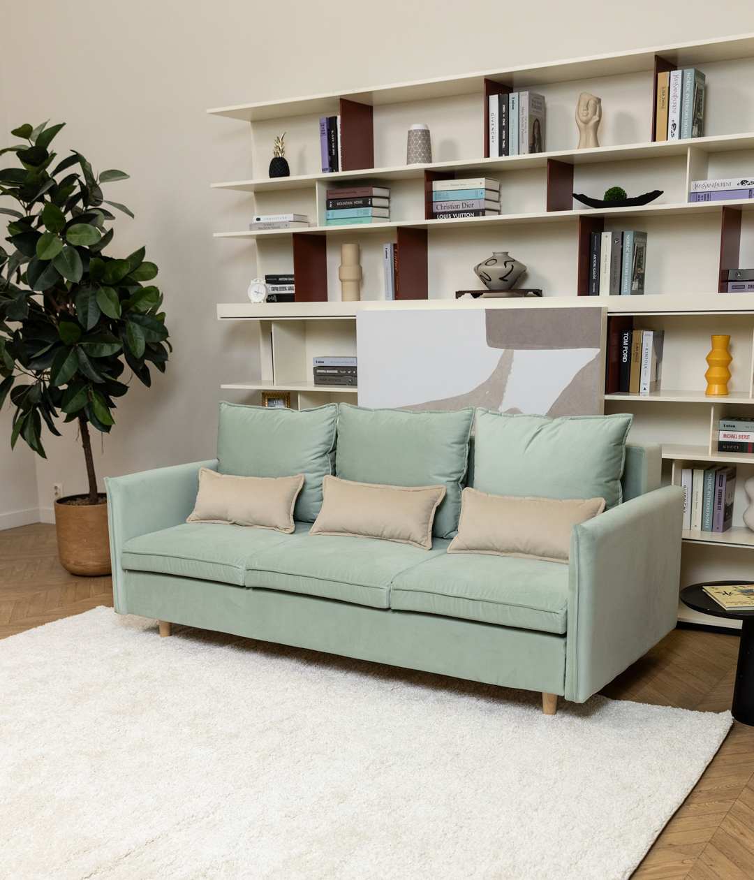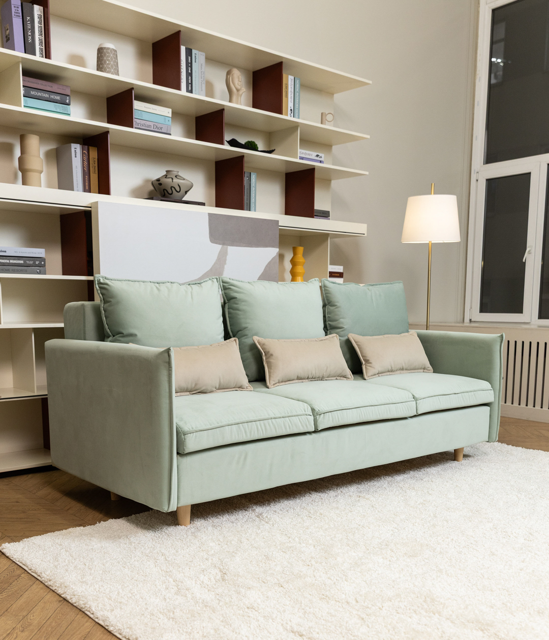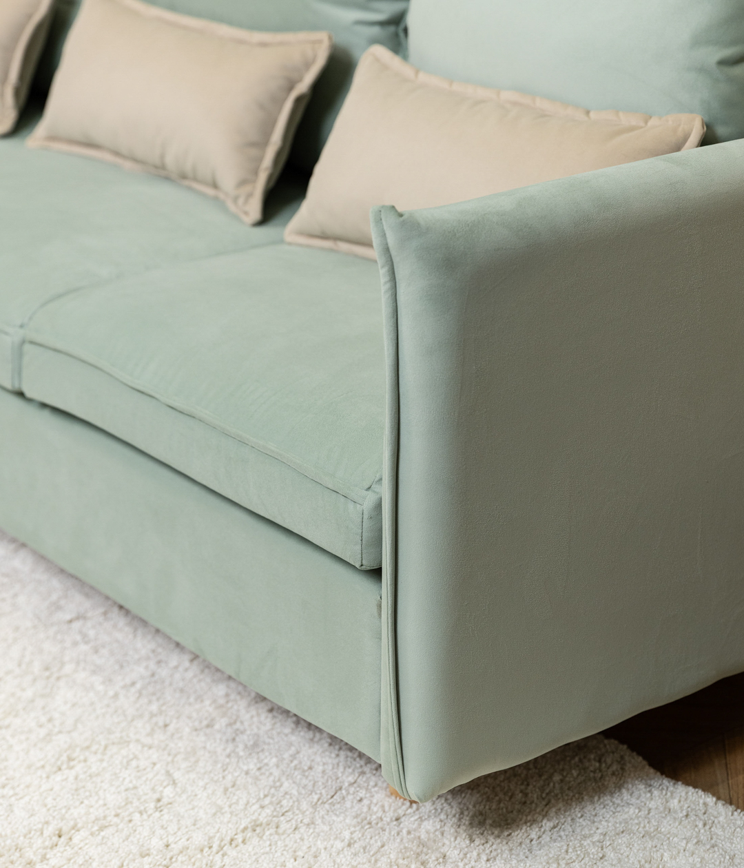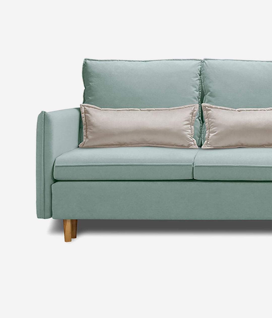 Диван Эмден отличается утонченным дизайном с элегантными линиями и современными элементами. Узкие подлокотники экономят пространство, что делает его идеальным для небольших помещений. Деревянные ножки придают легкость, а мягкие подушки обеспечивают комфорт. Приятная обивка создает уют, а надежный механизм трансформации позволяет легко превращать диван в спальное место для гостей.