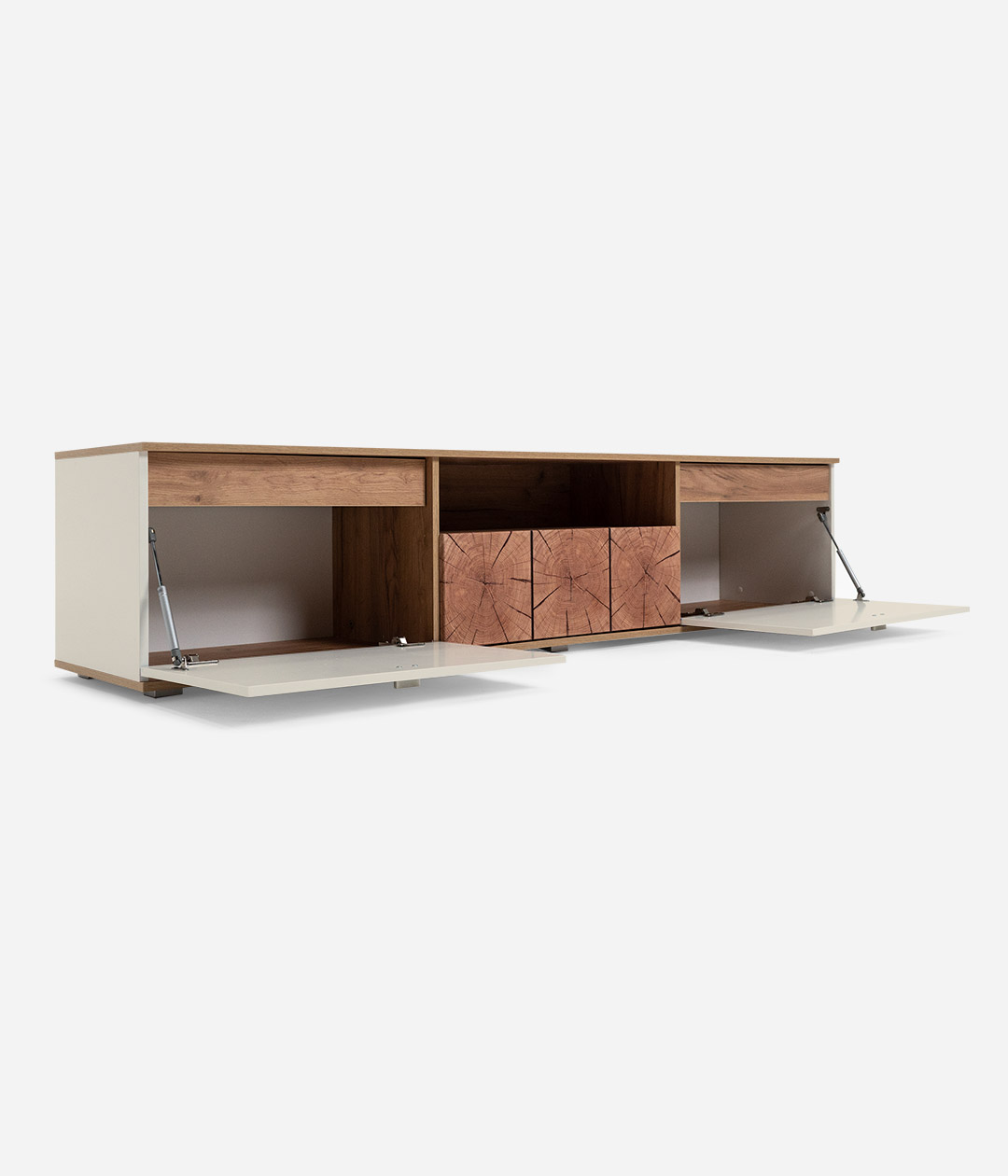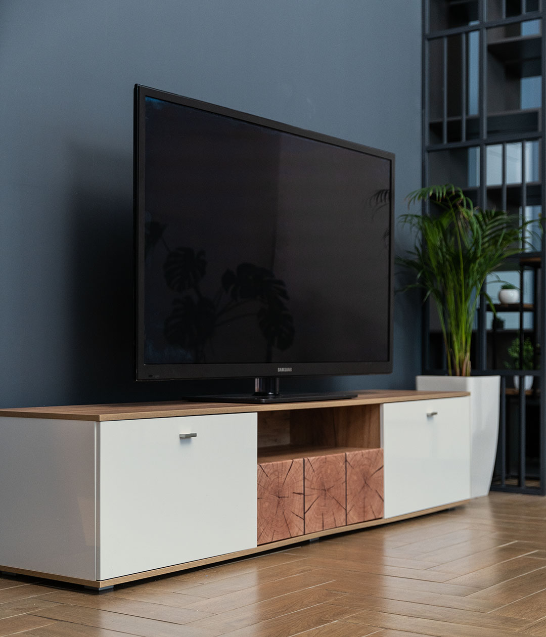 Функциональная и надежная ТВ-тумба Фиджи — это залог уютного и аккуратного интерьера. Комбинированное наполнение предусматривает отделения за распашной дверцей, а также ящики полного выдвижения.