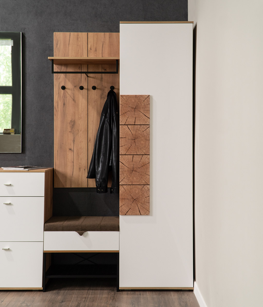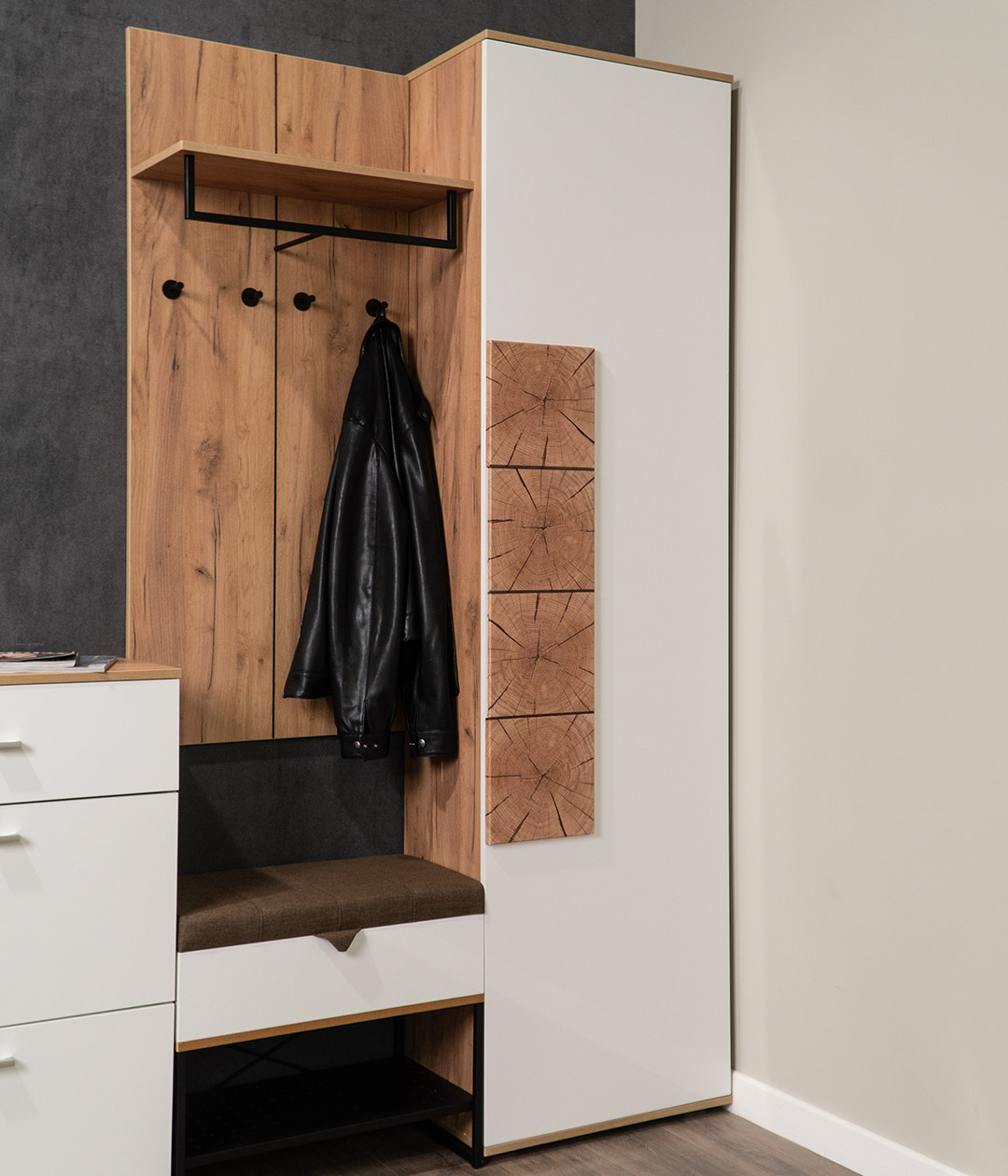 Распашной шкаф Фиджи — модель, в которой удачно сочетаются стильное исполнение и практичный дизайн. Внутри есть ниша с евро-штангой для верхней одежды и пара полок для хранения коробок с обувью, сумок или сезонных аксессуаров.