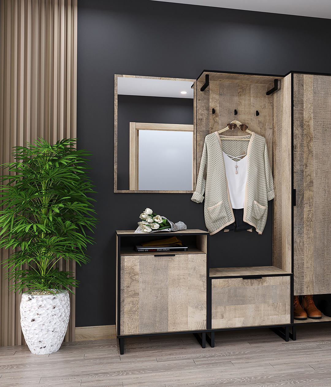Тумба Фолк с полками украсит любое помещение в стилях лофт и минимализм. Модуль отвечает всем современным требованиям к практичности и функциональности. Храните в нём свои вещи и аксессуары и наслаждайтесь тёплым сочетанием цветов, которое легко задаст тон интерьеру всего дома.