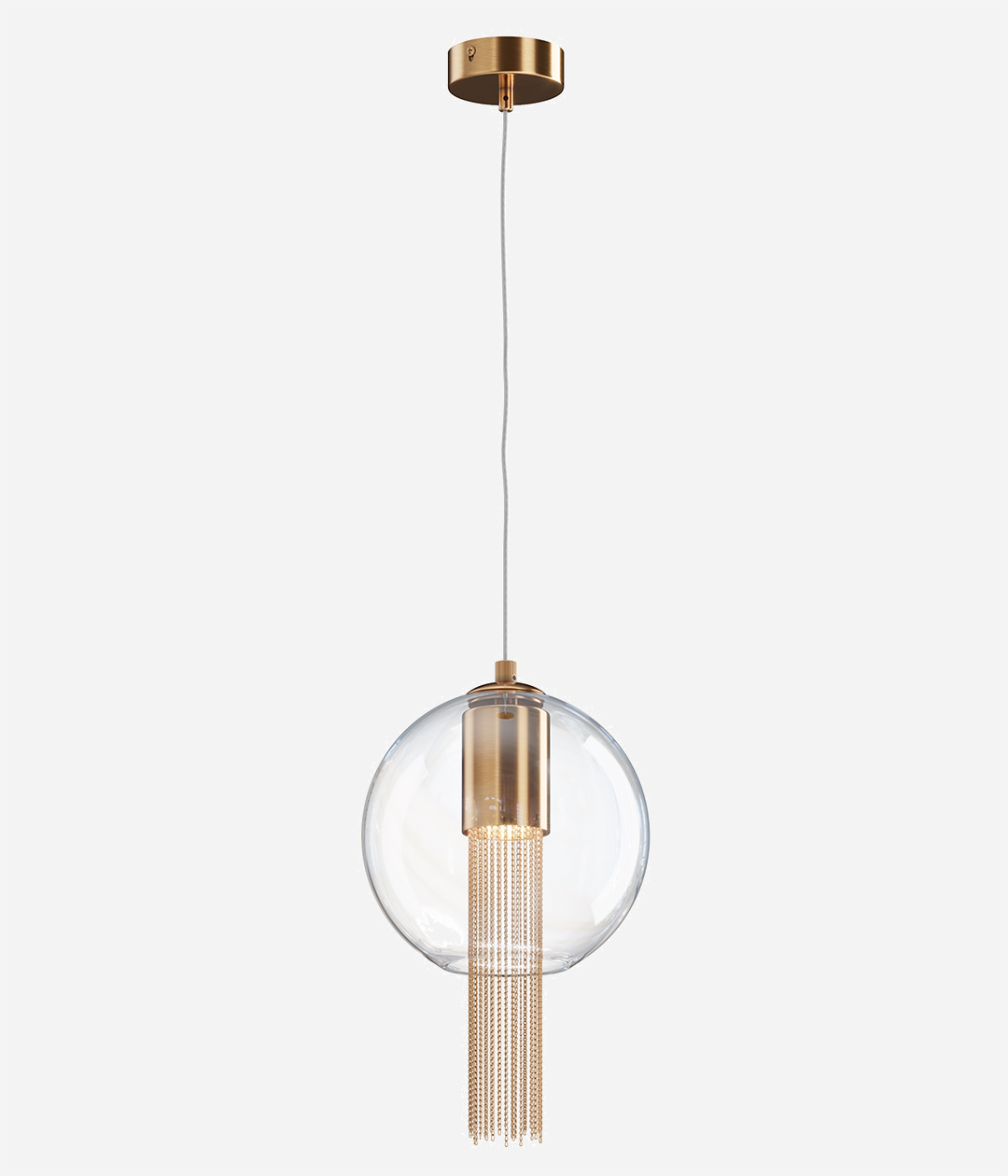 Металлическая арматура светильника представлена в цвете латуни. Лаконичное исполнение сосредотачивает внимание смотрящего на модной сферической форме плафона. Данная модель осветит помещение площадью 5 кв. м.