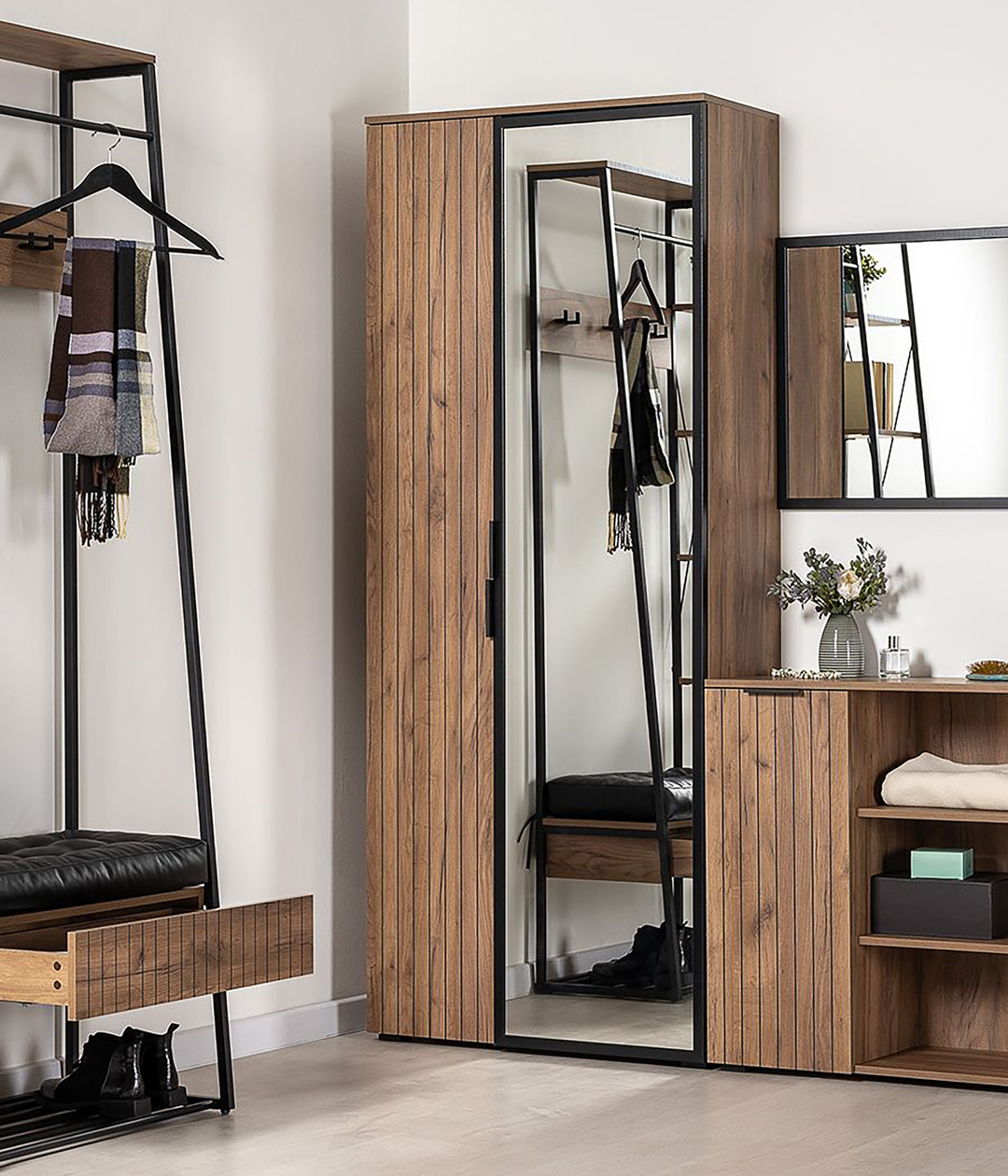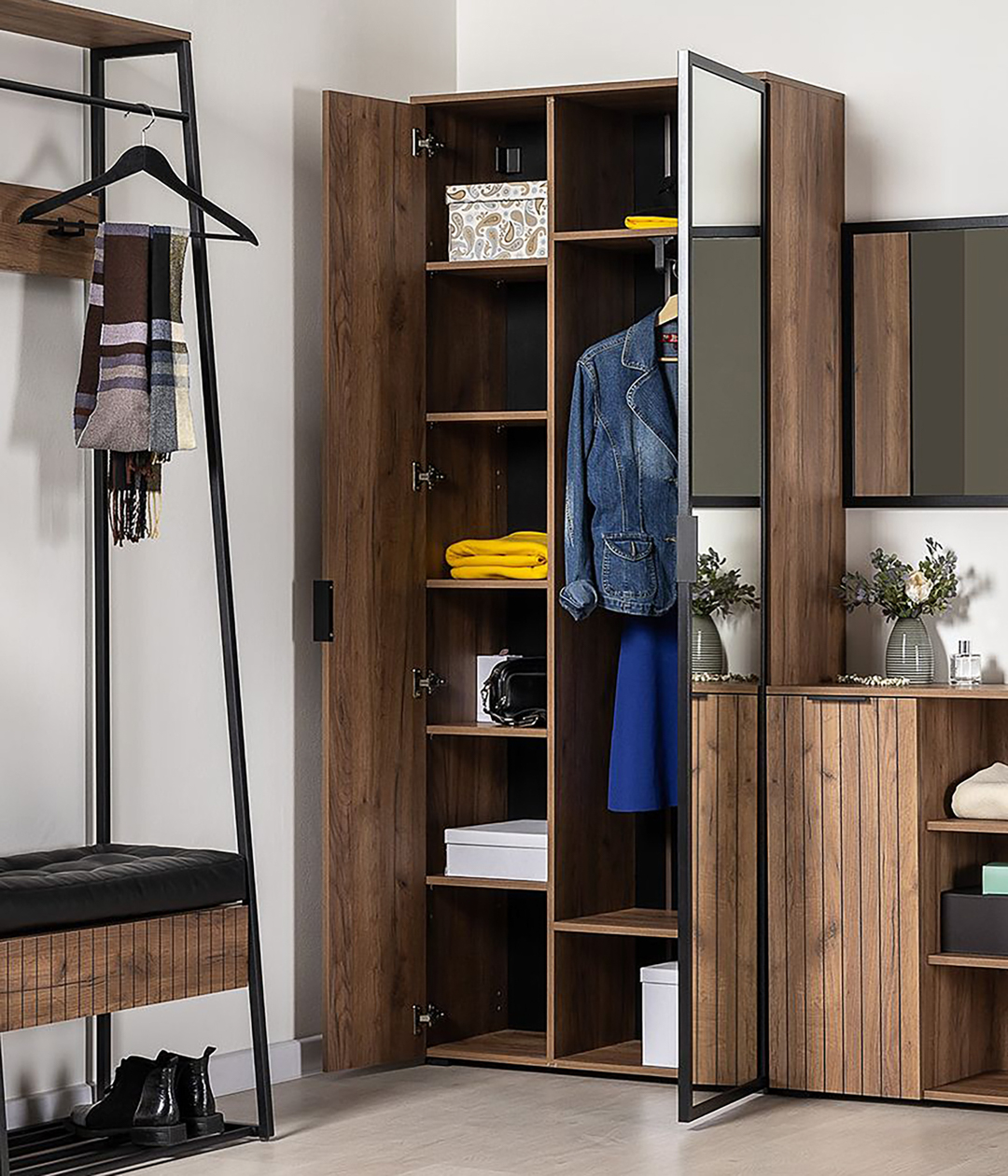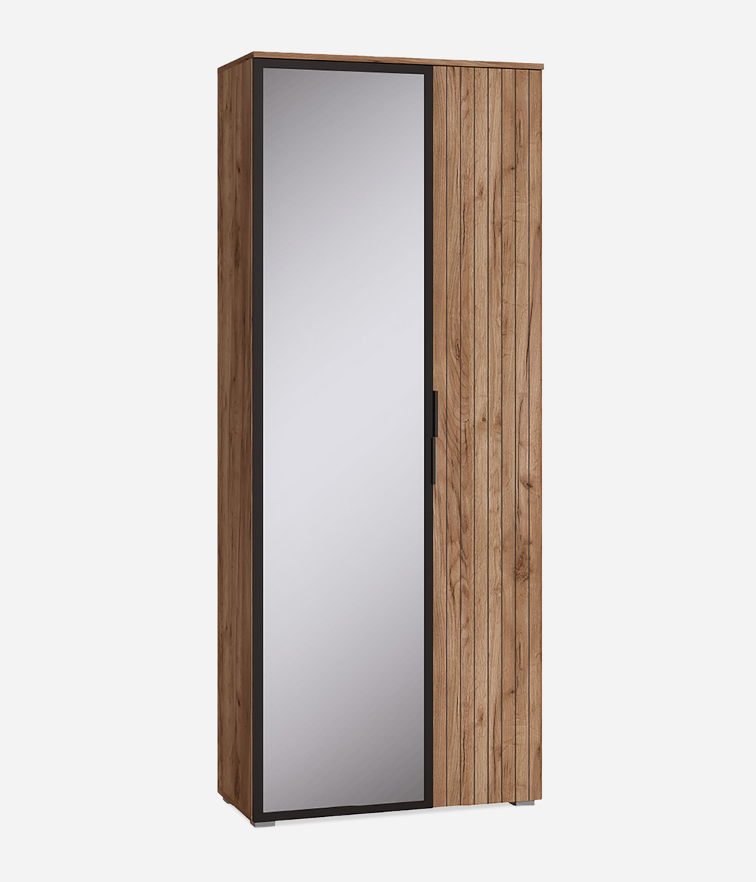 Распашной шкаф Гранд функционально дополнит прихожую в стиле лофт. Внутреннее наполнение представлено усиленной выдвижной штангой для вешалок и рядом полок для сложенной одежды. Благодаря регулируемым опорам можно разместить шкаф даже на полу с неровностями.