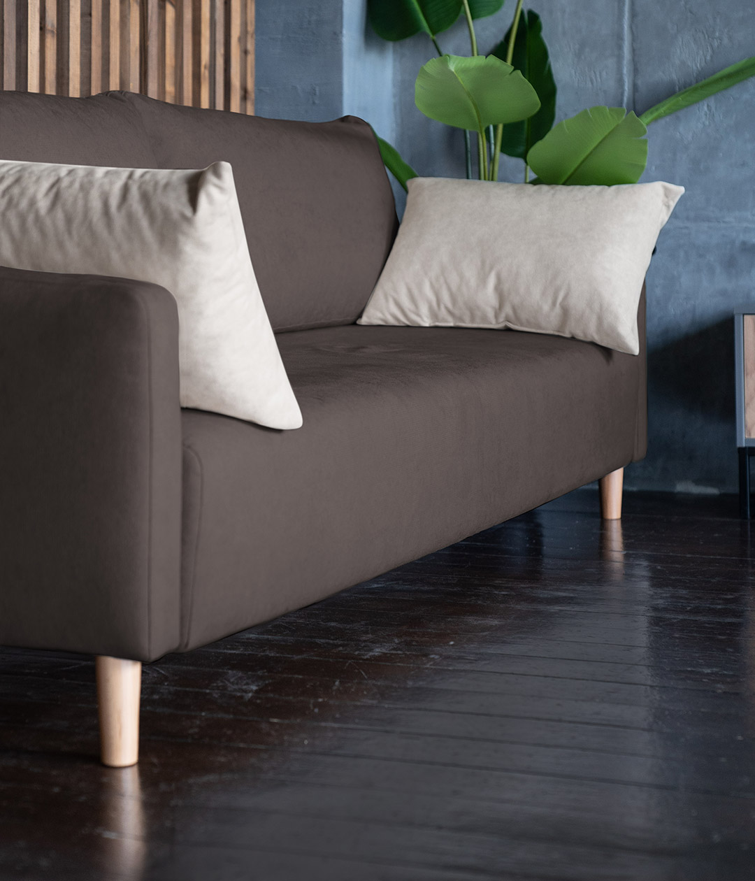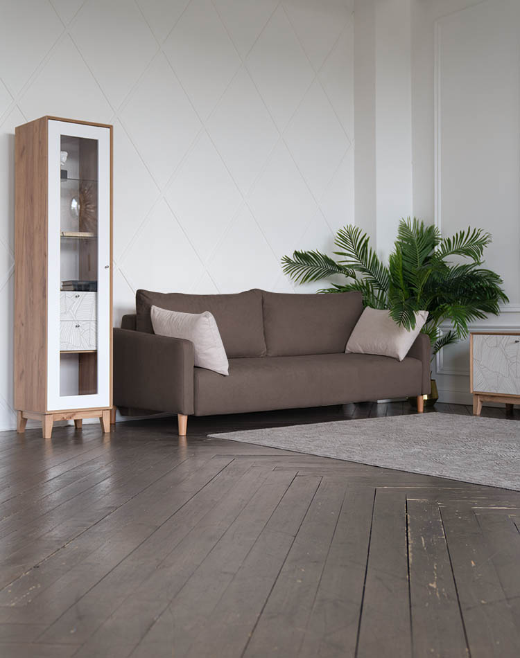 Высокие ножки дивана делают его форму легкой, максимально открывая пространство. А натуральное дерево подчеркивает естественность материалов. Кроме того, такая конструкция упрощает уборку, делая доступным напольное покрытие.