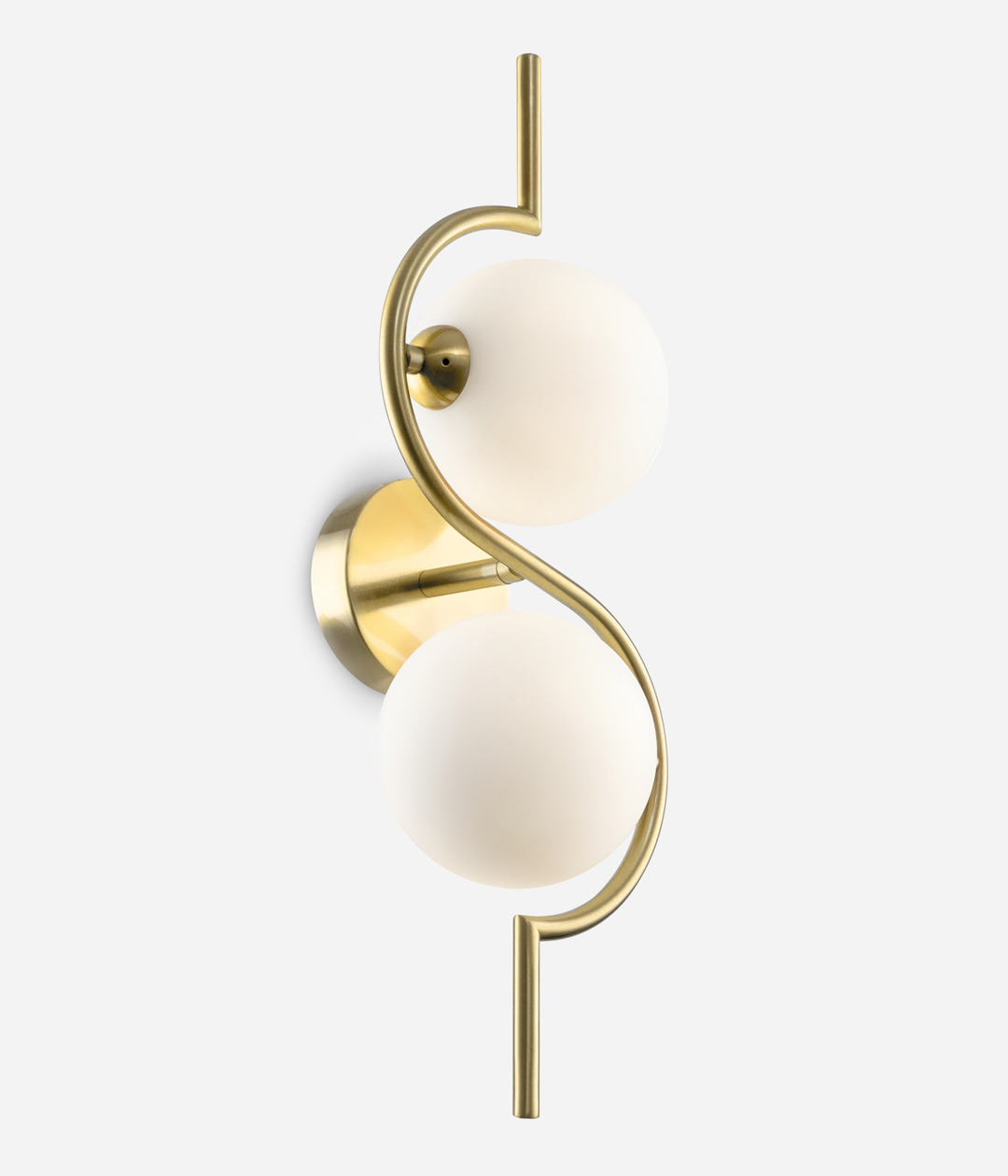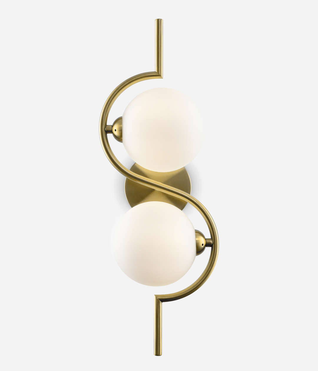 Плавные симметричные контуры создают визуально легкий и гармоничный облик. Символика «инь-ян» и трендовый силуэт сферы – образа бесконечности – наполняют дизайн метафорическим смыслом. Минималистичная металлическая арматура окрашена в цвет латуни. Сферическая форма плафонов обеспечивает равномерное распределение светового потока, а матовое стекло делает его мягким, комфортным для наблюдателя.