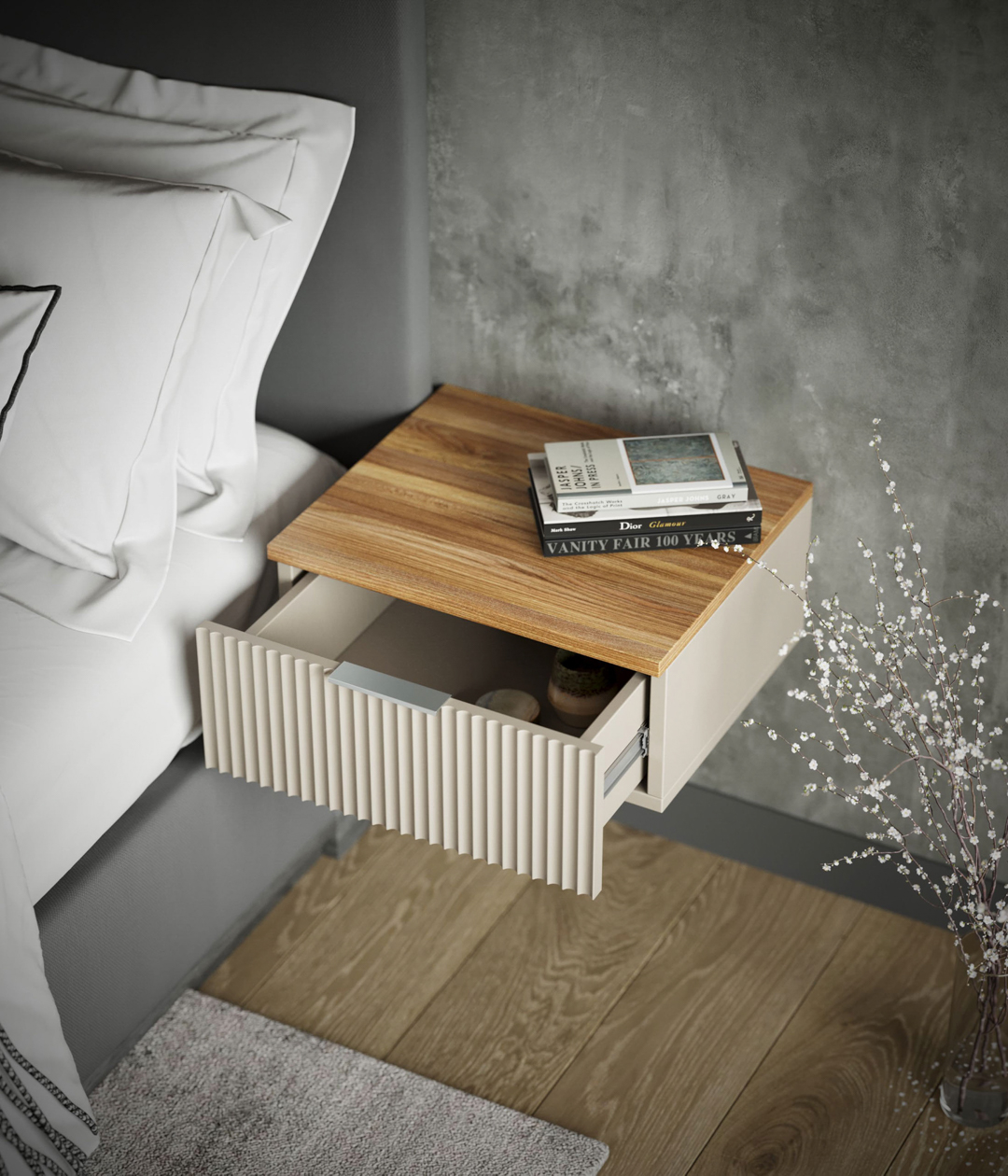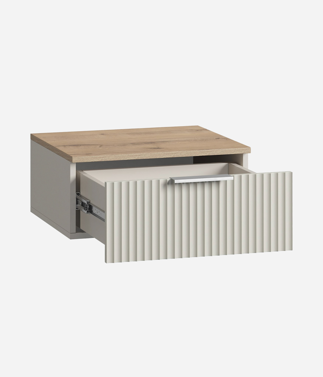 Тумба прикроватная подвесная Ингрия 1 выполнена в скандинавском стиле с оригинальной фрезеровкой, дополнит интерьер любой комнаты. Графитовый, белый или кашемировый цвет тумбы приносит в любое пространство ощущение элегантности и утонченности, а натуральная текстура дуба добавляет теплоты и уюта.
