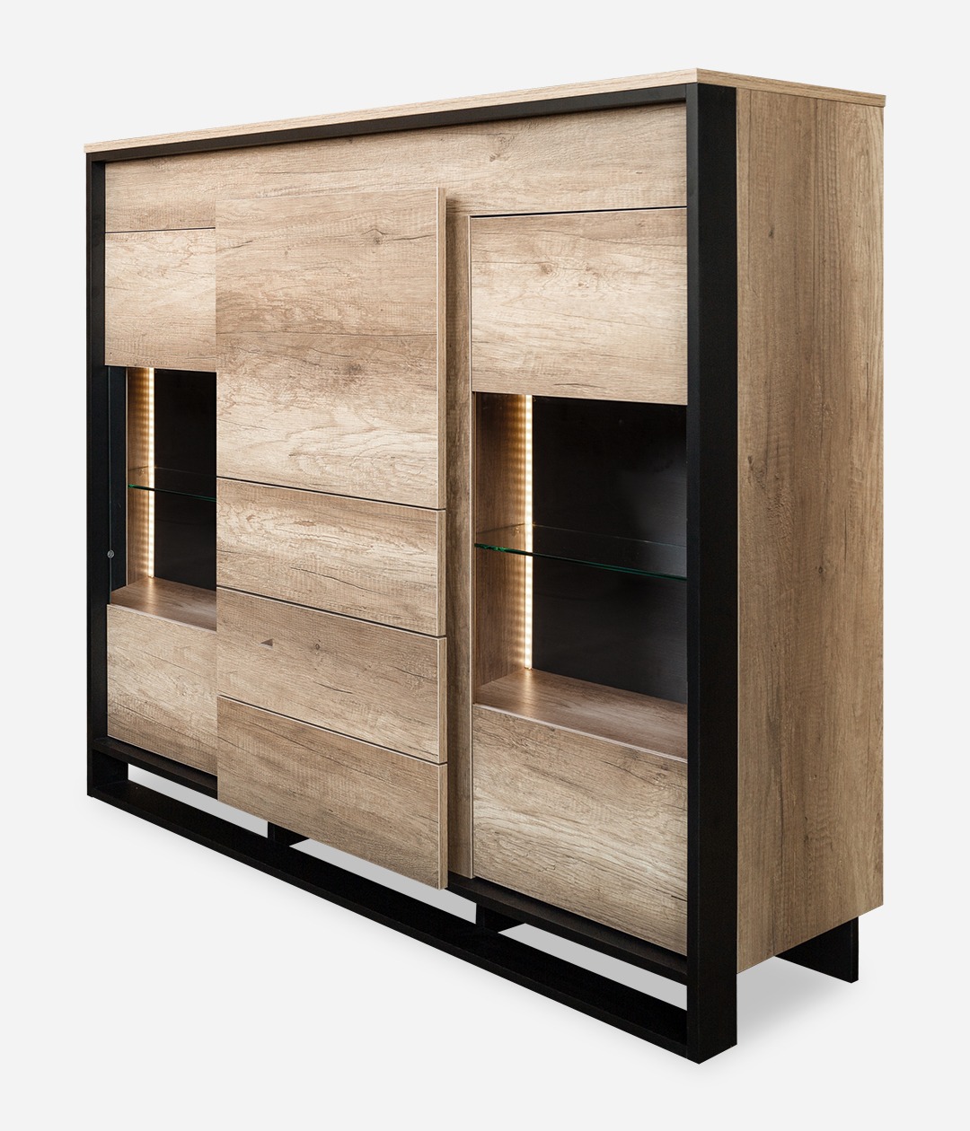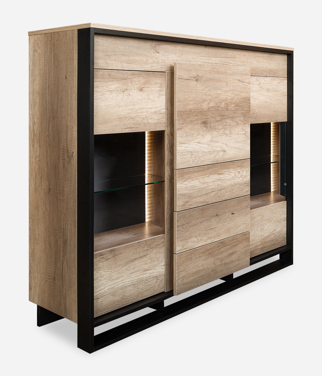Тумба-витрина Каньон — эффектное решение для хранения вещей и предметов в интерьере, оформленном в стиле лофт. Сочетание тёплого оттенка дерева и стекла наилучшим образом контрастирует с декоративными чёрными элементами. Книги в красивых переплётах или набор бокалов не останутся незамеченными, благодаря фасаду со стеклом.