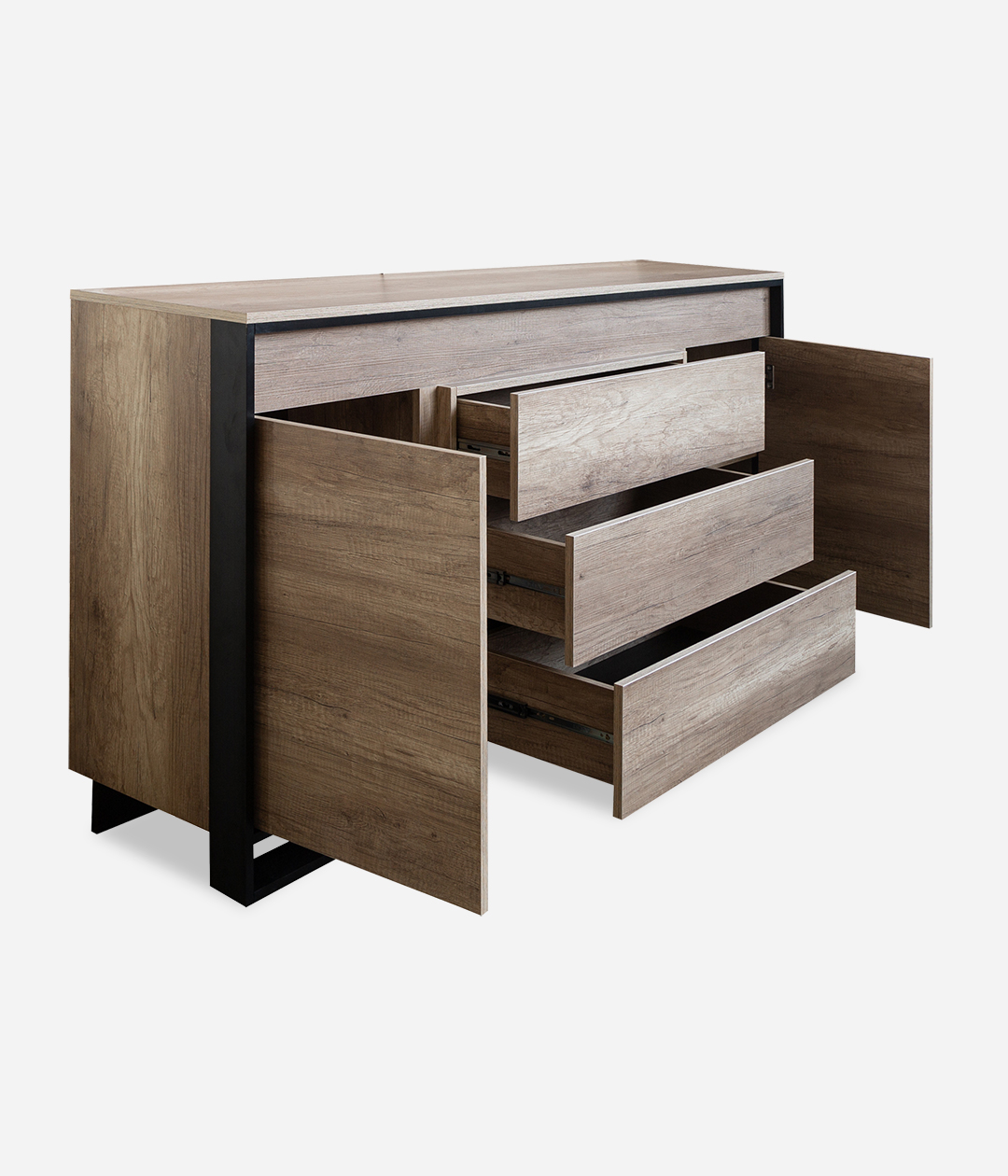 Широкий комод Каньон в натуральных оттенках не перегрузит интерьер, добавит тепла и уюта в гостиную. Чёрные пластиковые опоры и декоративные вставки по периметру фасадов позволяют получить красивую комбинацию, подчеркнуть текстуру, расставить акценты.