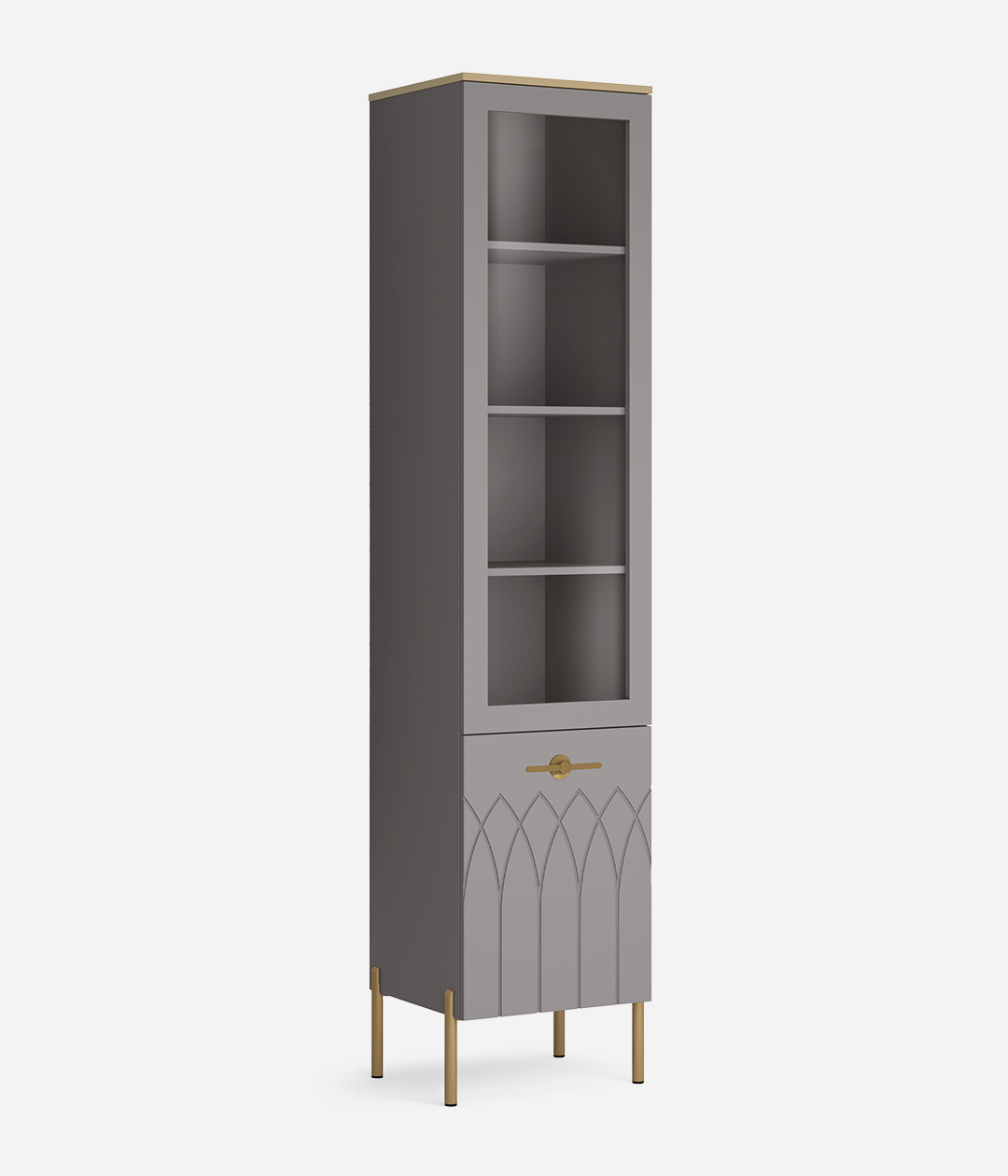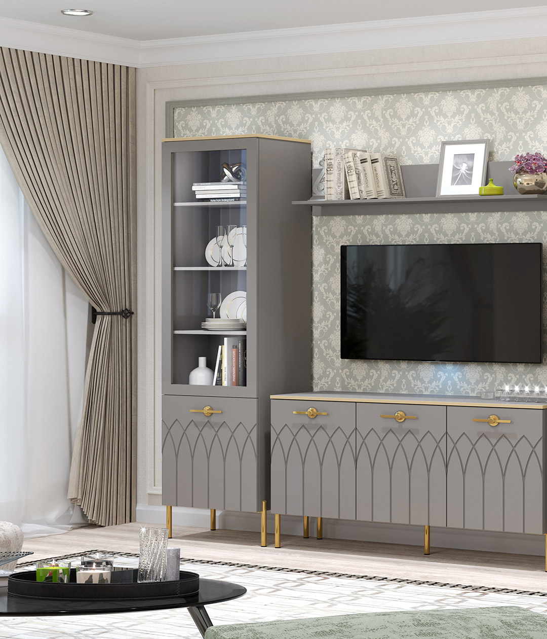 Витрина Капри играет в современной гостиной одну из ведущих ролей, ведь она позволяет не только хранить посуду, книги и другие предметы, но и украшает пространство. Стеклянная дверка дает возможность наглядно продемонстрировать красивые предметы, рамочки с памятными фото и сувениры.