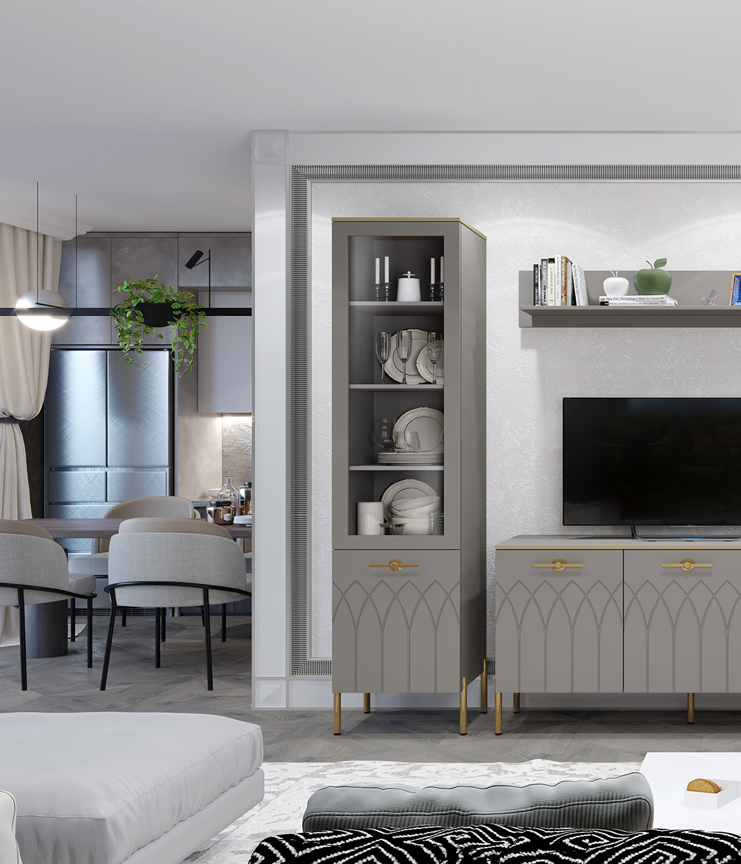 Витрина Капри играет в современной гостиной одну из ведущих ролей, ведь она позволяет не только хранить посуду, книги и другие предметы, но и украшает пространство. Стеклянная дверка дает возможность наглядно продемонстрировать красивые предметы, рамочки с памятными фото и сувениры.