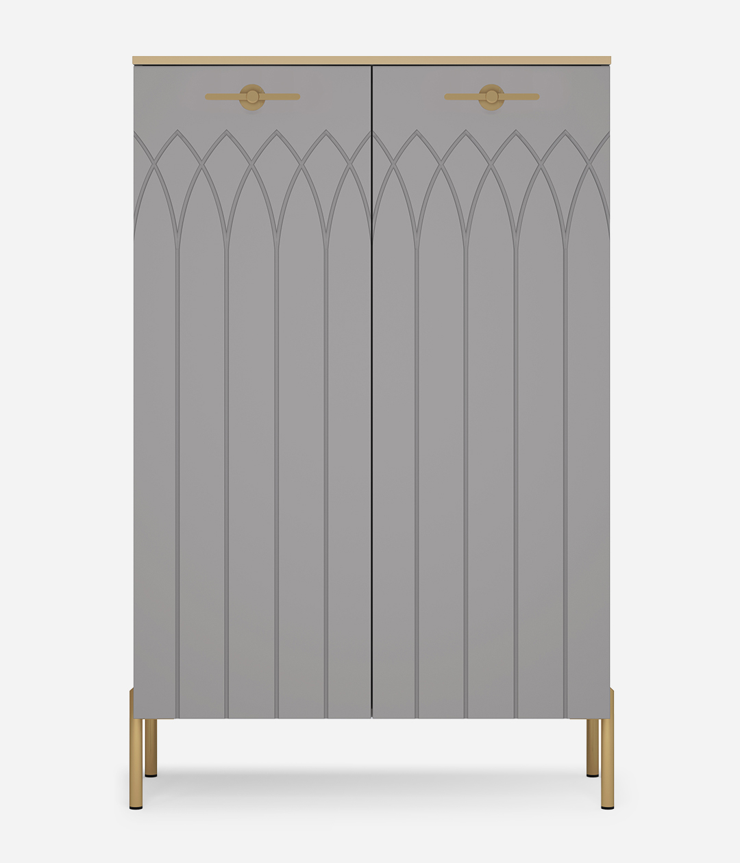 Элегантный и утонченный шкаф «Капри» несомненно выглядит эффектно. Бархатная текстура цвета мокко великолепно сочетается с изящными опорами в цвете золото.