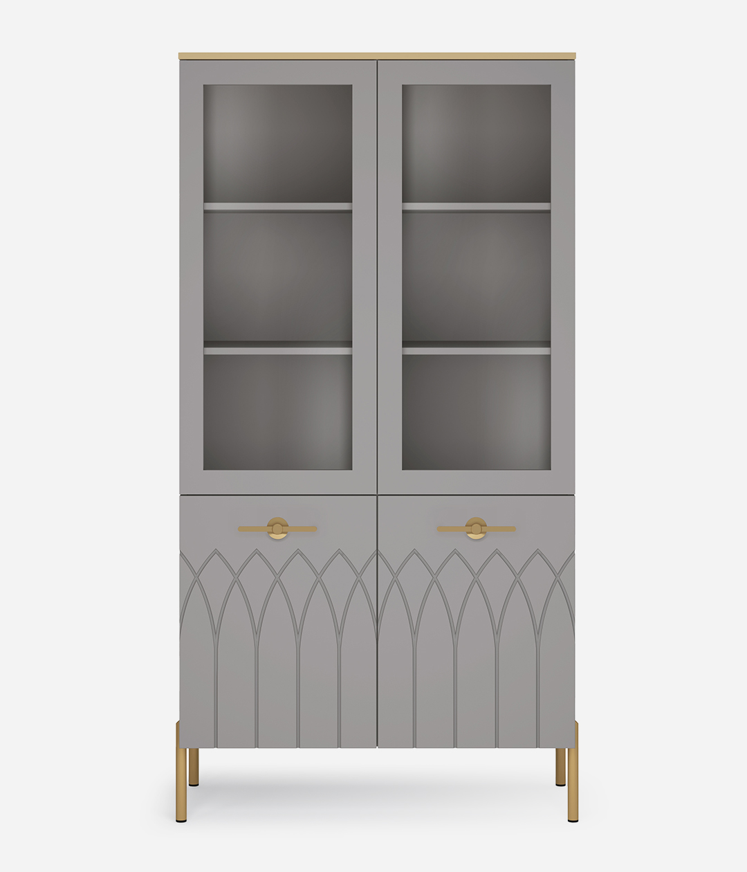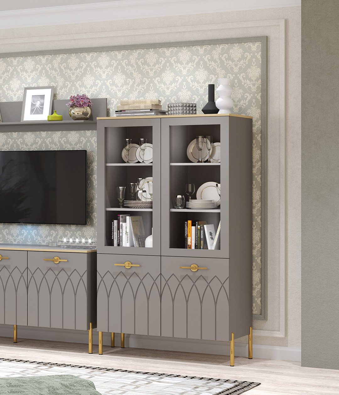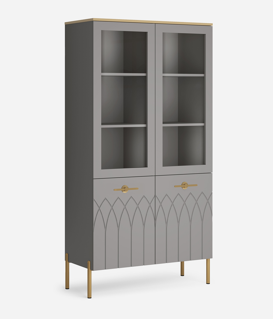 Элегантная и утонченная шкаф-витрина «Капри» несомненно выглядит эффектно. Бархатная текстура цвета мокко великолепно сочетается с изящными опорами в цвете золото.