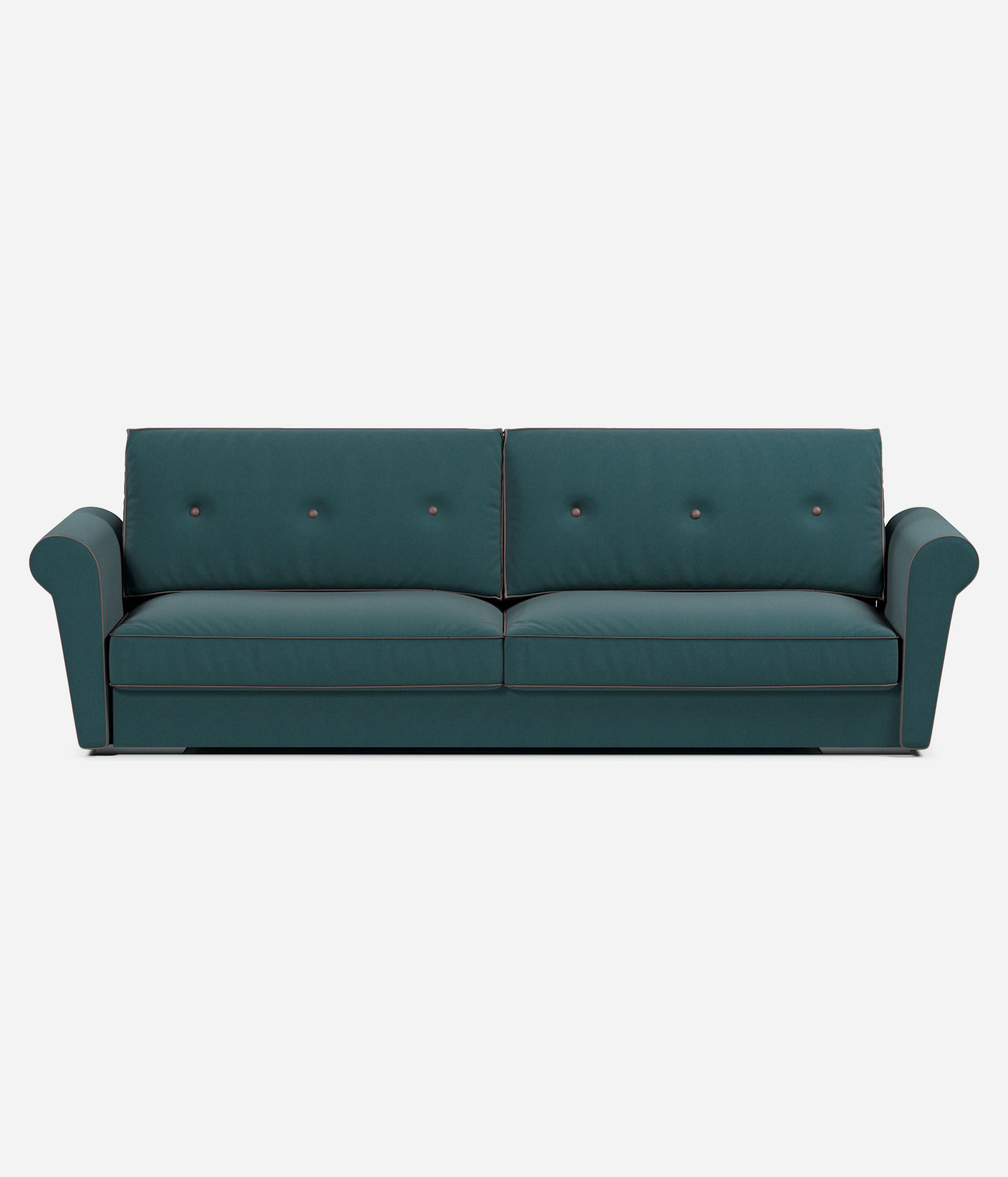 Прямой диван-кровать «Карлстад» выполнен в современном стиле с классическими деталями и декором. Подлокотники изогнутой формы гармонично сочетаются с прямоугольными подушками спинки, украшенными пуговицами. По периметру всех подушек пущен контрастный кант. Диван можно установить в любой современной гостиной или спальне в стиле прованс.