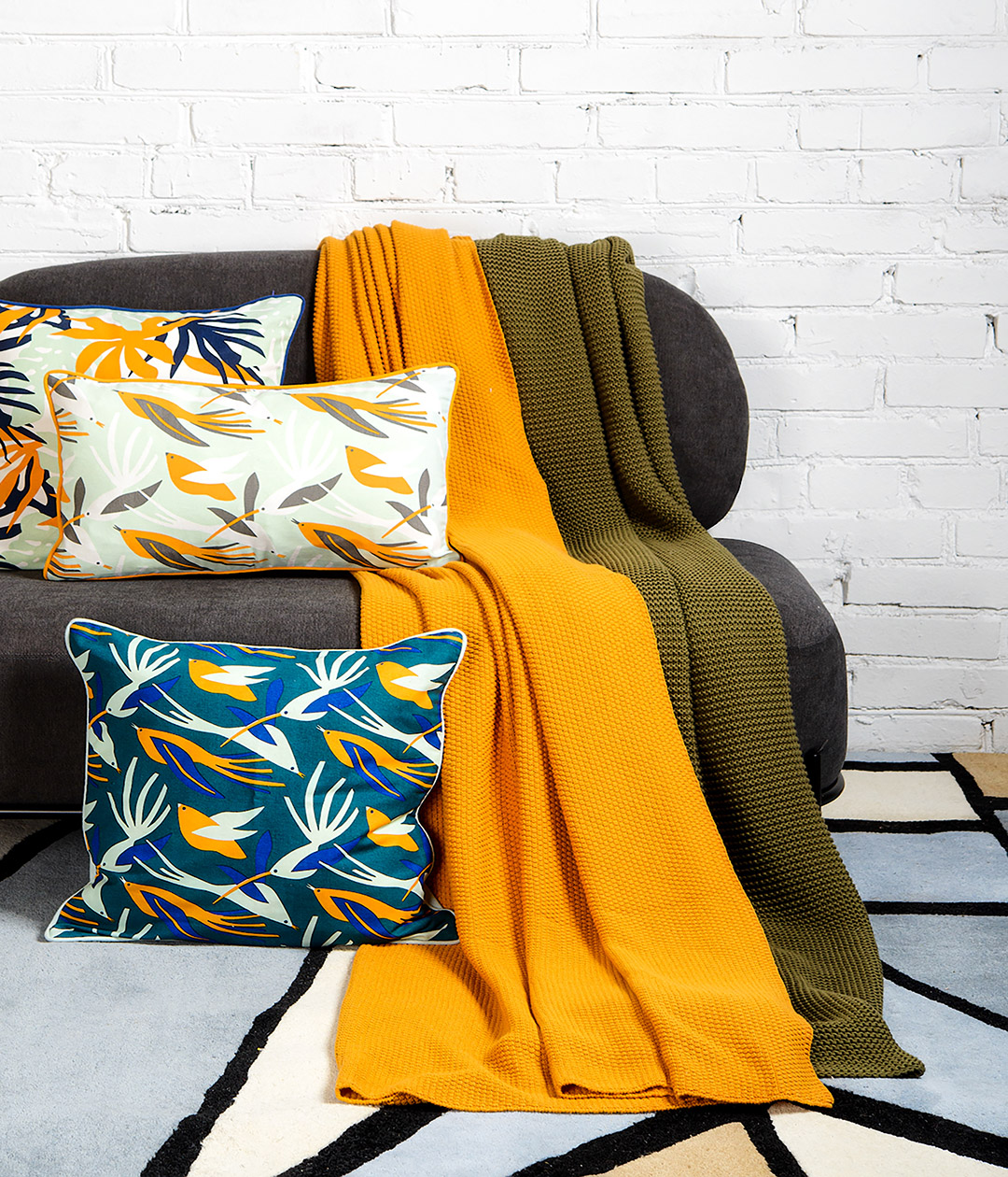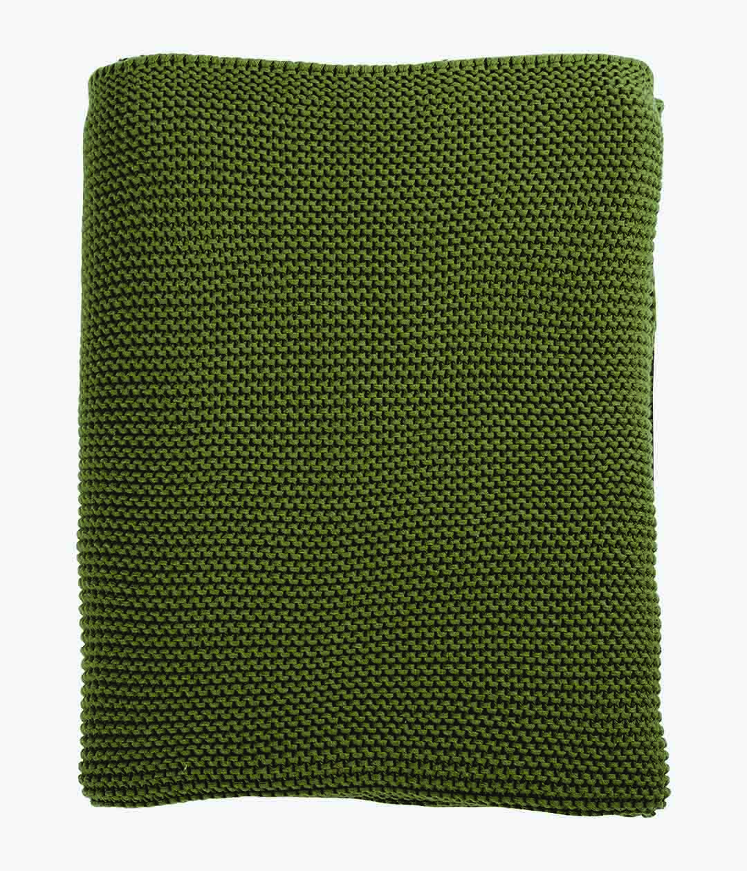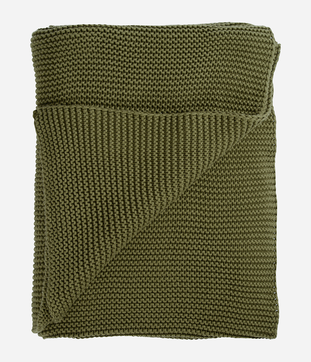 Плед оливкового цвета из хлопка жемчужной вязки из коллекции Essential – стильный аксессуар для спальни, гостиной или детской комнаты.