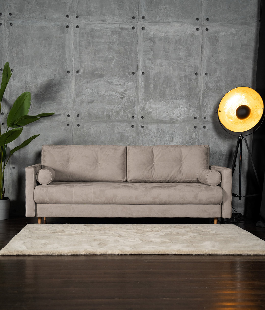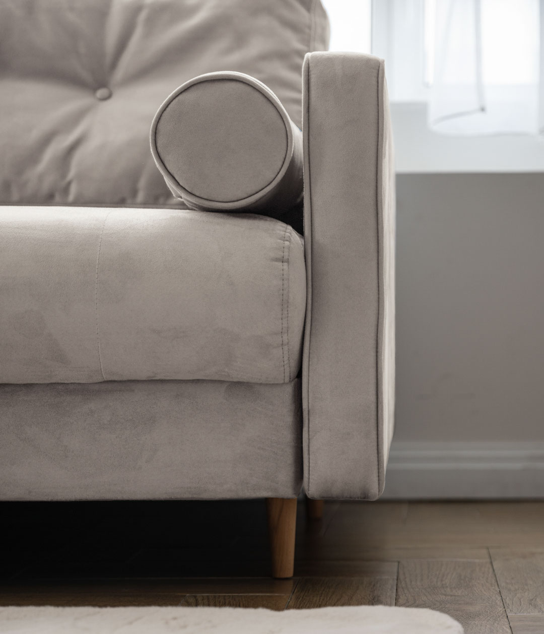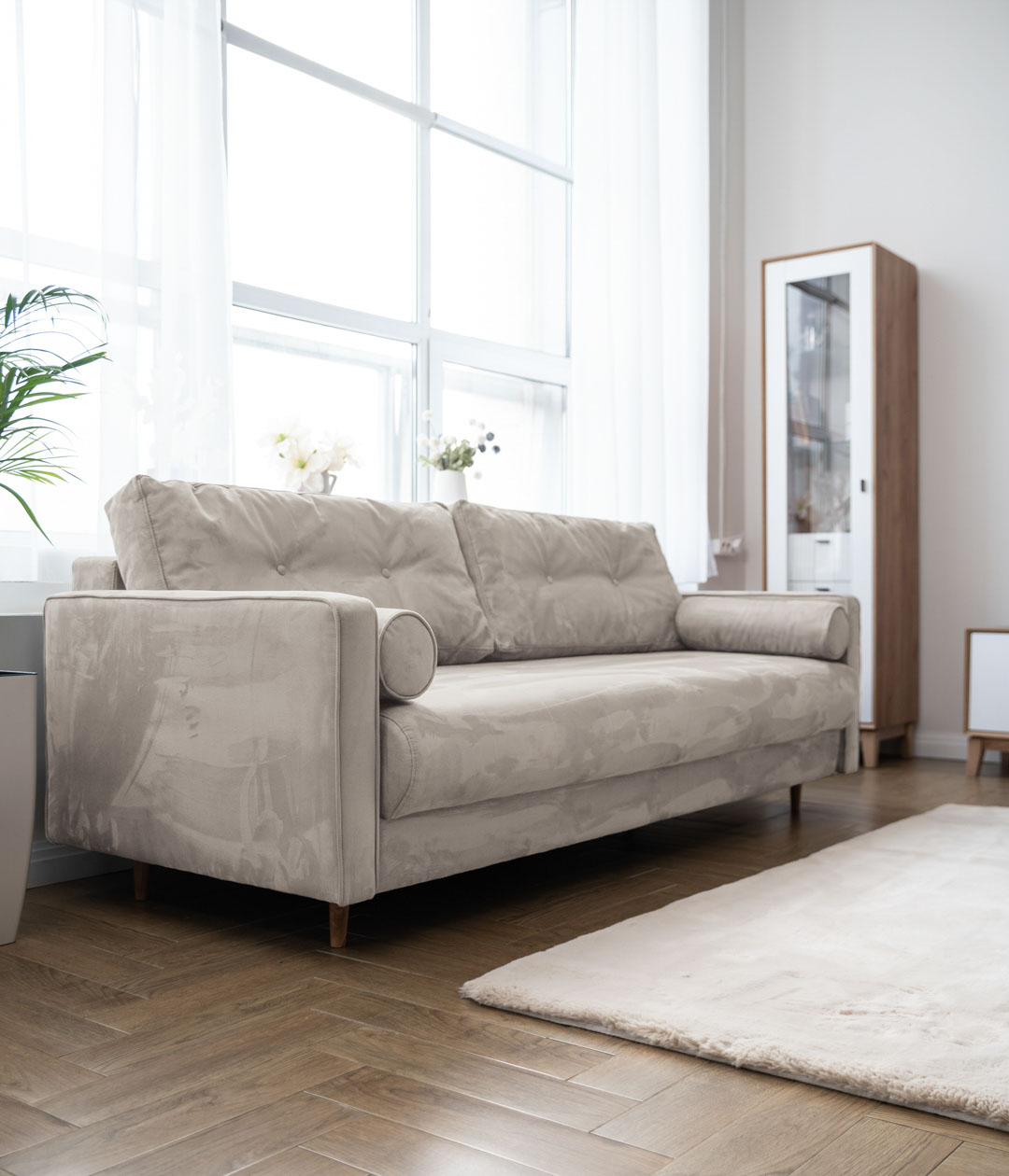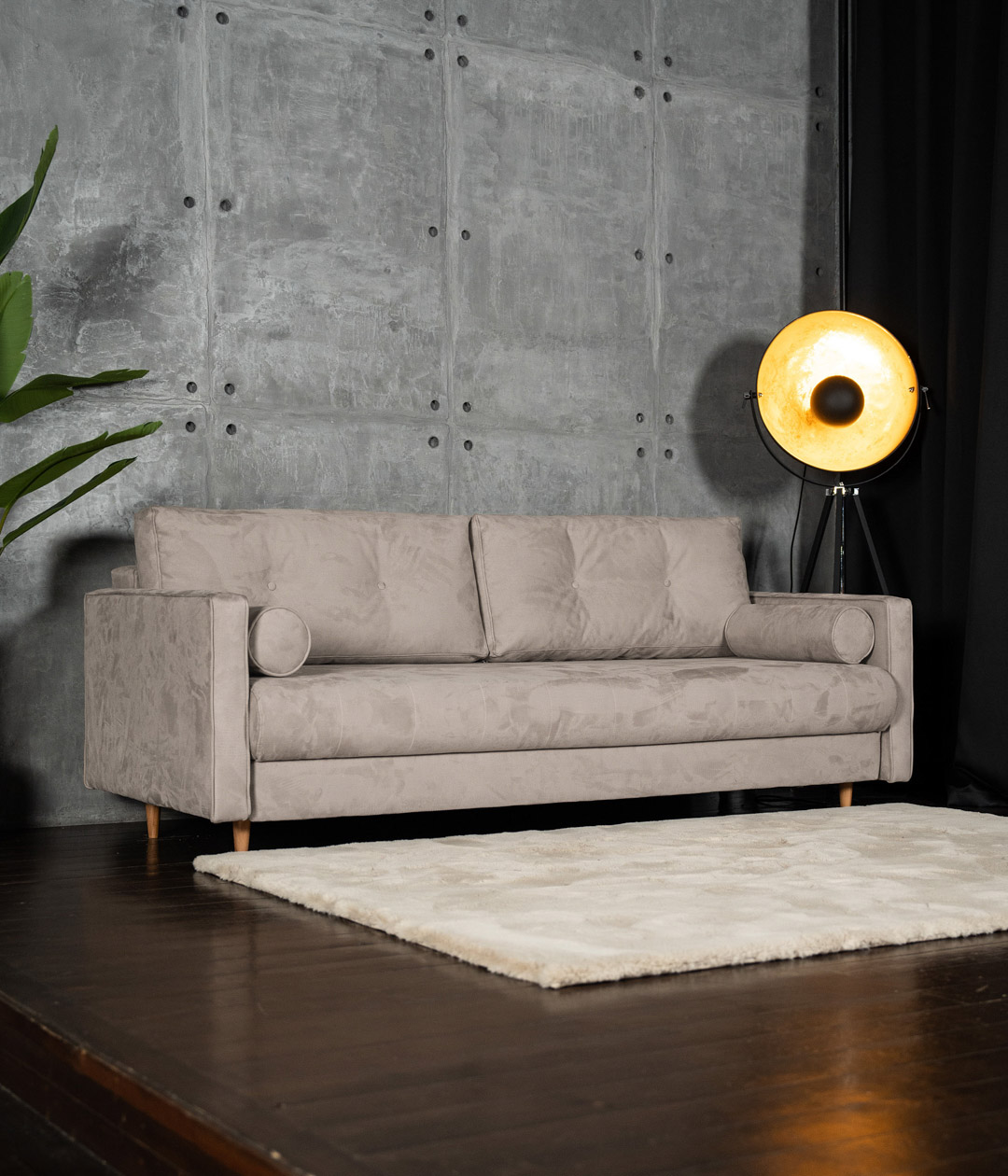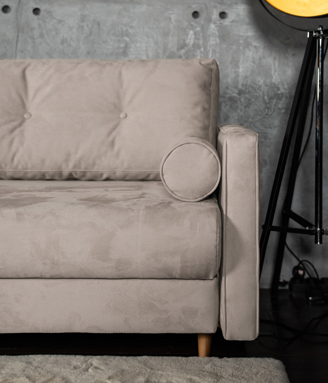 Высокие ножки дивана делают его форму легкой, максимально открывая пространство. А натуральное дерево подчеркивает естественность материалов. Кроме того, такая конструкция упрощает уборку, делая доступным напольное покрытие.