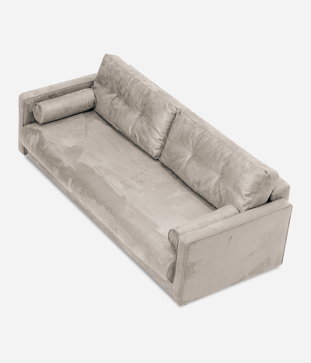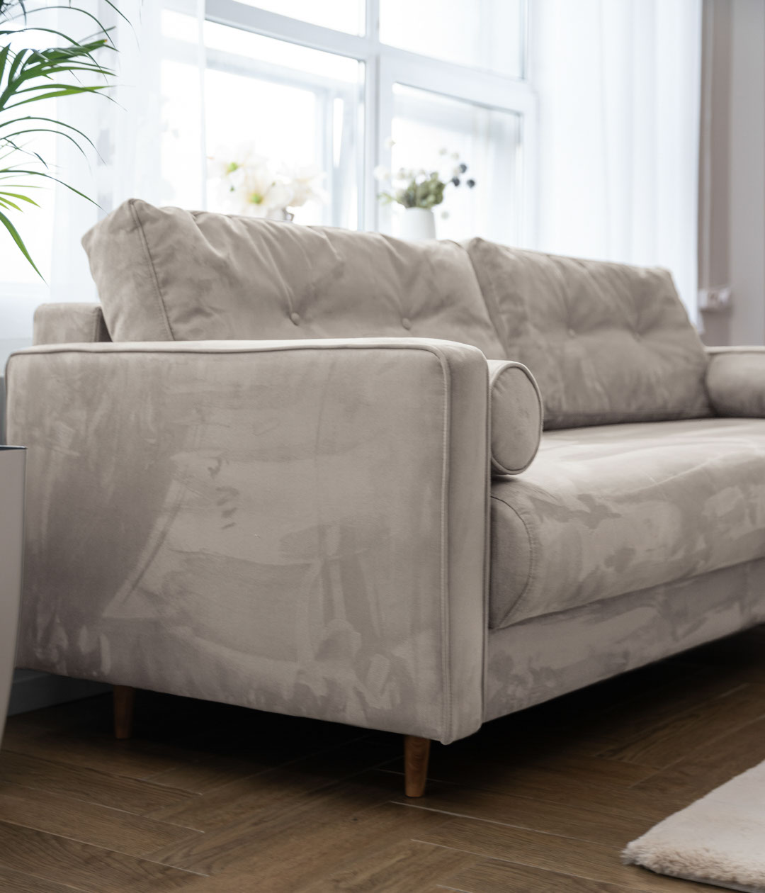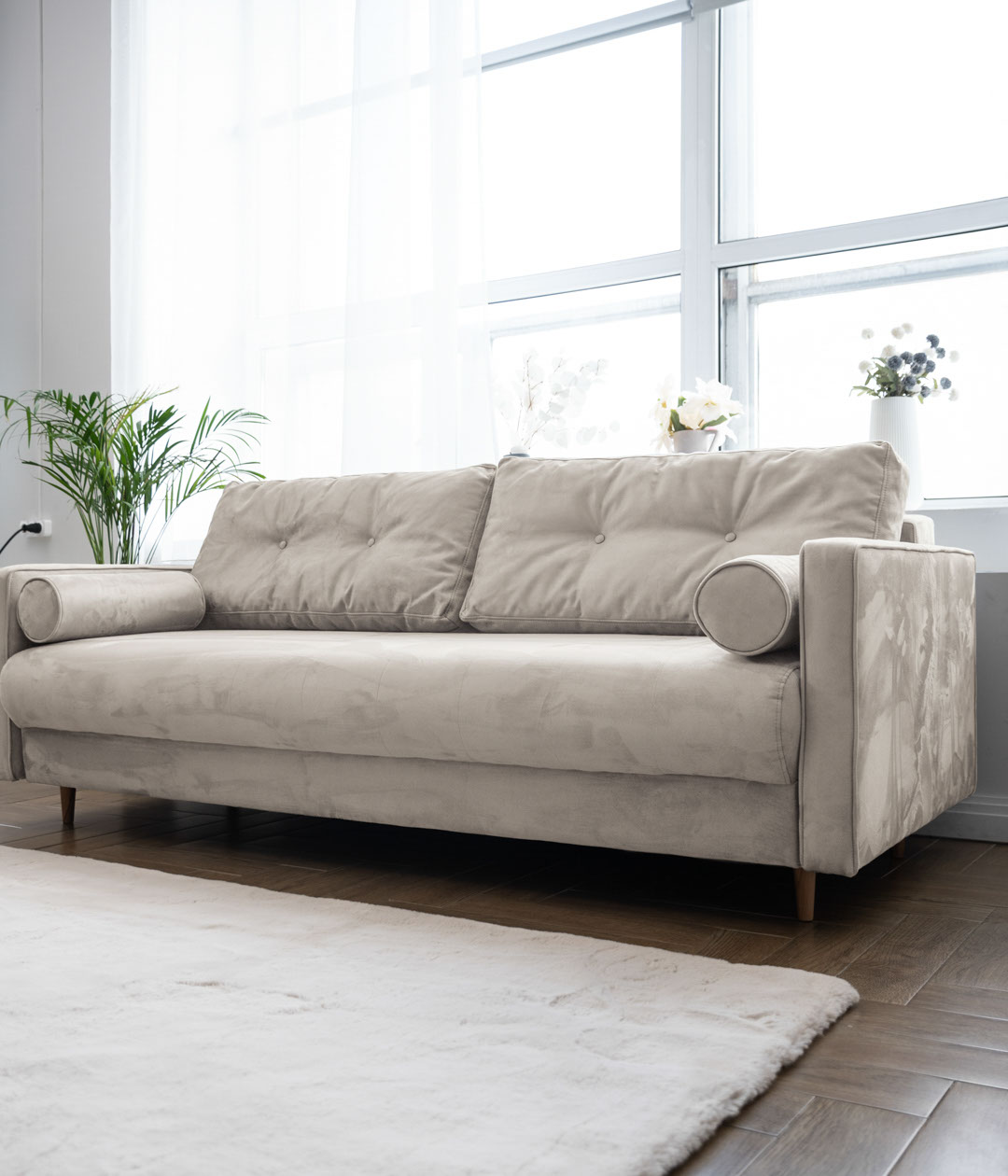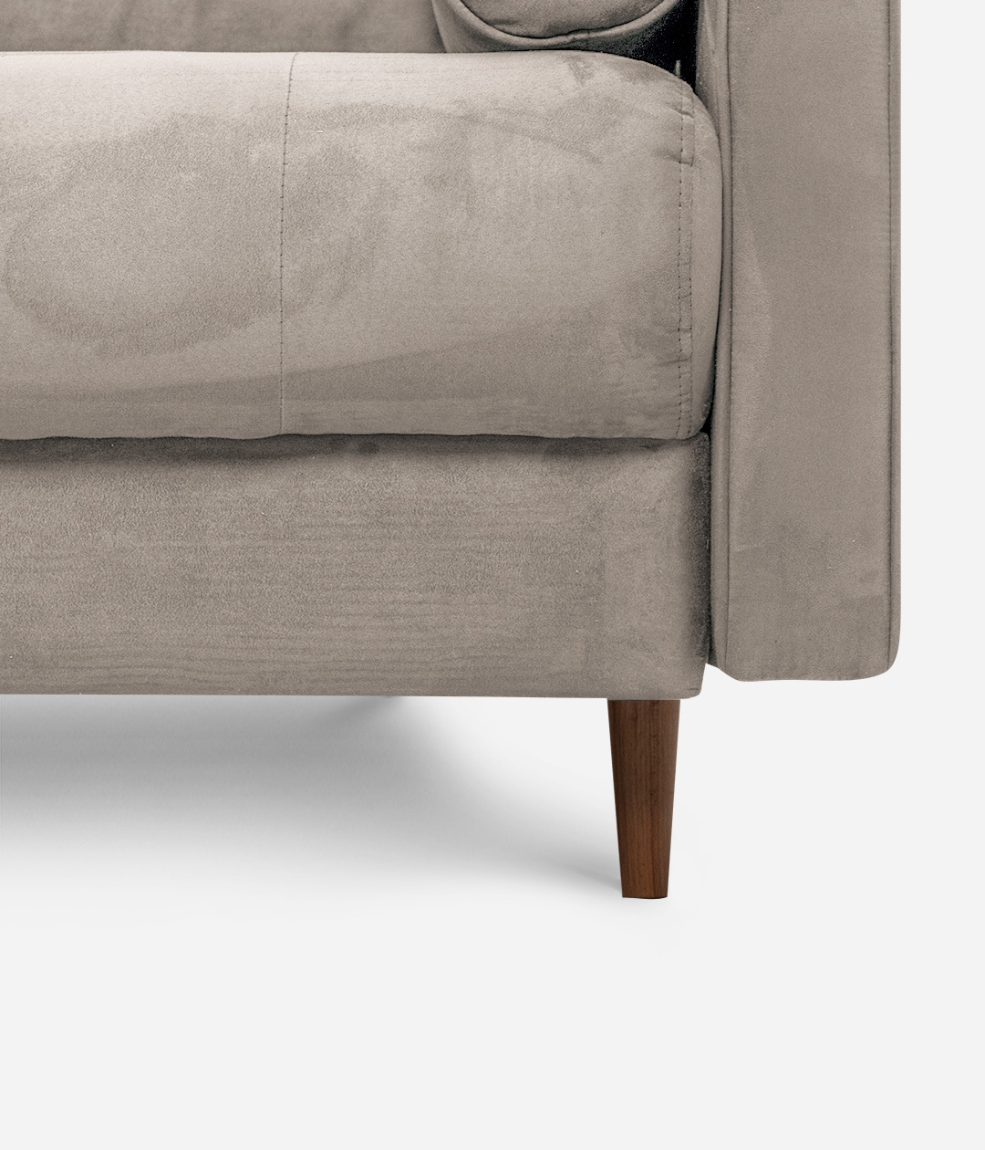 Высокие ножки дивана делают его форму легкой, максимально открывая пространство. А натуральное дерево подчеркивает естественность материалов. Кроме того, такая конструкция упрощает уборку, делая доступным напольное покрытие.