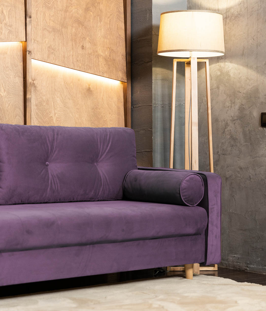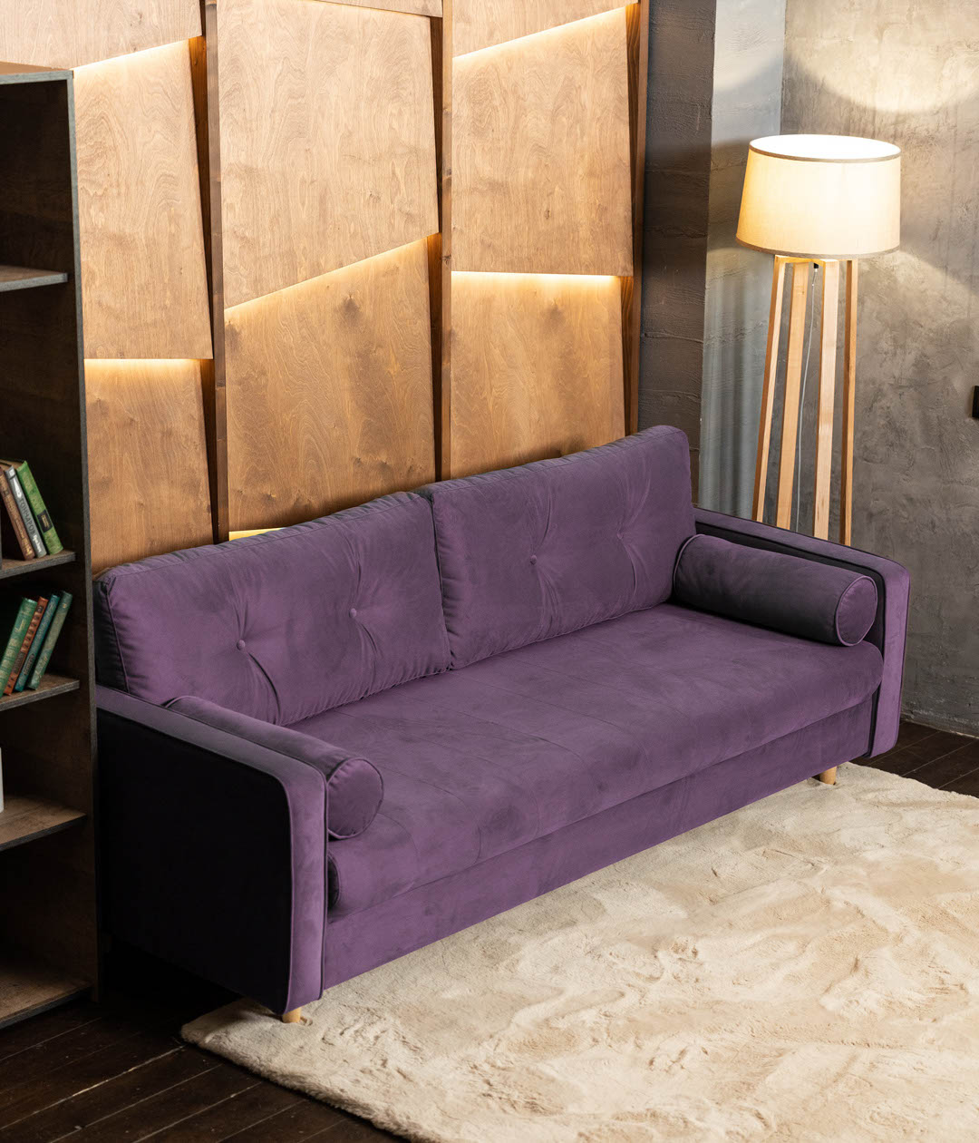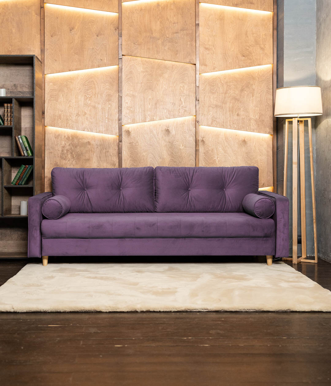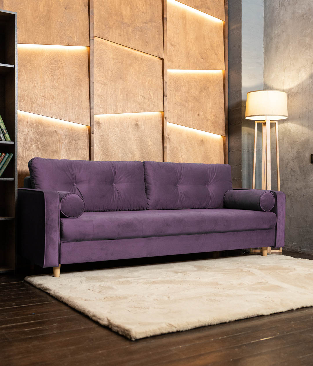 Высокие ножки дивана делают его форму легкой, максимально открывая пространство. А натуральное дерево подчеркивает естественность материалов. Кроме того, такая конструкция упрощает уборку, делая доступным напольное покрытие.