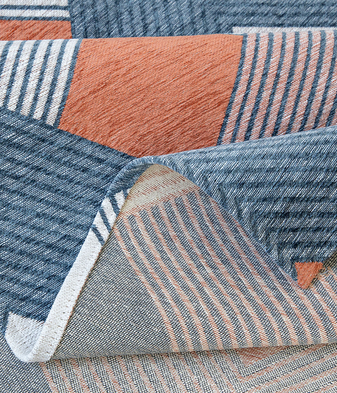 Необычное контрастное цветосочетание выделяет ковер LINE FROST среди остальных. Комбинация модного джинсового и пыльно-оранжевого оттенков органично впишется в современный интерьер в спокойной цветовой гамме. Шенилловый ковер из натуральных материалов станет великолепным акцентом, дополняющим общую композицию.
