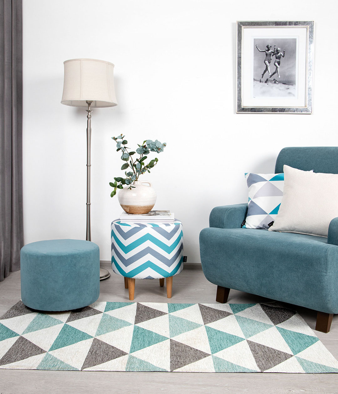 Ковер LINE NILS. Скандинавские мотивы нашли отражение в лаконичном дизайне ковра - четкий геометрический рисунок и практичная шенилловая основа. Все это соответствует основным принципам популярного стиля - минимализм и функциональность. Микс нежно-ментоловых и серо-графитовых треугольников на светлой основе делает рисунок ковра объемным.