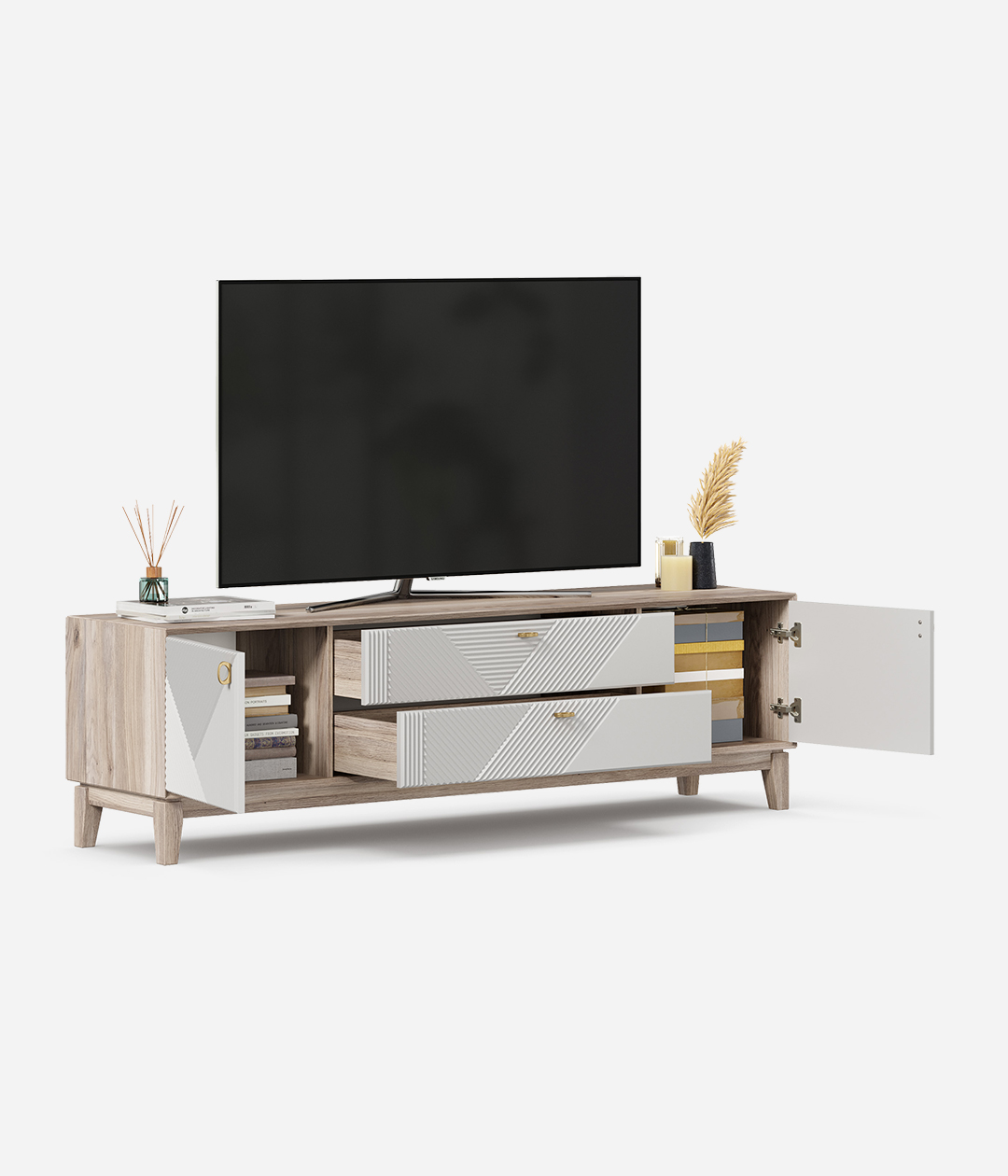Функциональная и надёжная ТВ-тумба Липари — это залог уютного и аккуратного интерьера. Комбинированное наполнение предусматривает отделения за распашными дверцами, а также ящики полного выдвижения. Высокие ножки не перегружают обстановку и позволяют удобно проводить уборку.