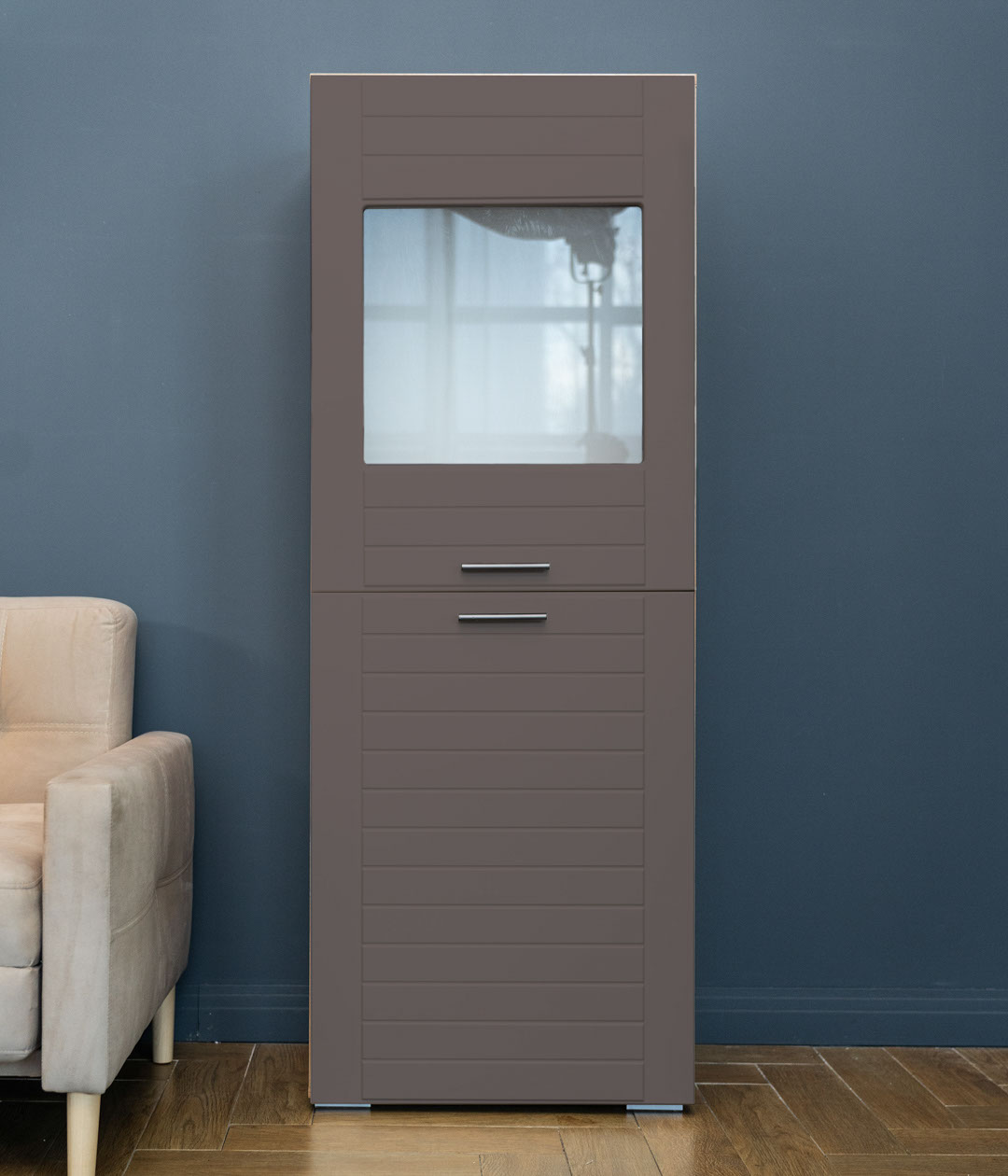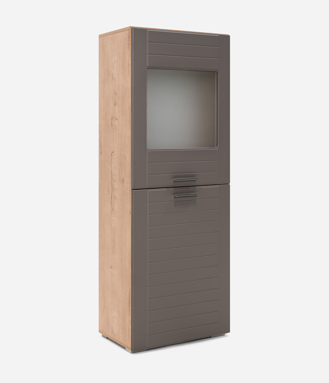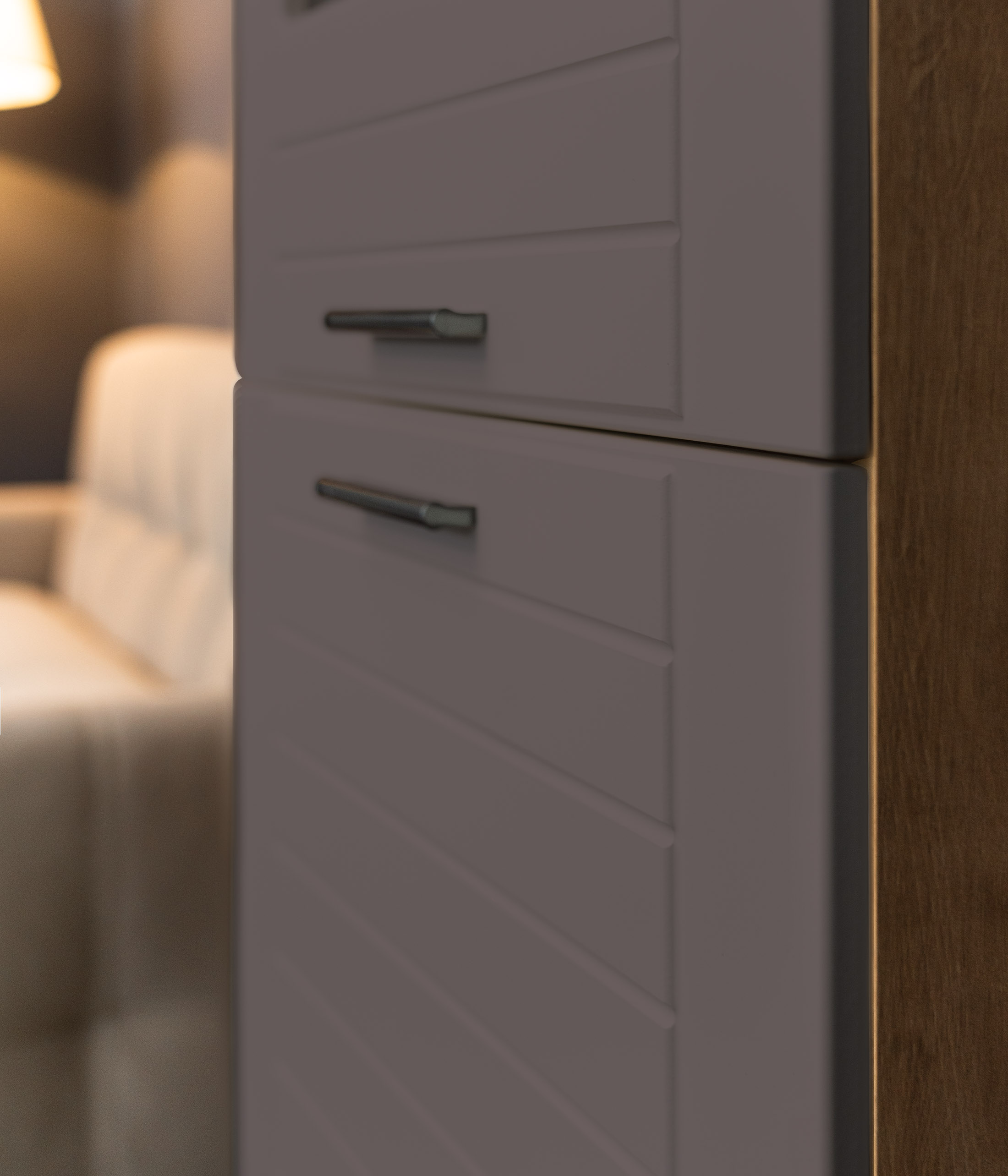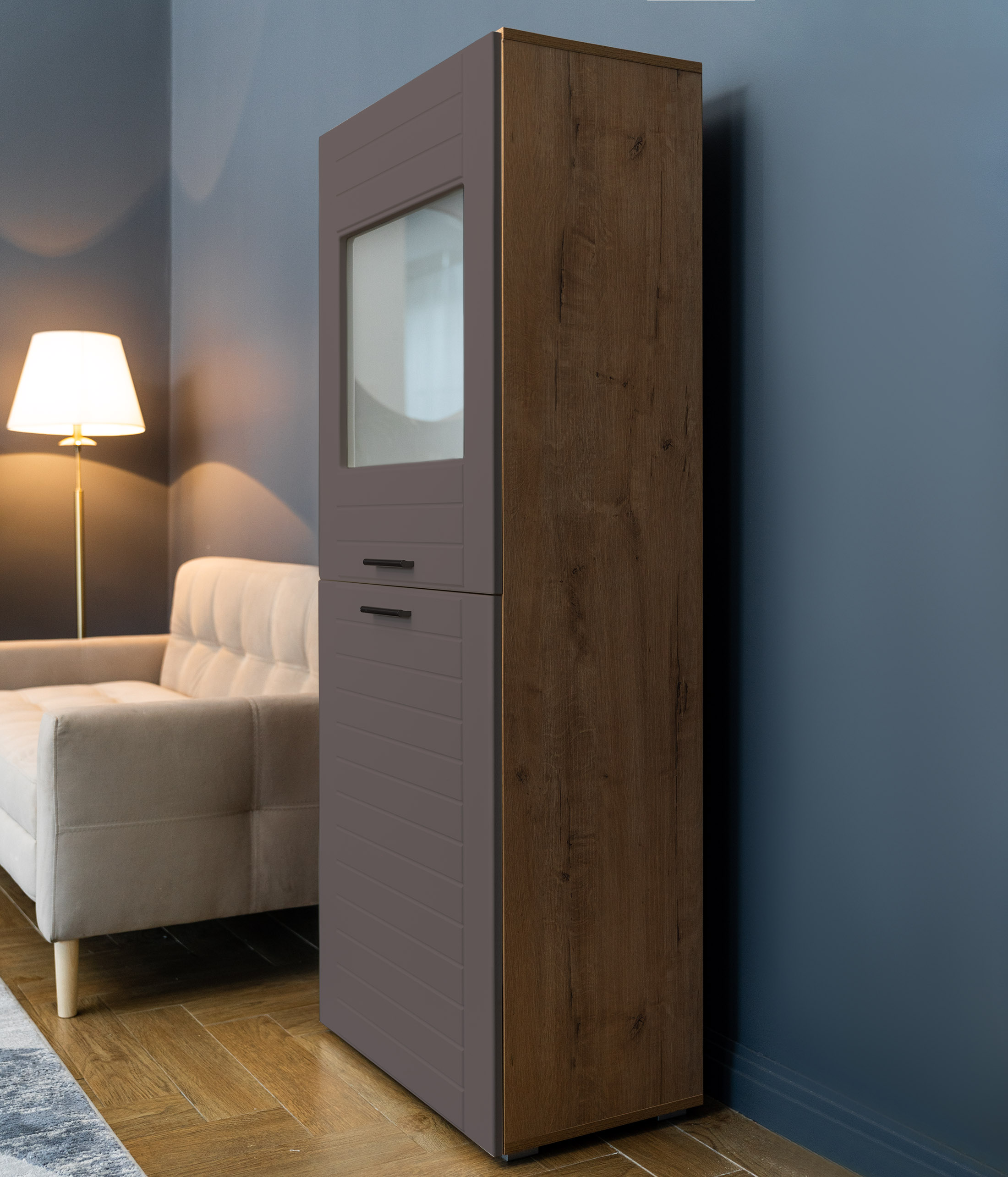 Двухстворчатый шкаф Livorno придаст интерьеру гостиной современный вид за счет сочетания фасадов в трендовых тонах: графит или панакота с имитацией древесной текстуры на каркасе. За глухой дверцей скрывается полка для книг и ценных вещей. Другой фасад оснащен витриной из матового стекла, которая делает видимыми только очертания находящихся за ней предметов, что является оригинальным дизайнерским решением.