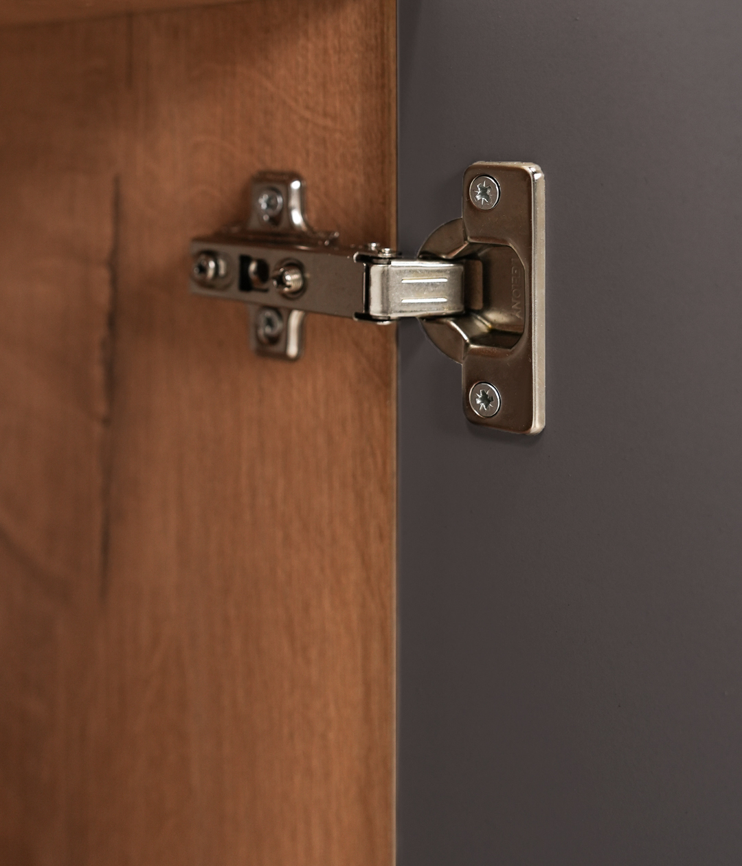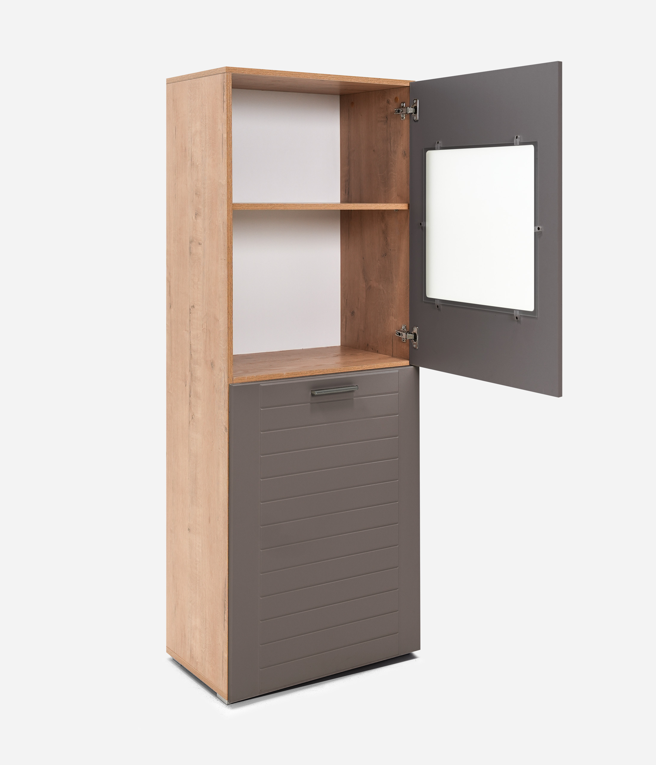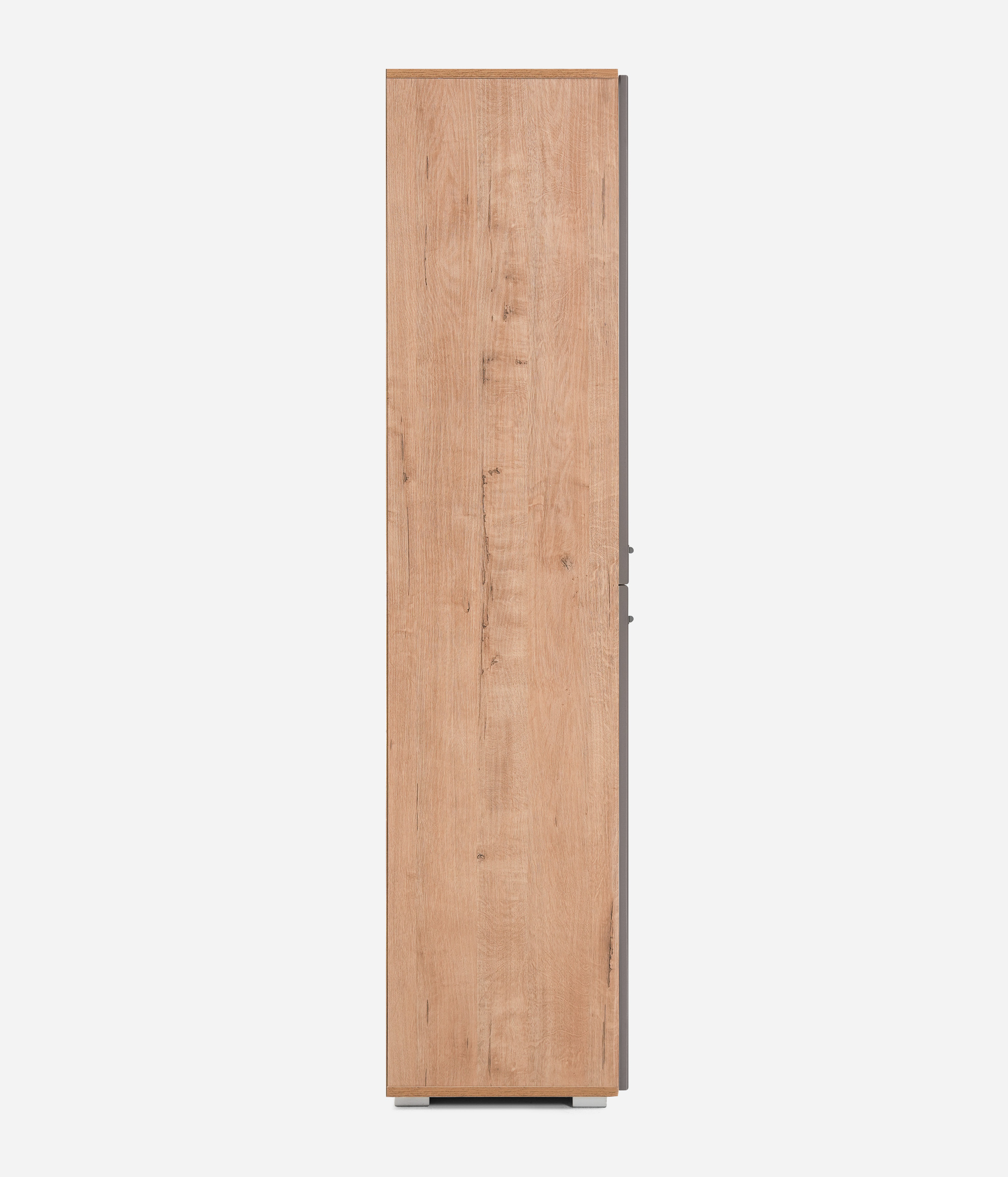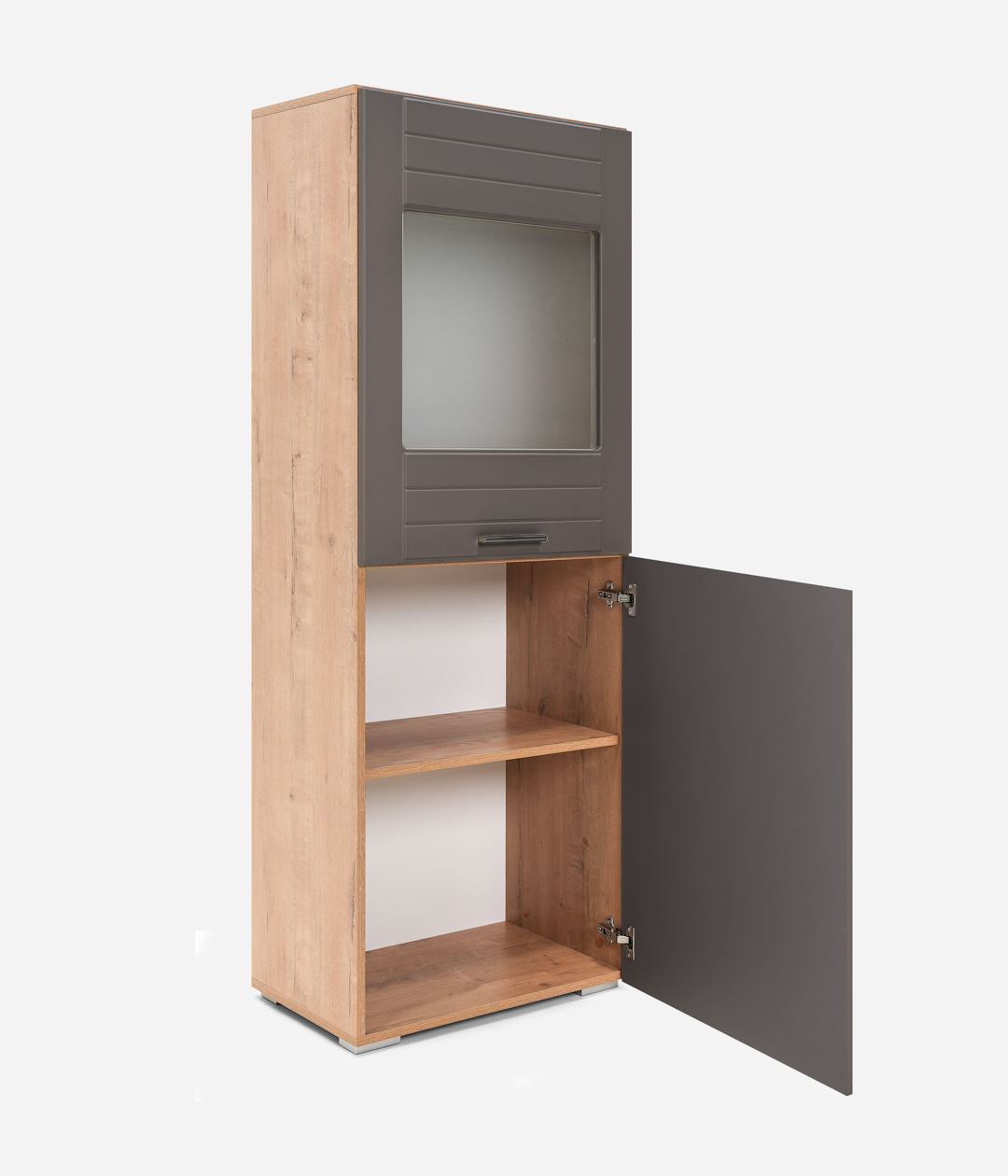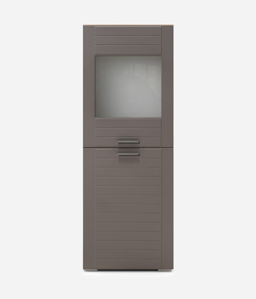 Двухстворчатый шкаф Livorno придаст интерьеру гостиной современный вид за счет сочетания фасадов в трендовых тонах: графит или панакота с имитацией древесной текстуры на каркасе. За глухой дверцей скрывается полка для книг и ценных вещей. Другой фасад оснащен витриной из матового стекла, которая делает видимыми только очертания находящихся за ней предметов, что является оригинальным дизайнерским решением.