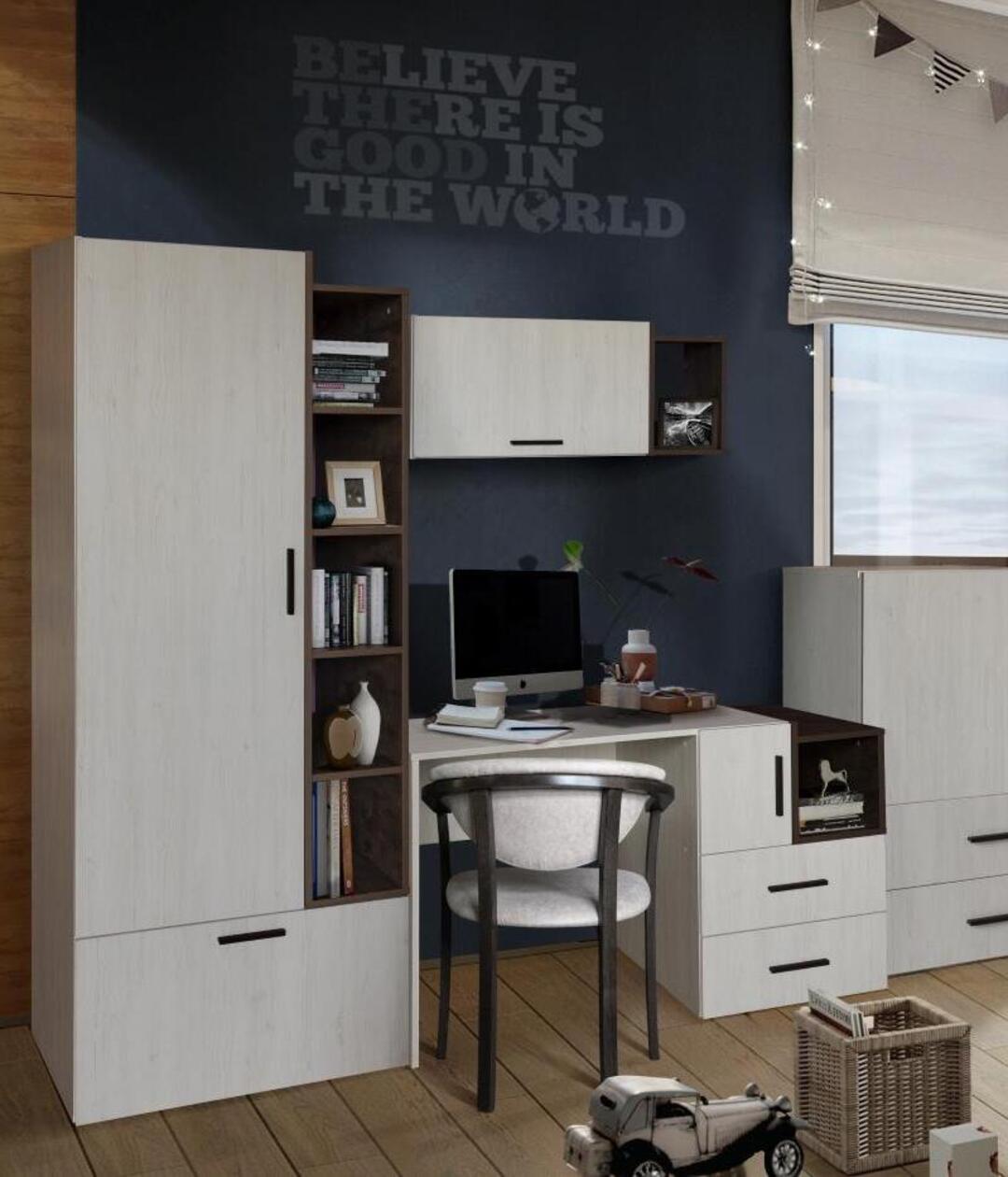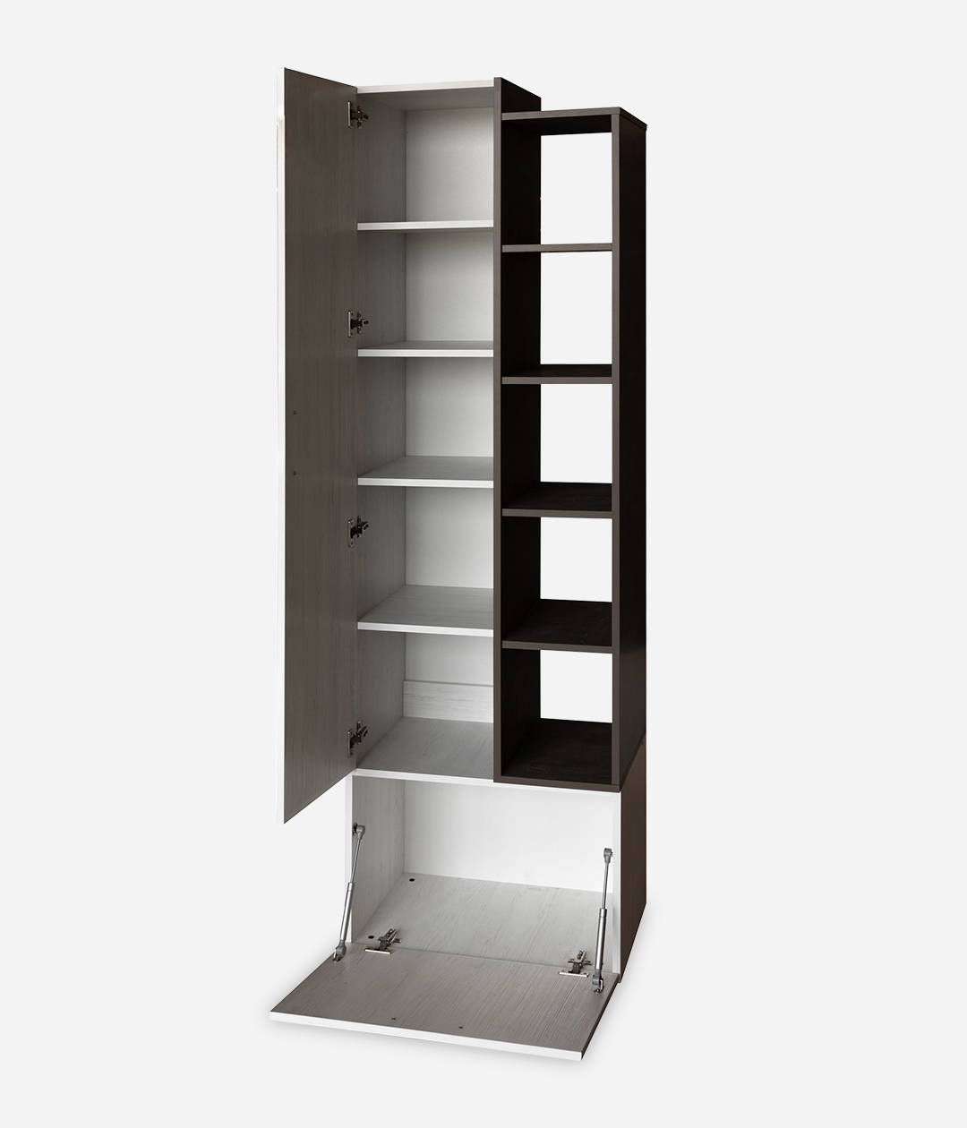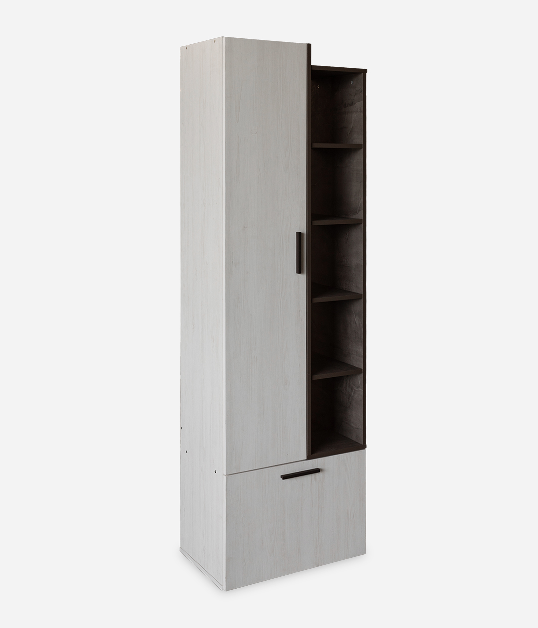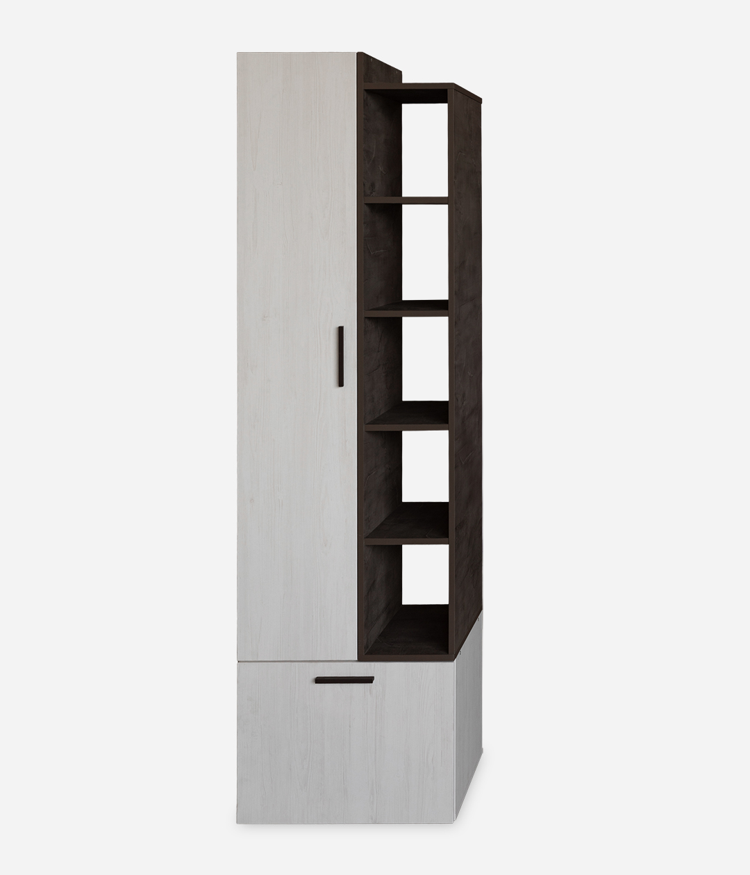 Шкаф со стеллажом Luna — продуманная до мелочей конструкция, в которой найдётся место для всех необходимых вещей. На открытых полках можно красиво расставить фотографии, игрушки и книги, а одежду удобно разложить по полочкам и развесить на штанге, спрятав за распашными дверцами.