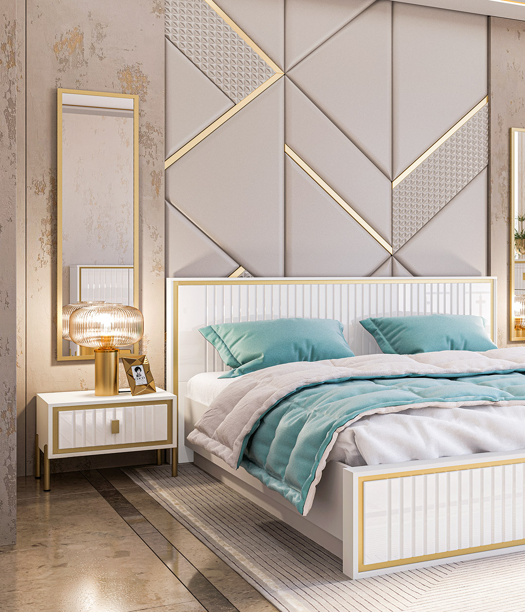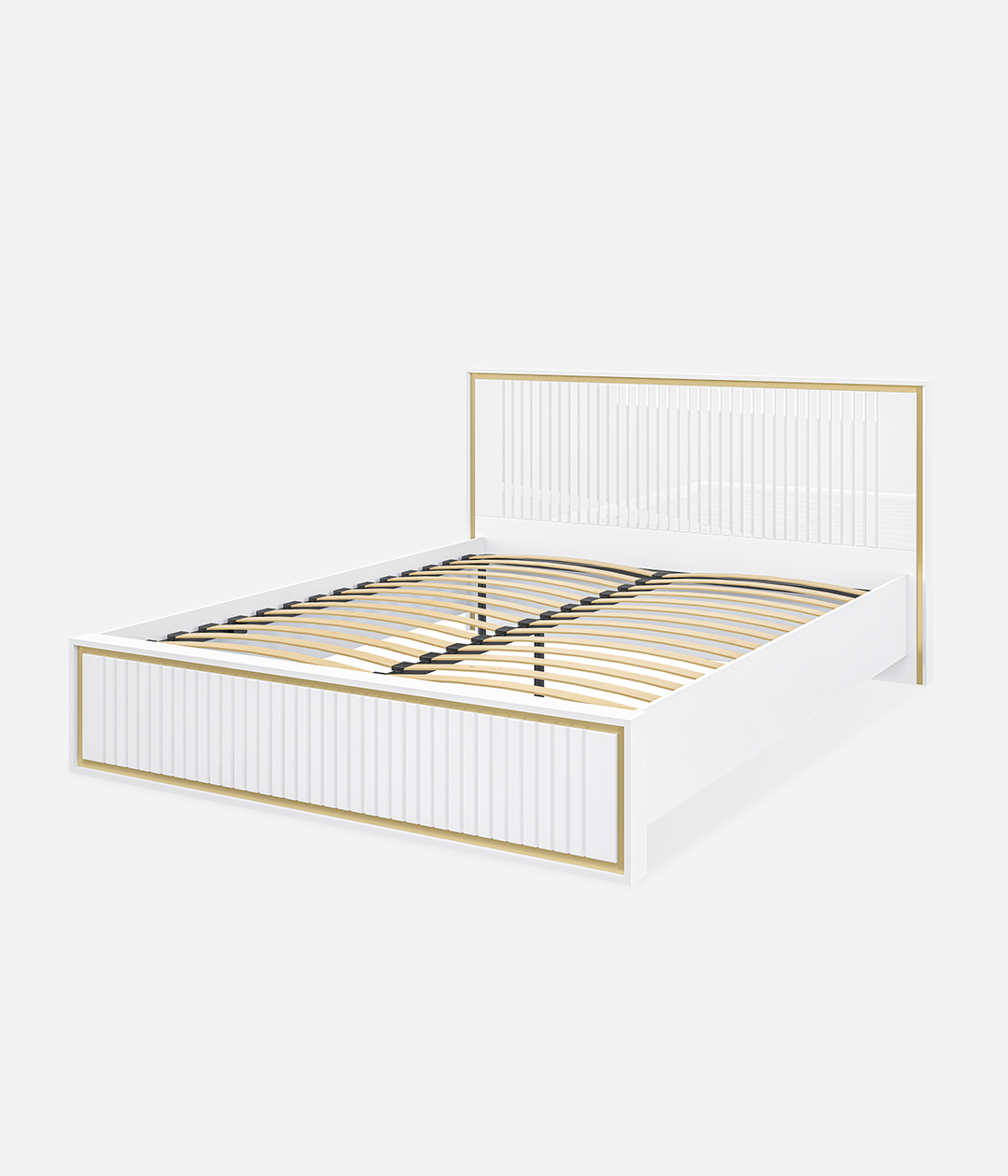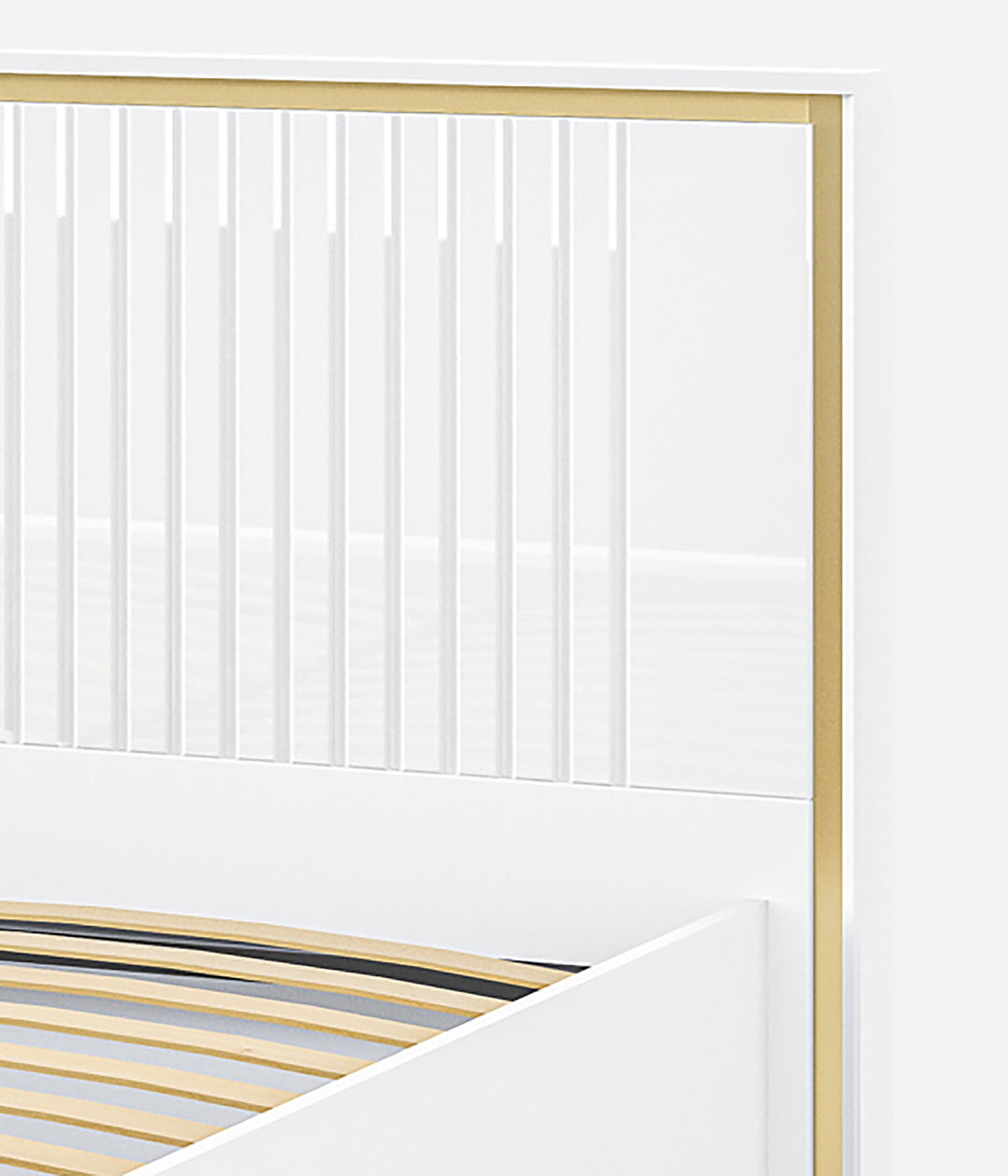 Двуспальная кровать «Люксор» выглядит максимально элегантно благодаря декоративной золотой окантовке и цветовому решению. Белый цвет кровати наполняет интерьер лёгкостью и свежестью. Кровать подходит для современных интерьеров или в стиле классика, неоклассика.