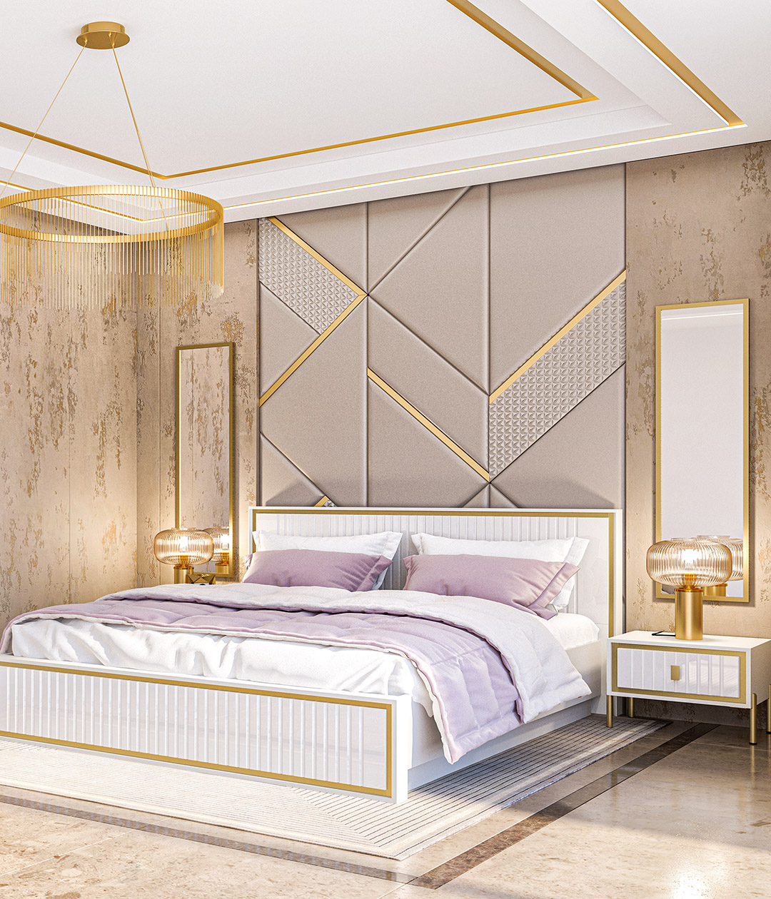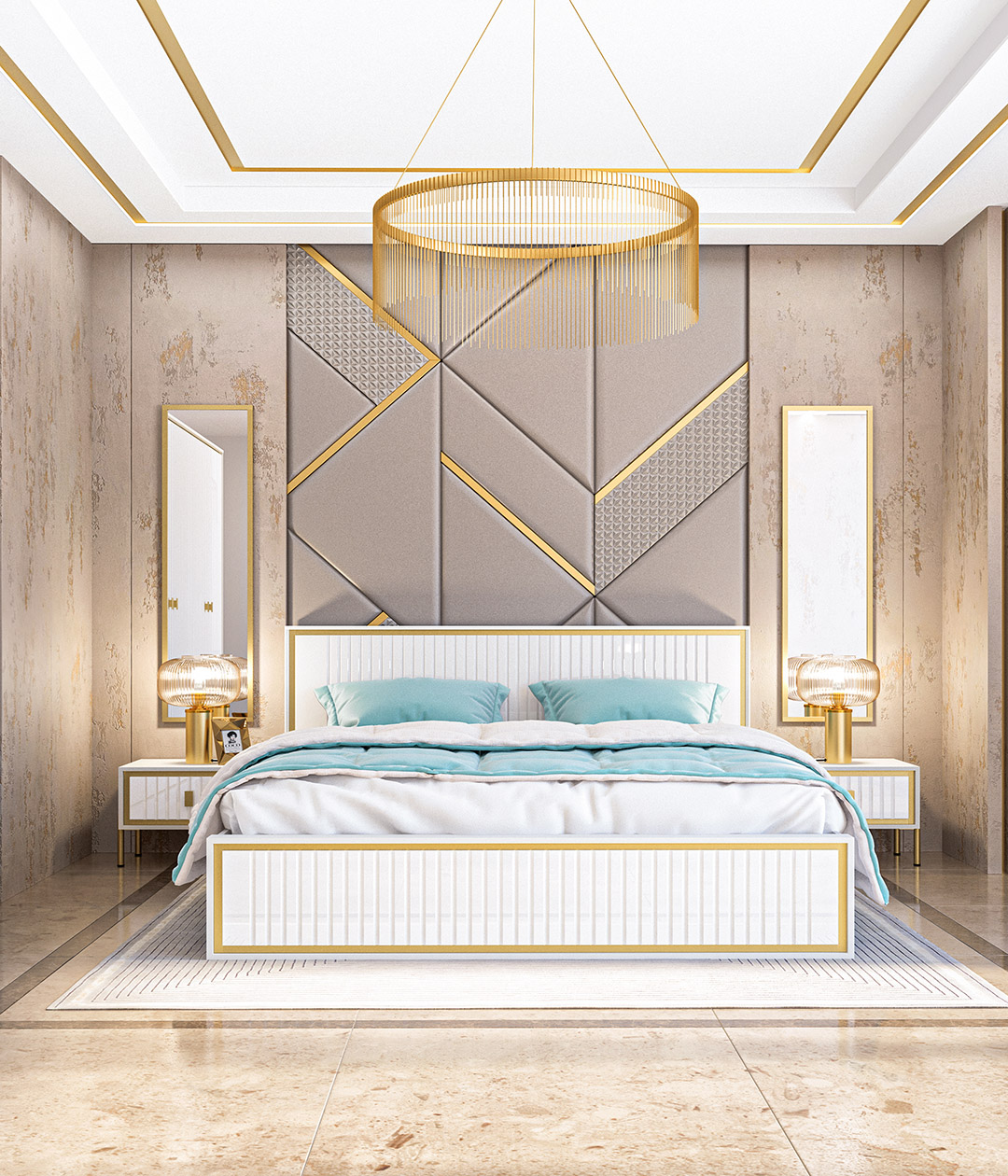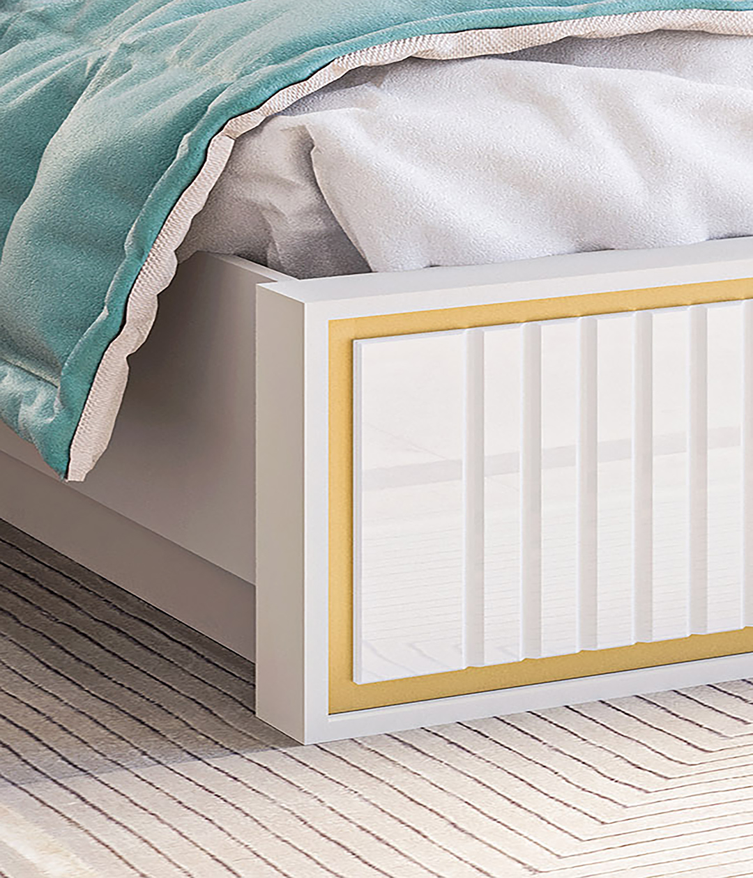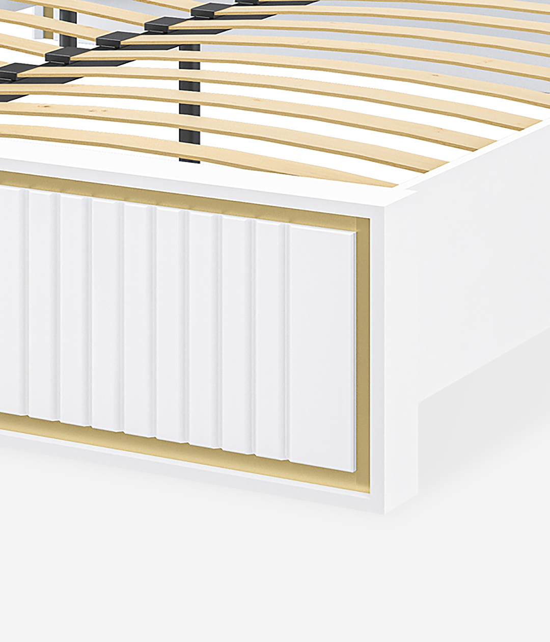 Двуспальная кровать «Люксор» выглядит максимально элегантно благодаря декоративной золотой окантовке и цветовому решению. Белый цвет кровати наполняет интерьер лёгкостью и свежестью. Кровать подходит для современных интерьеров или в стиле классика, неоклассика.