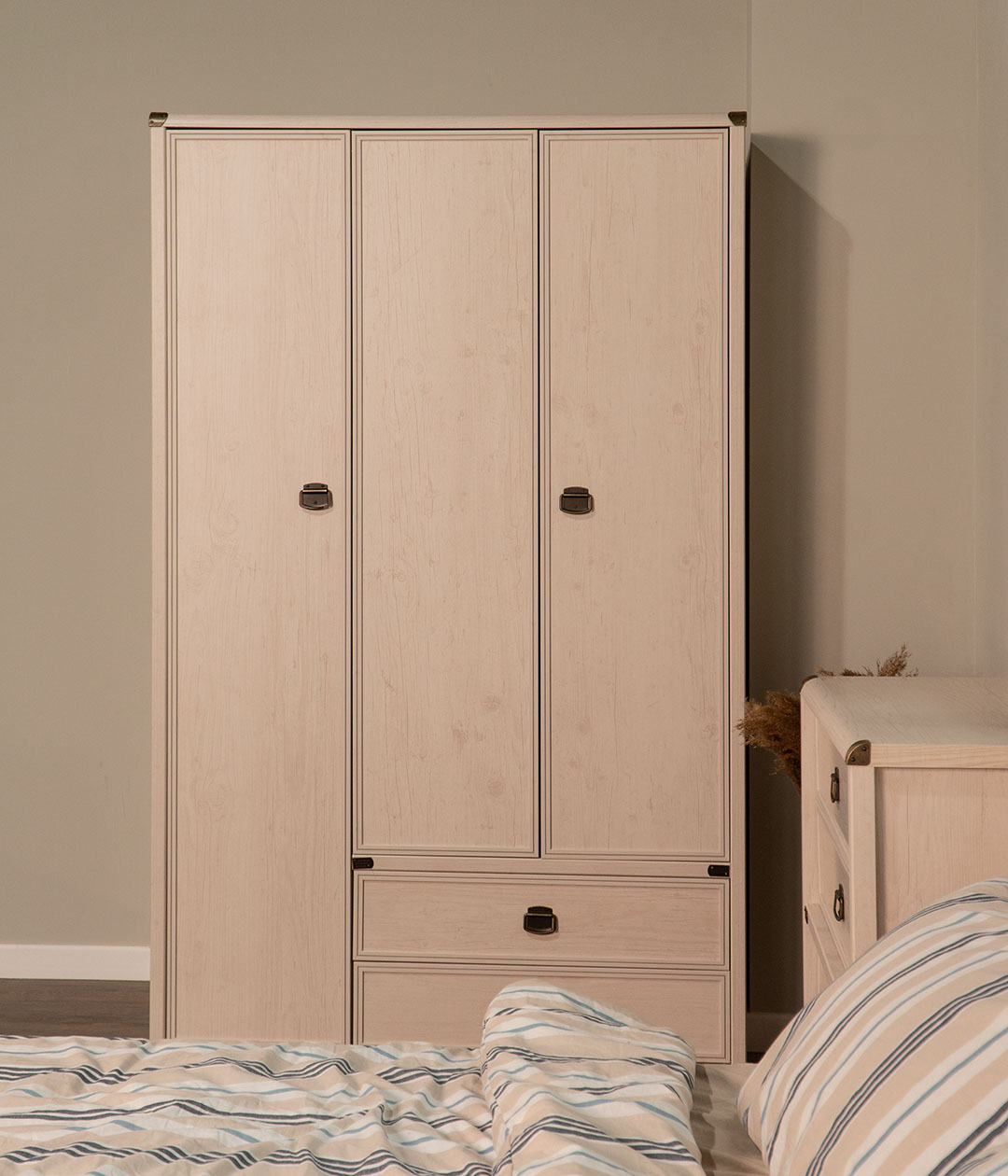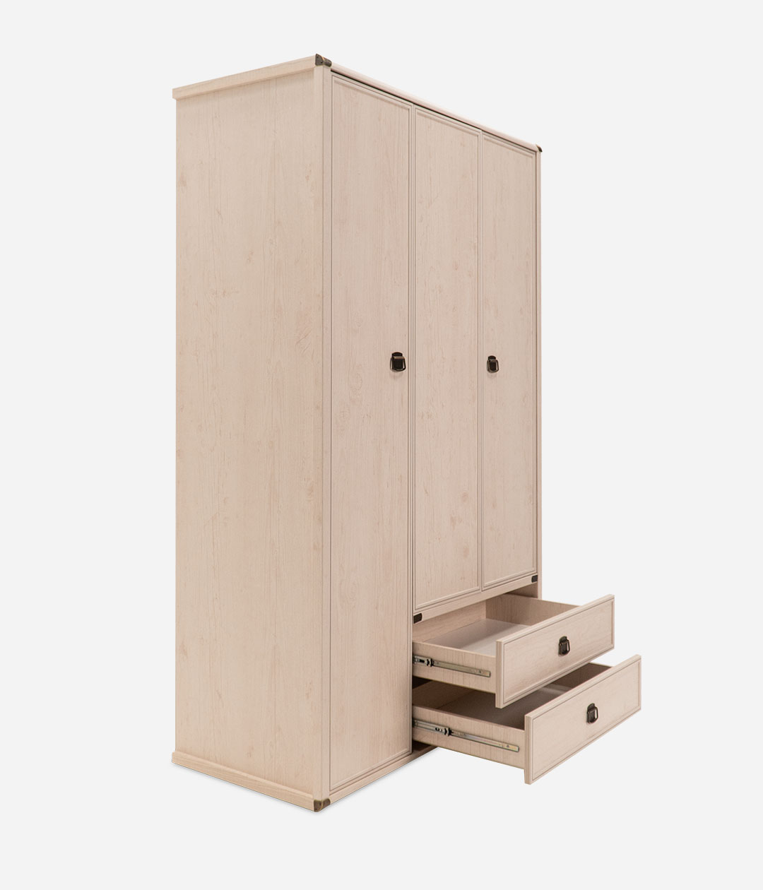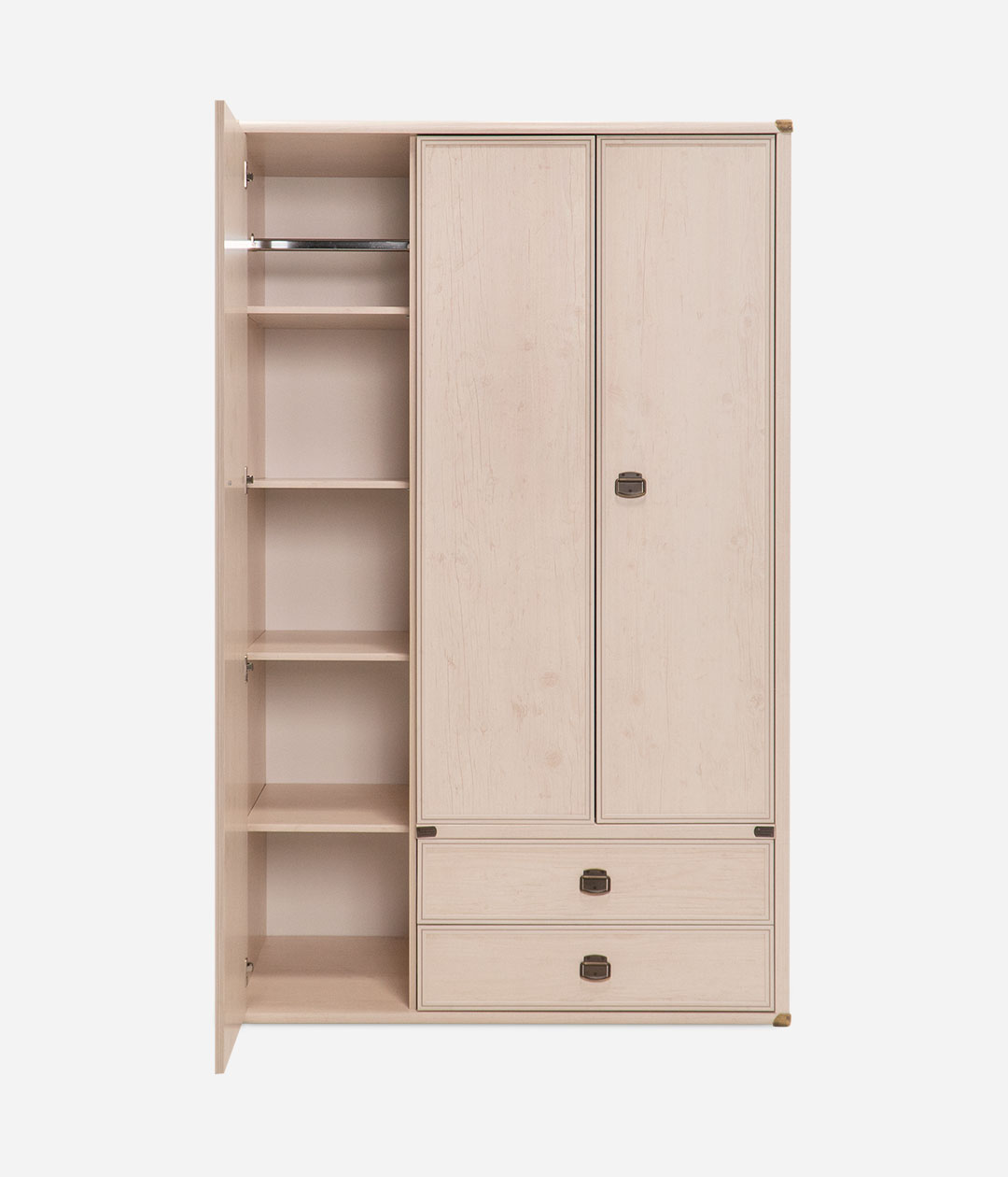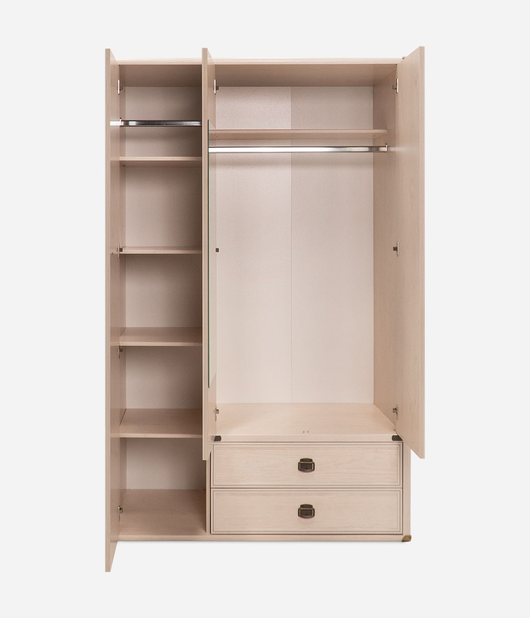 Шкаф платяной Магеллан отличается продуманной функциональностью и стильным исполнением. Системой хранения предусмотрены полочки и выдвижной ящик на шариковых направляющих.