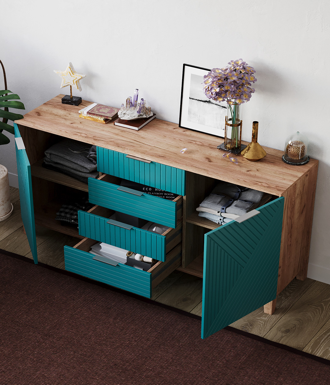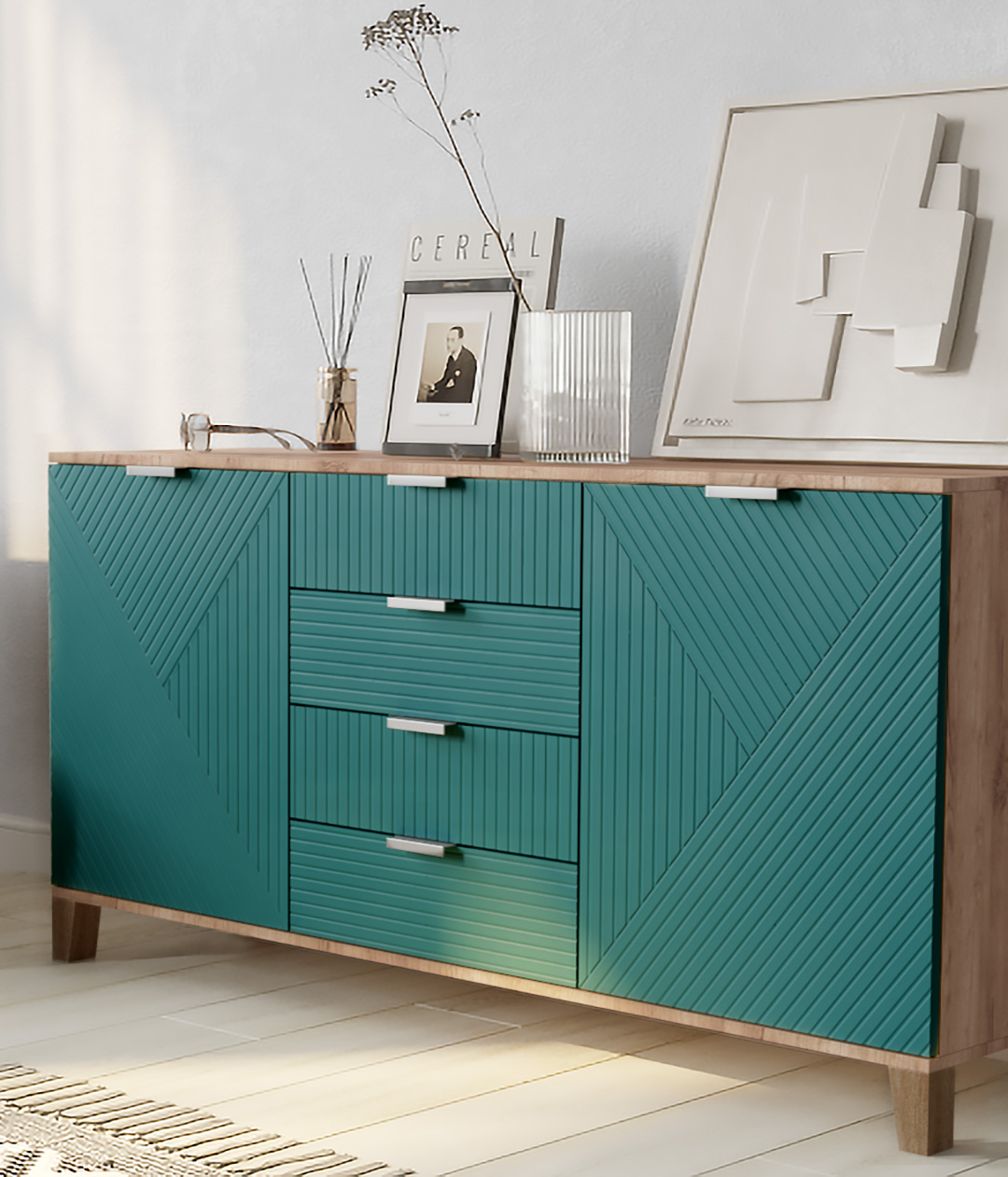 Стильный и практичный комод, решит как минимум две ваших задачи, будет служить многофункциональной нишей для хранения вещей, одежды, белья и универсальной подставкой для различных предметов интерьера, а также можно использовать в виде тумбы под телевизор.
