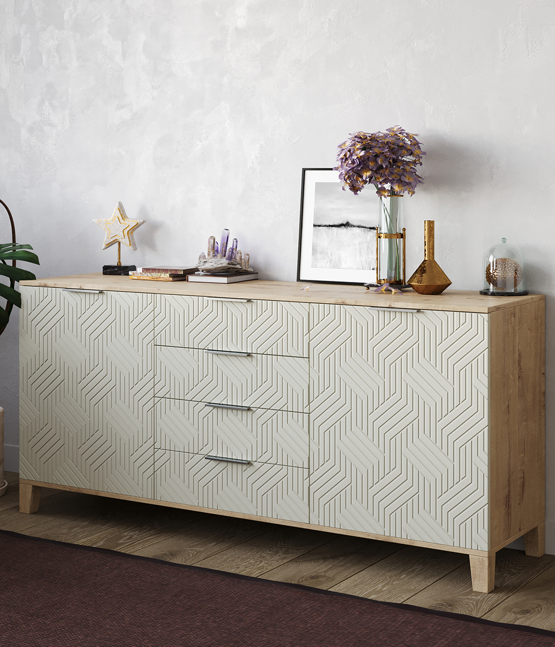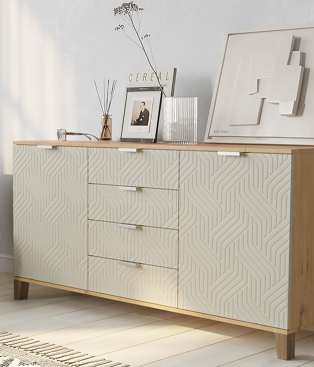Стильный и практичный комод, решит как минимум две ваших задачи, будет служить многофункциональной нишей для хранения вещей, одежды, белья и универсальной подставкой для различных предметов интерьера, а также можно использовать в виде тумбы под телевизор.
