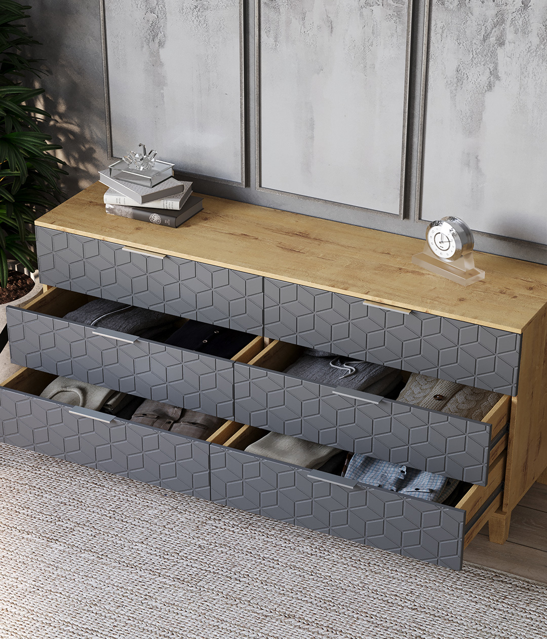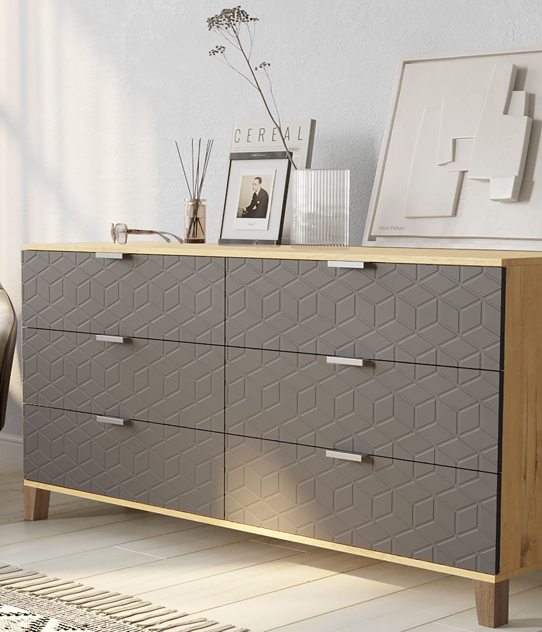 Стильный и практичный комод, решит как минимум две ваших задачи, будет служить многофункциональной нишей для хранения вещей, одежды, белья и универсальной подставкой для различных предметов интерьера, а также можно использовать в виде тумбы под телевизор.