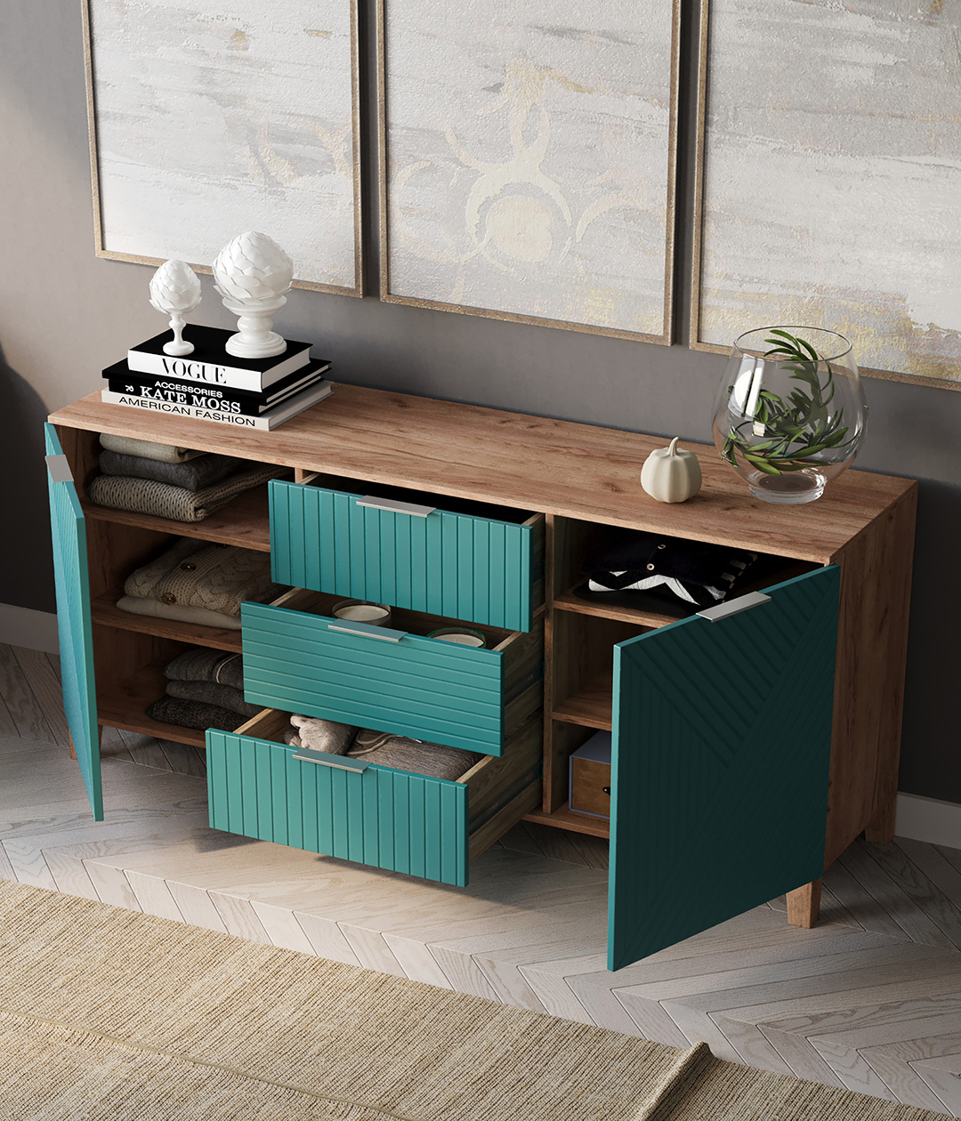 Стильный и практичный комод, решит как минимум две ваших задачи, будет служить многофункциональной нишей для хранения вещей, одежды, белья и универсальной подставкой для различных предметов интерьера, а также можно использовать в виде тумбы под телевизор.