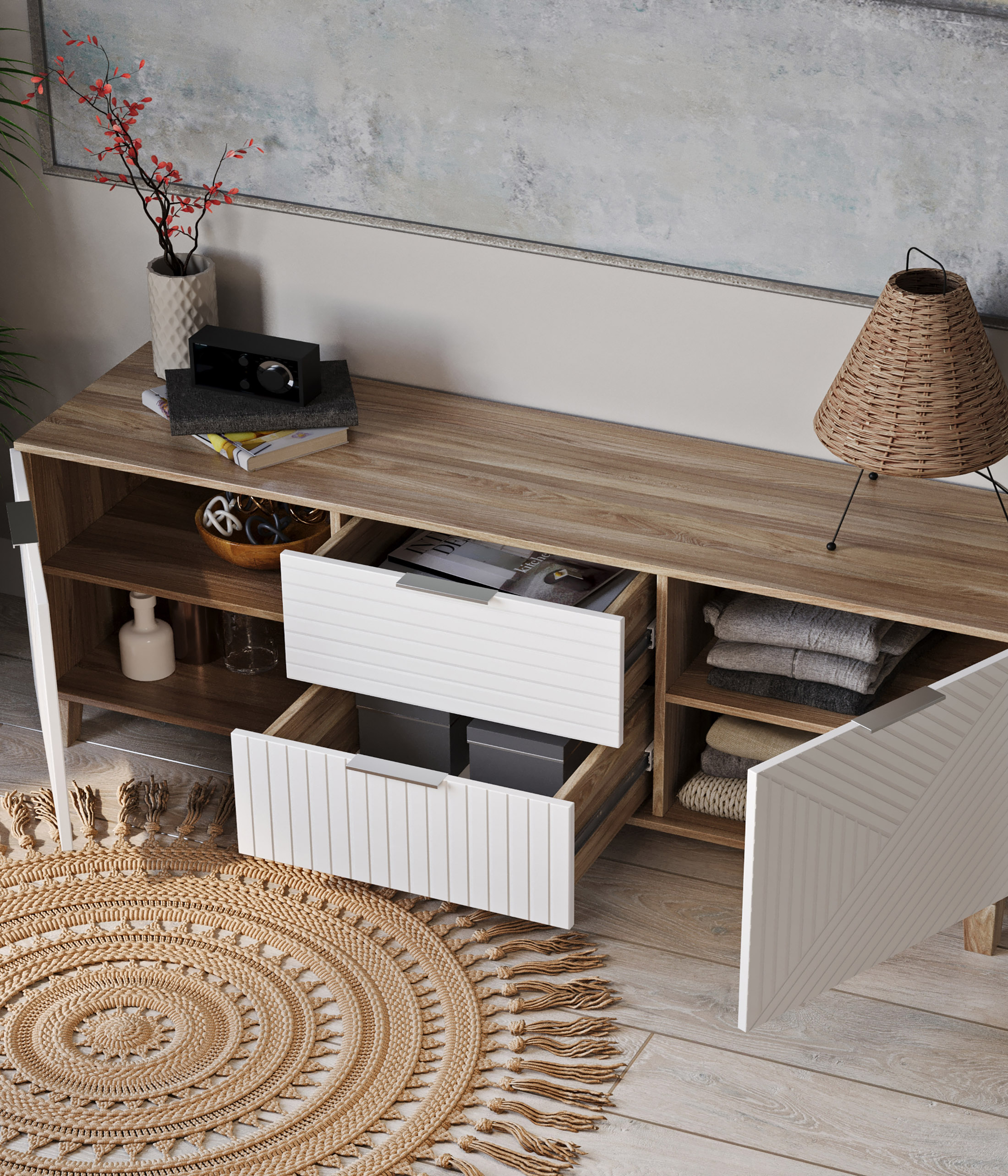 Стильная и практичная тумба, решит как минимум две ваших задачи, будет служить многофункциональной нишей для хранения вещей, одежды, белья и универсальной подставкой для различных предметов интерьера, а также можно использовать в виде тумбы под телевизор.
