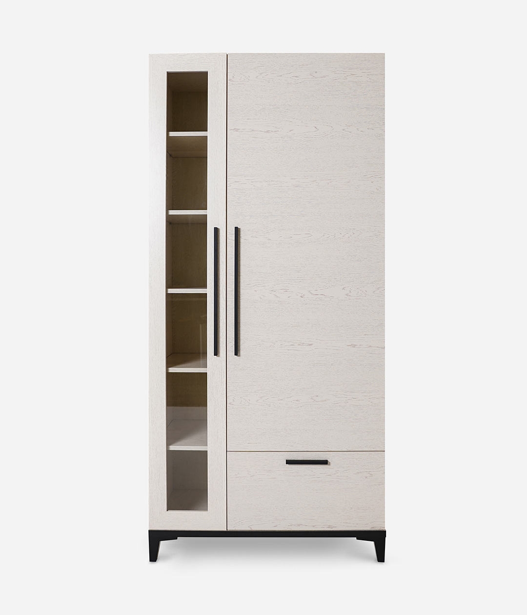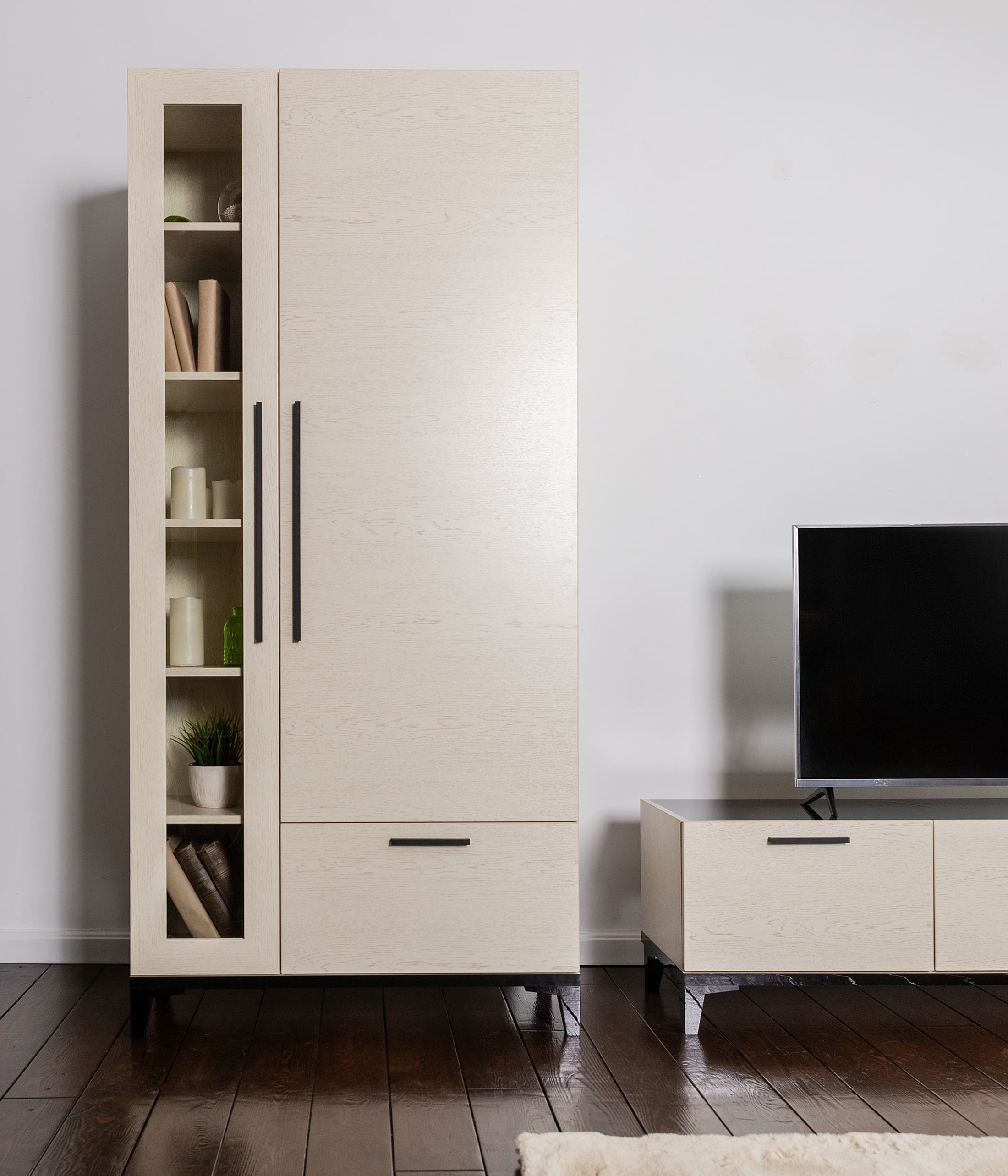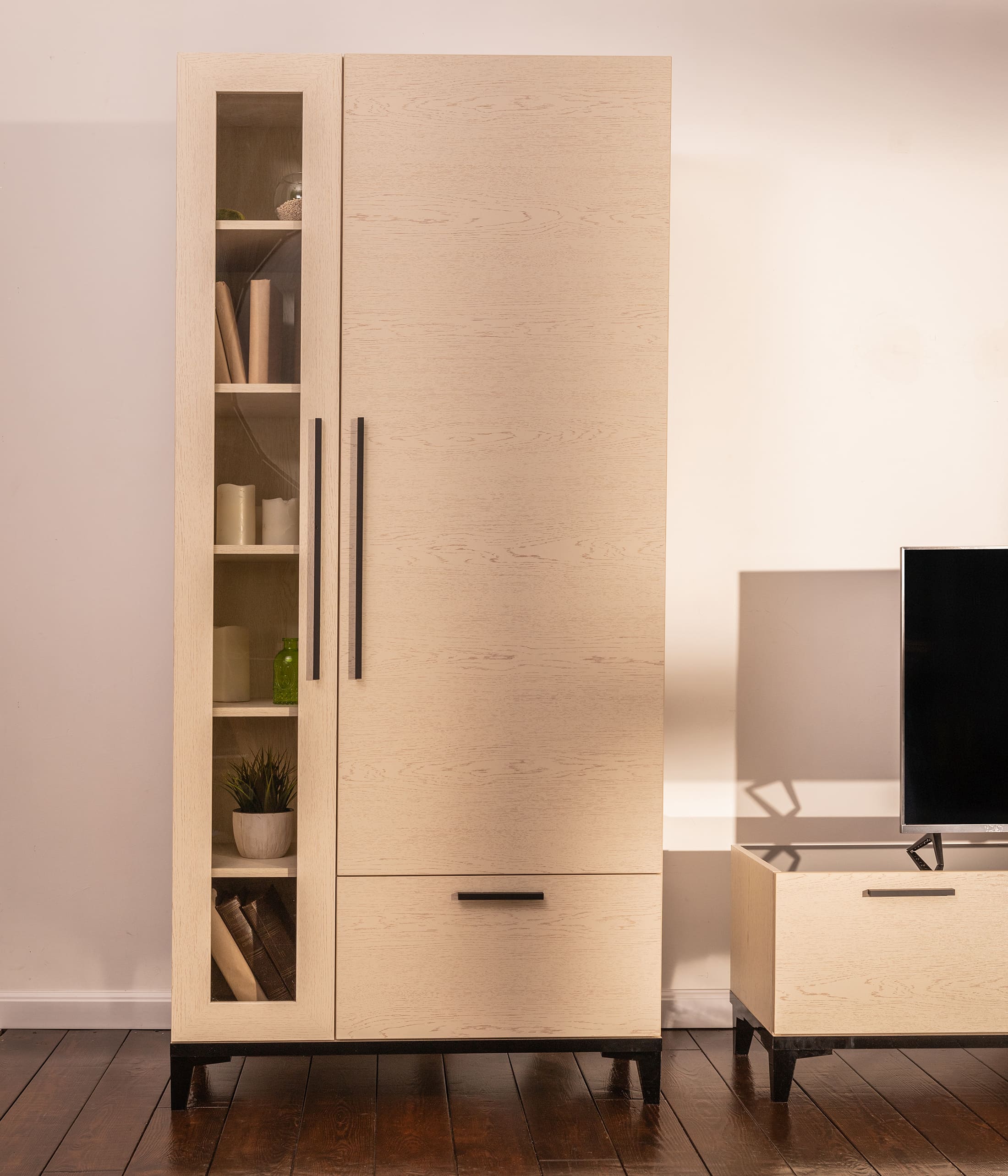 Наполнение шкафа порадует вас своей функциональностью. Отделение со стеклянной дверью включает 5 полочек ЛДСП, на которых прекрасно будут смотреться как книги, так и любимая посуда. Благодаря наличию закрытого отделения с полками и ящика вы сможете бережно хранить ваши вещи.