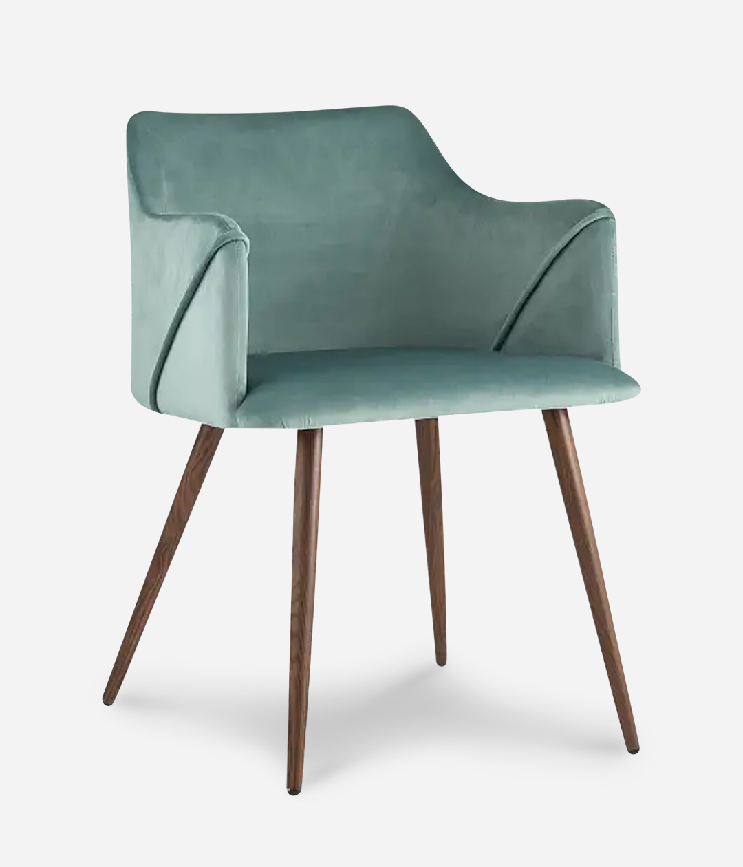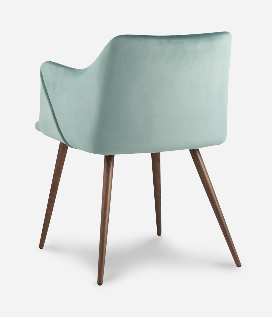 Мягкий стул для кухни с комфортной спинкой и подлокотниками, ножки металлические с принтом под дерево.
