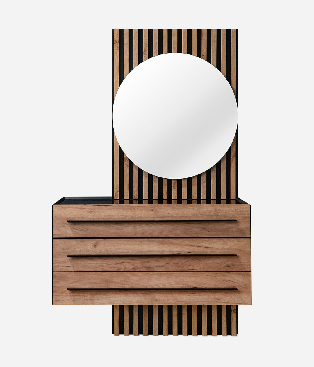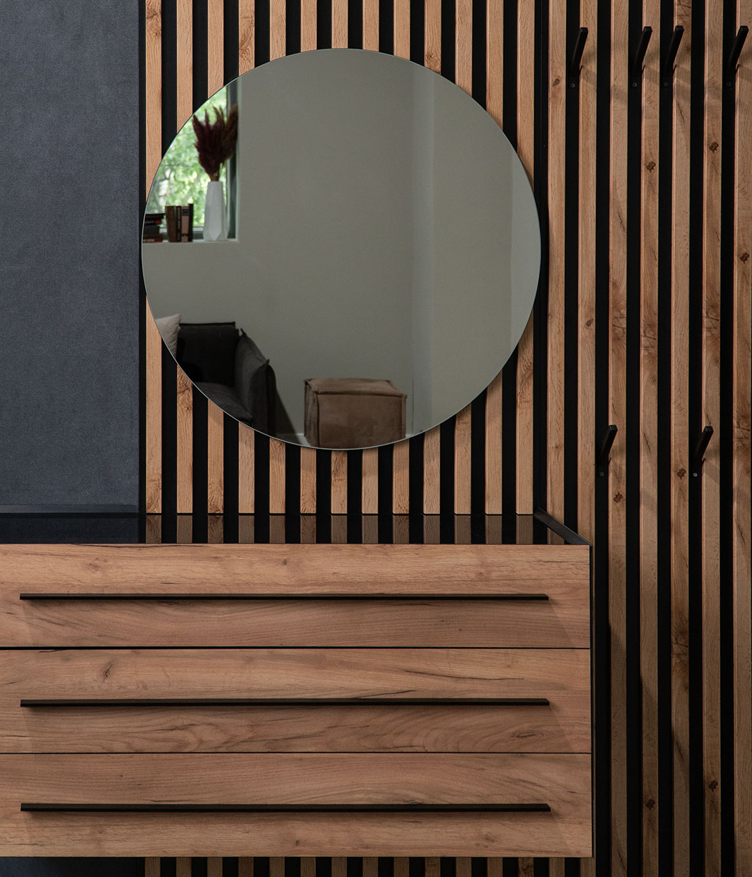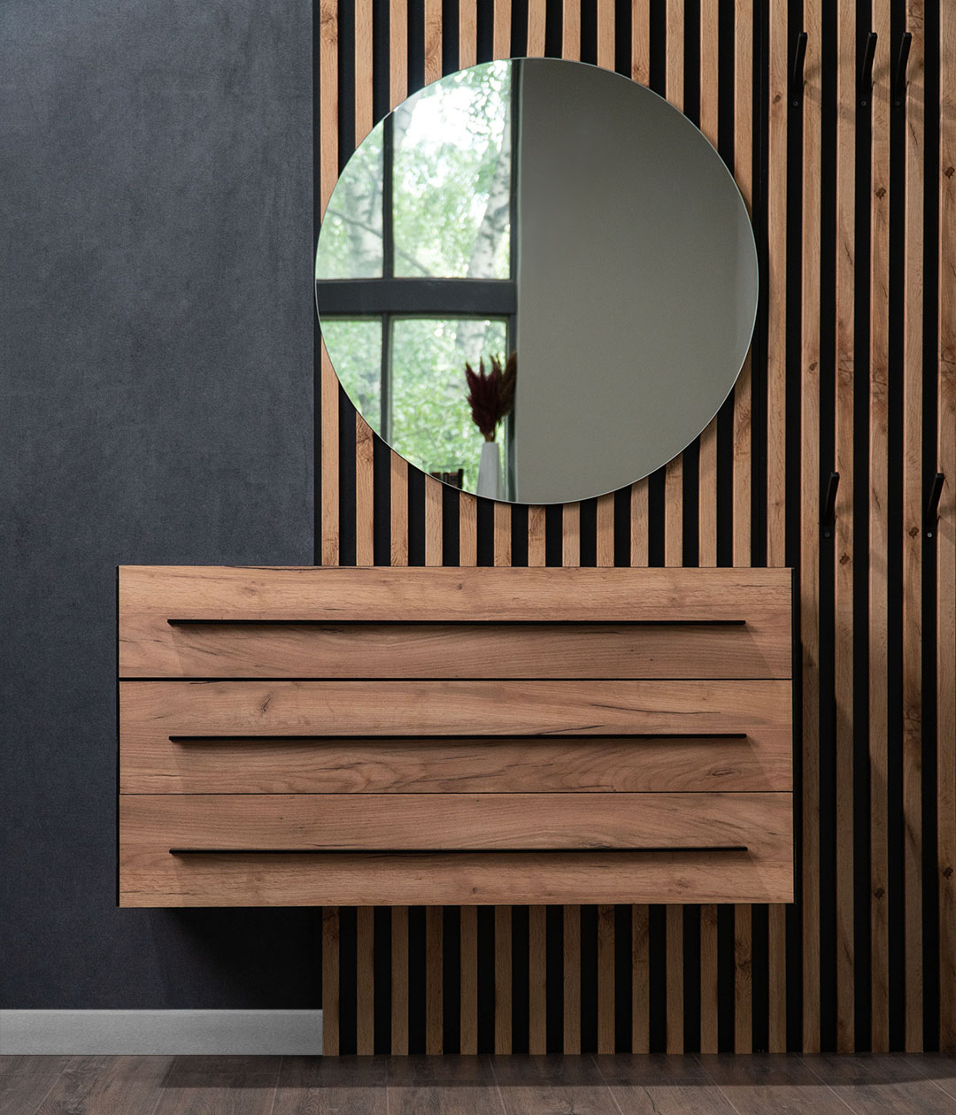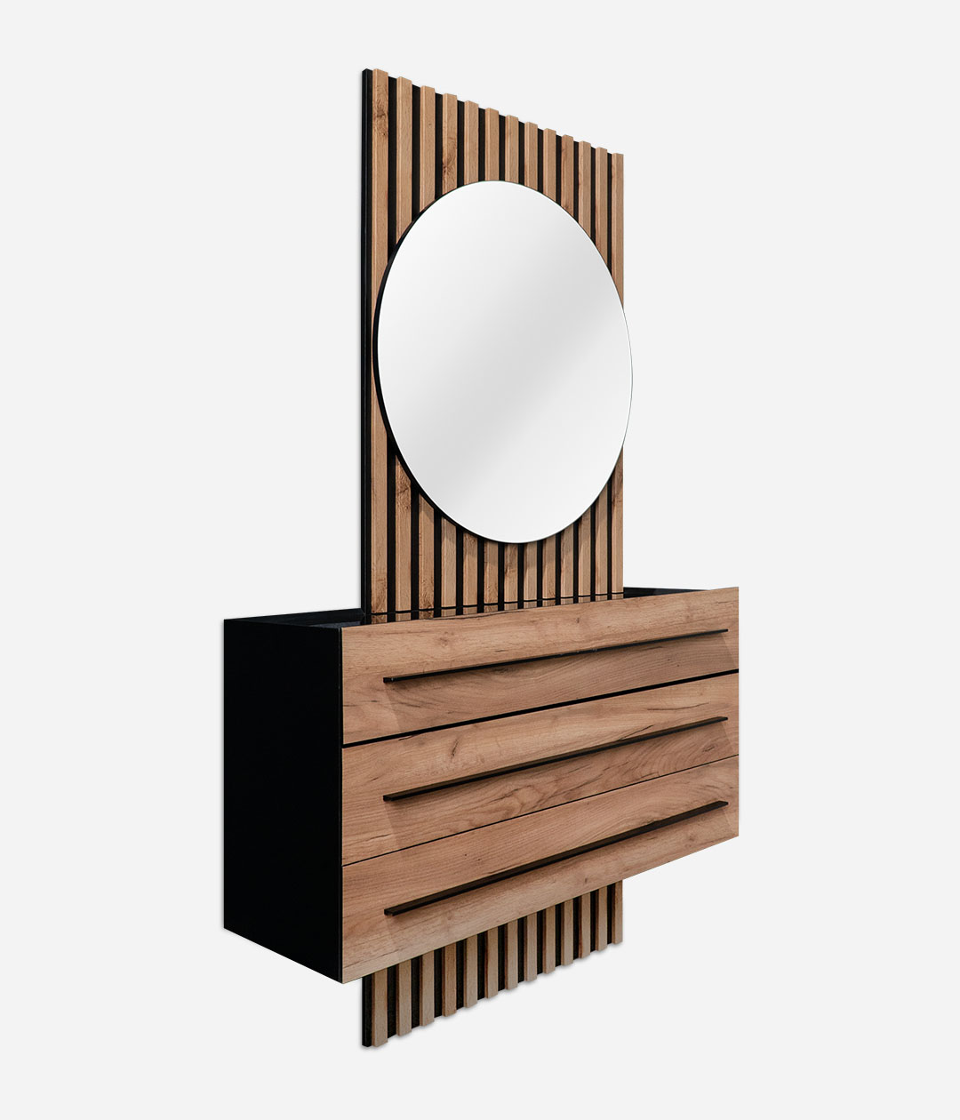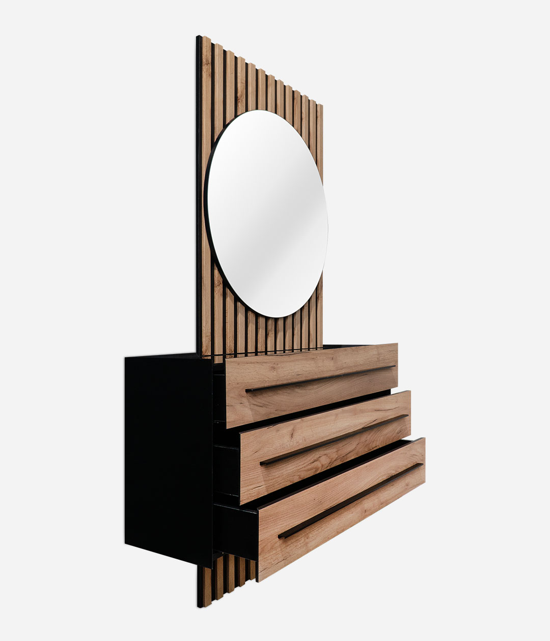 Тумба с зеркалом левая Неаполь функционально дополнит интерьер в стиле лофт и поможет в поддержании порядка. Круглое зеркало, закрепленное на вертикальной стенке, визуально добавит пространство, а тумба с 3-мя выдвижными ящиками поможет в организации порядка.
